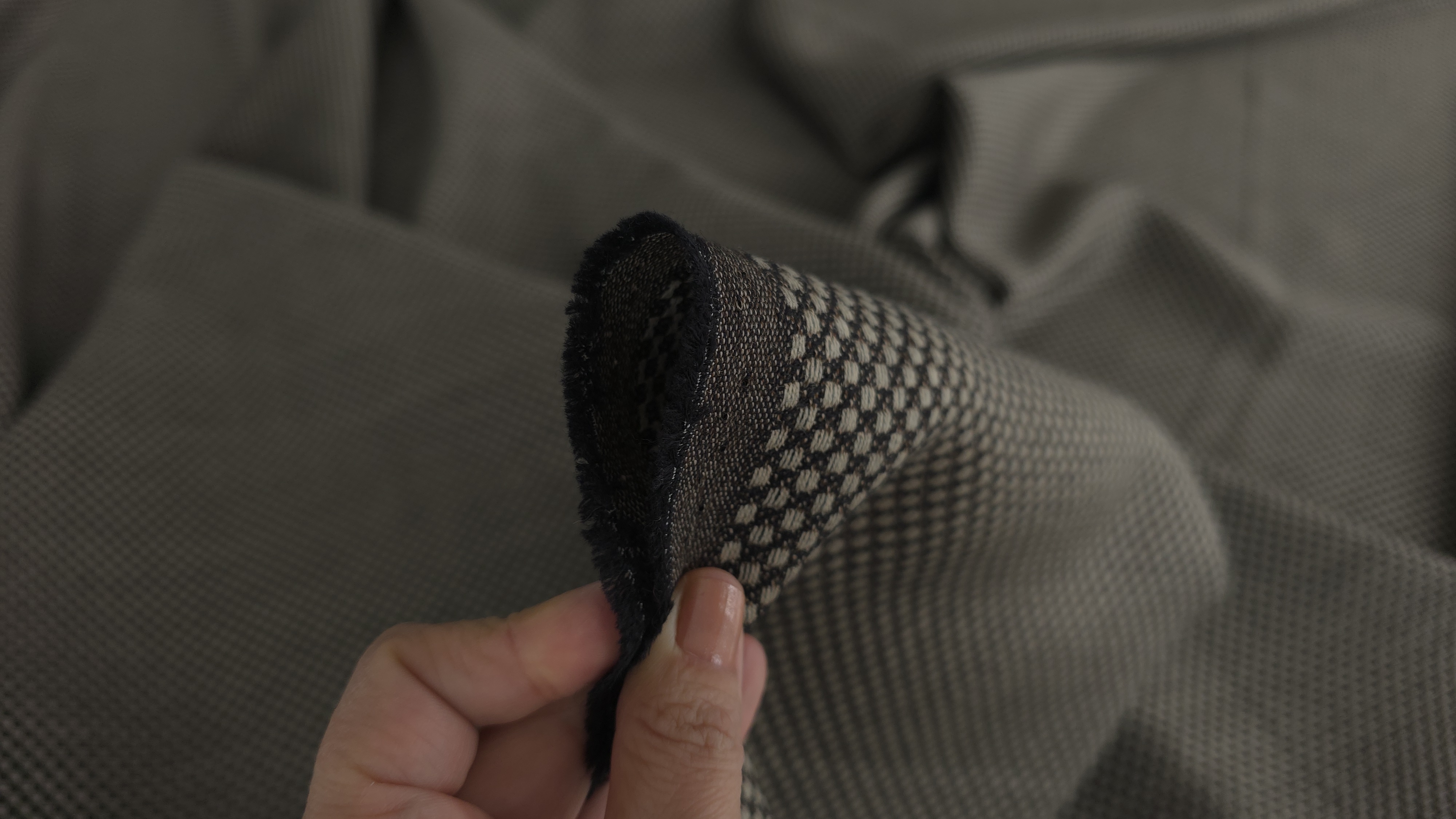 Căderea este controlată și constantă. Stofa se așază bine pe liniile tiparului. Nu creează volum neuniform. Textura rămâne constantă în utilizare. Materialul nu este elastic. Marginile sunt curate și stabile la tăiere. Se lucrează ușor la croi. Cusăturile se execută precis și curat. Țesătura nu se destramă ușor. Structura densă oferă rezistență în timp. Suprafața nu prezintă variații vizibile de grosime. Modelul discret contribuie la un aspect echilibrat. Culoarea gri antracit oferă versatilitate în utilizare. Tonurile bej adaugă profunzime vizuală. Materialul își păstrează aspectul ordonat la purtare.