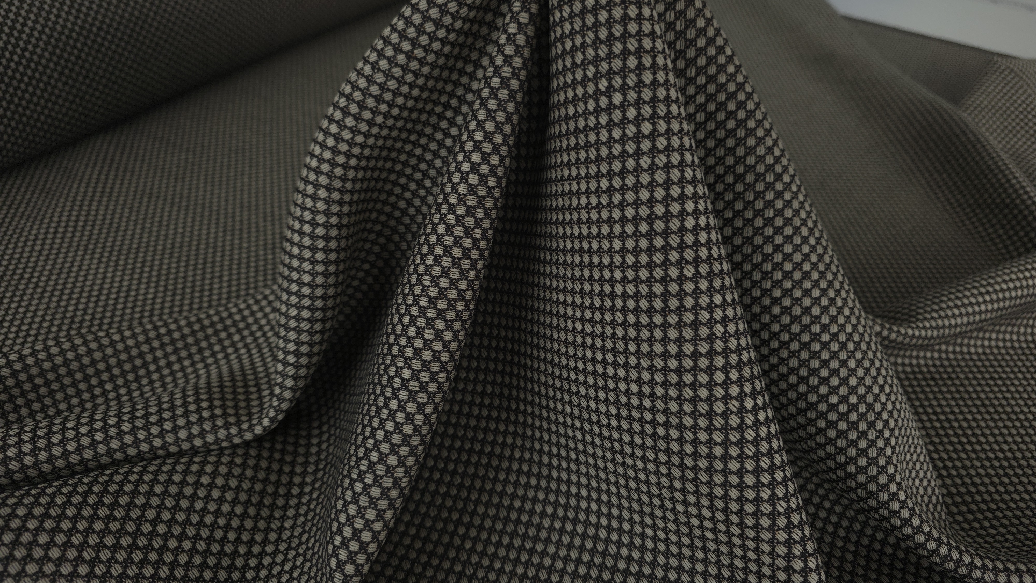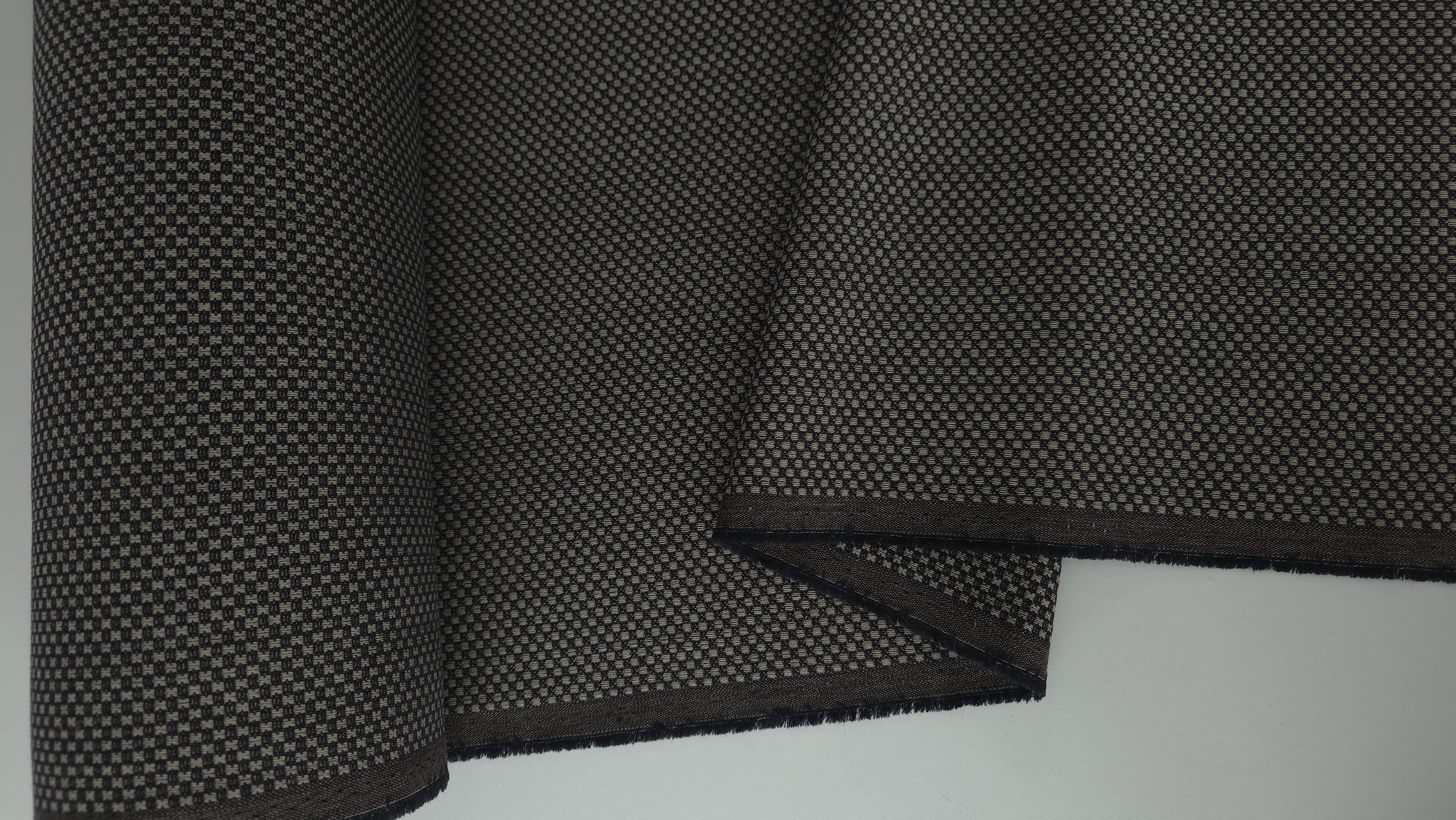 Această stofă este realizată integral din lână virgină, având o construcție densă și bine echilibrată. Țesătura prezintă un desen fin, repetitiv, cu efect optic discret. Structura materialului este stabilă și coerentă pe întreaga lățime. Suprafața este uniformă și bine definită. Lâna virgină asigură confort termic natural și respirabilitate bună. Materialul păstrează căldura fără a crea rigiditate excesivă. Ținuta este corectă și susține croiuri structurate.