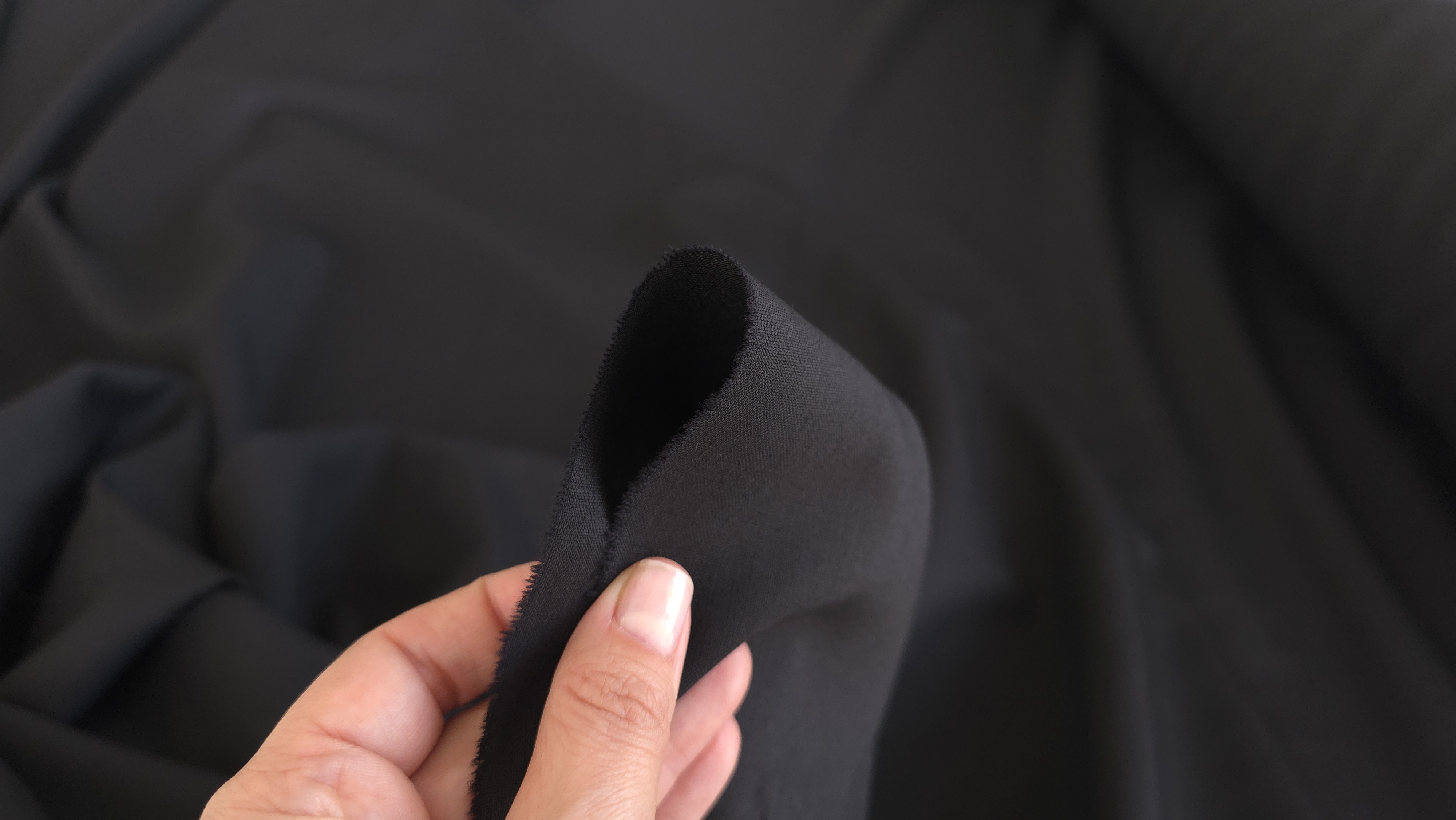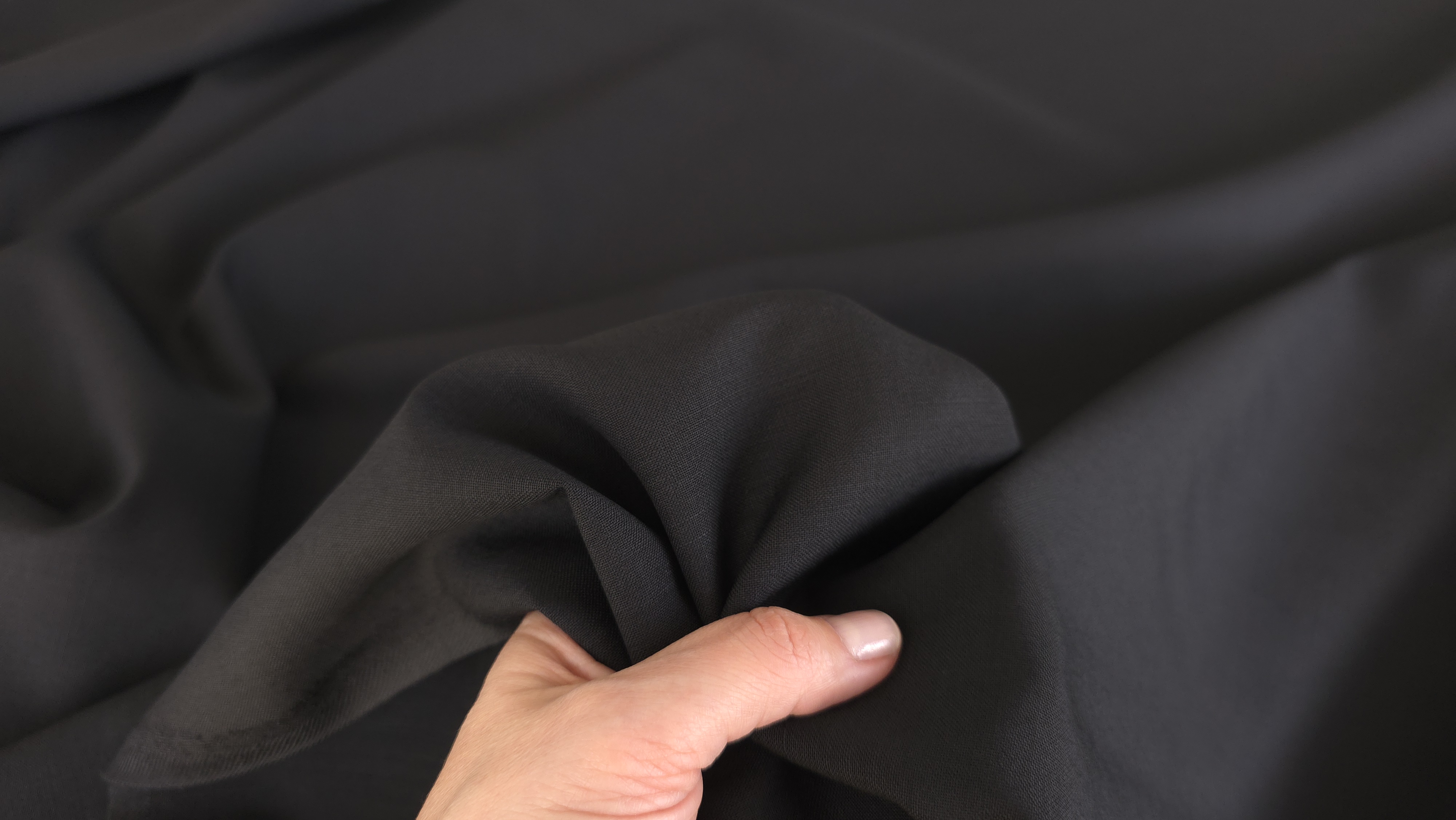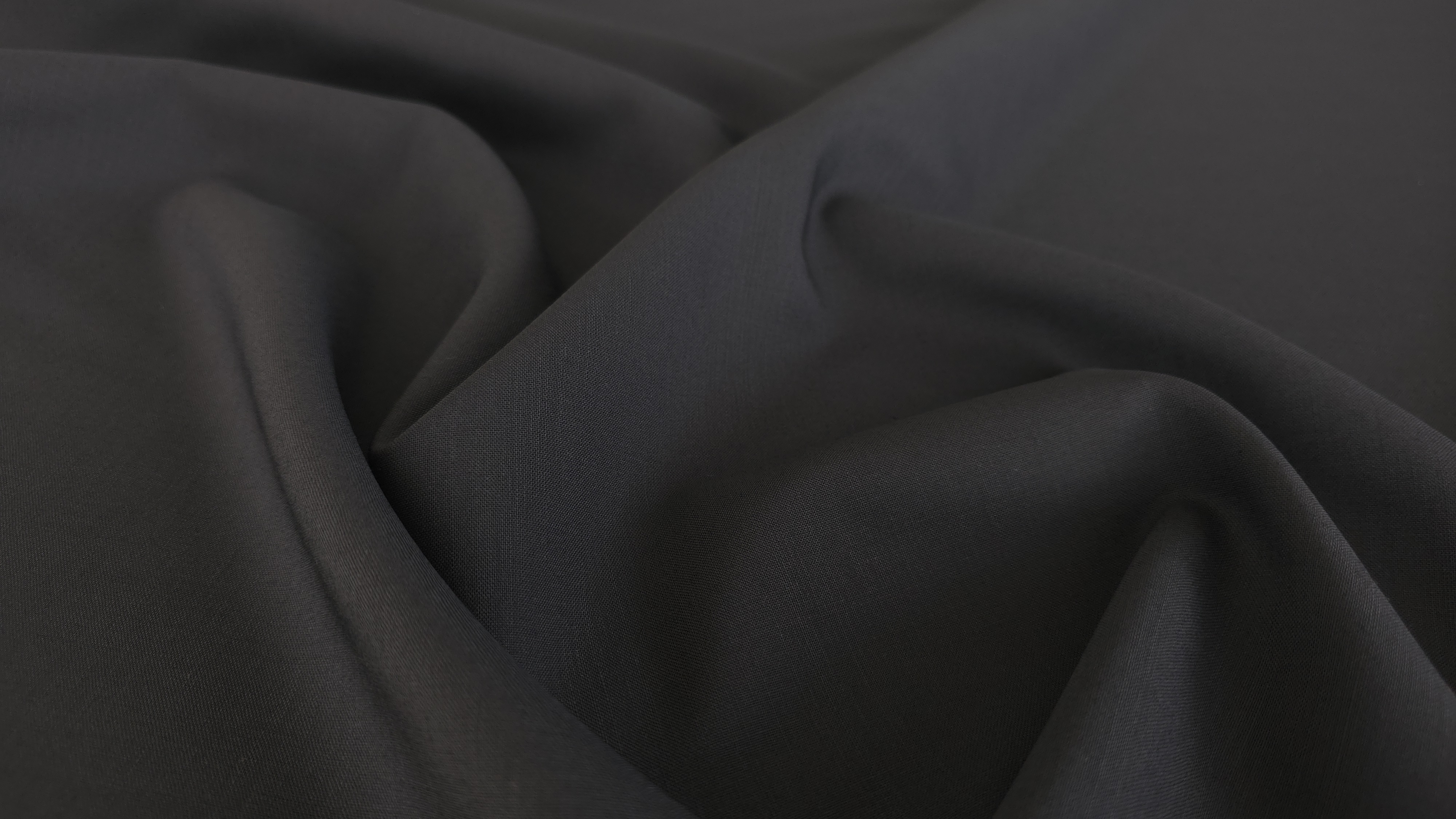 Stofa din lana neagra pentru costume, cu textură fină și aerisită. Face parte din colecția <strong>Eveline Textile</strong>, dedicată țesăturilor premium pentru costume și rochii elegante.