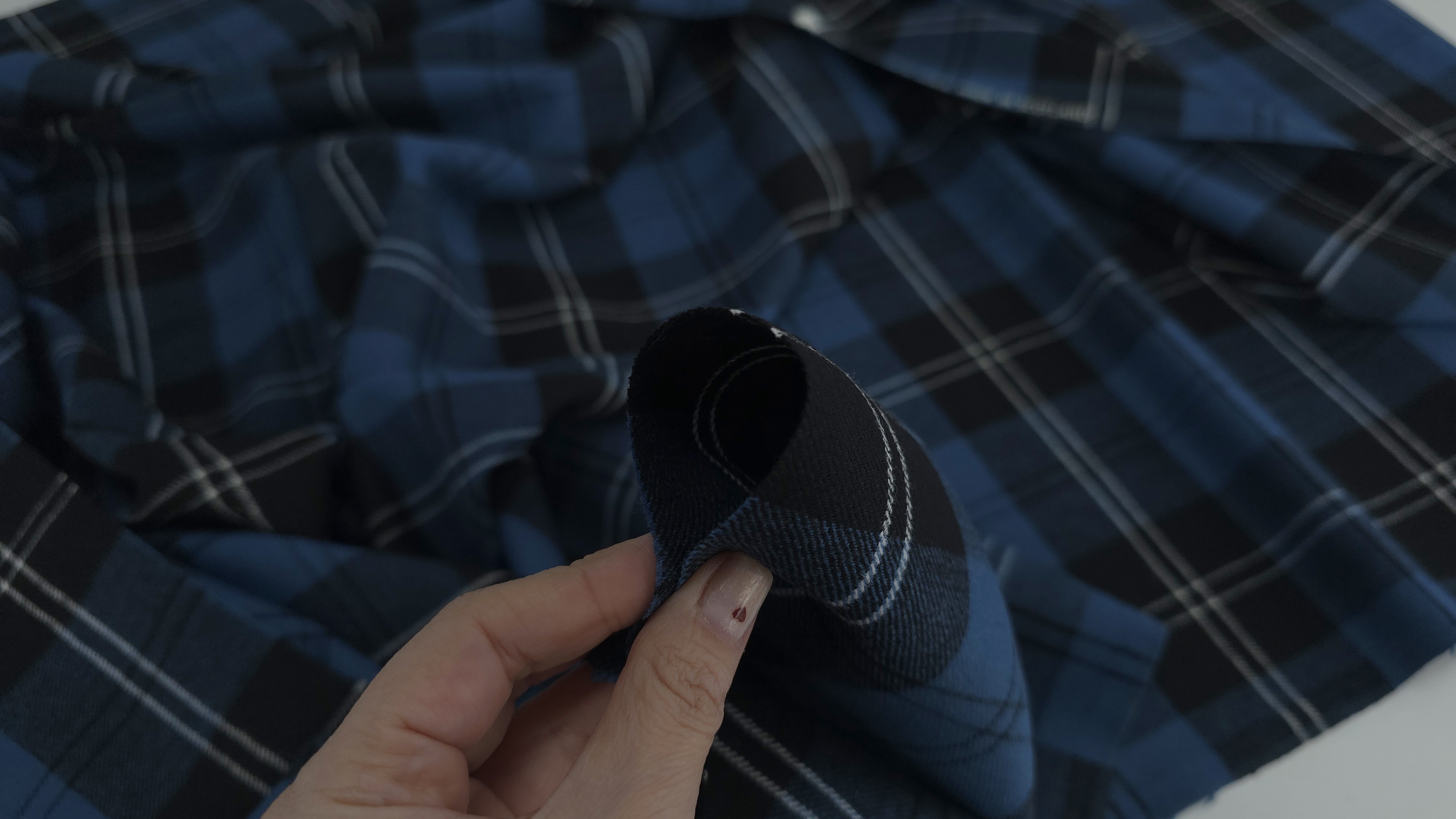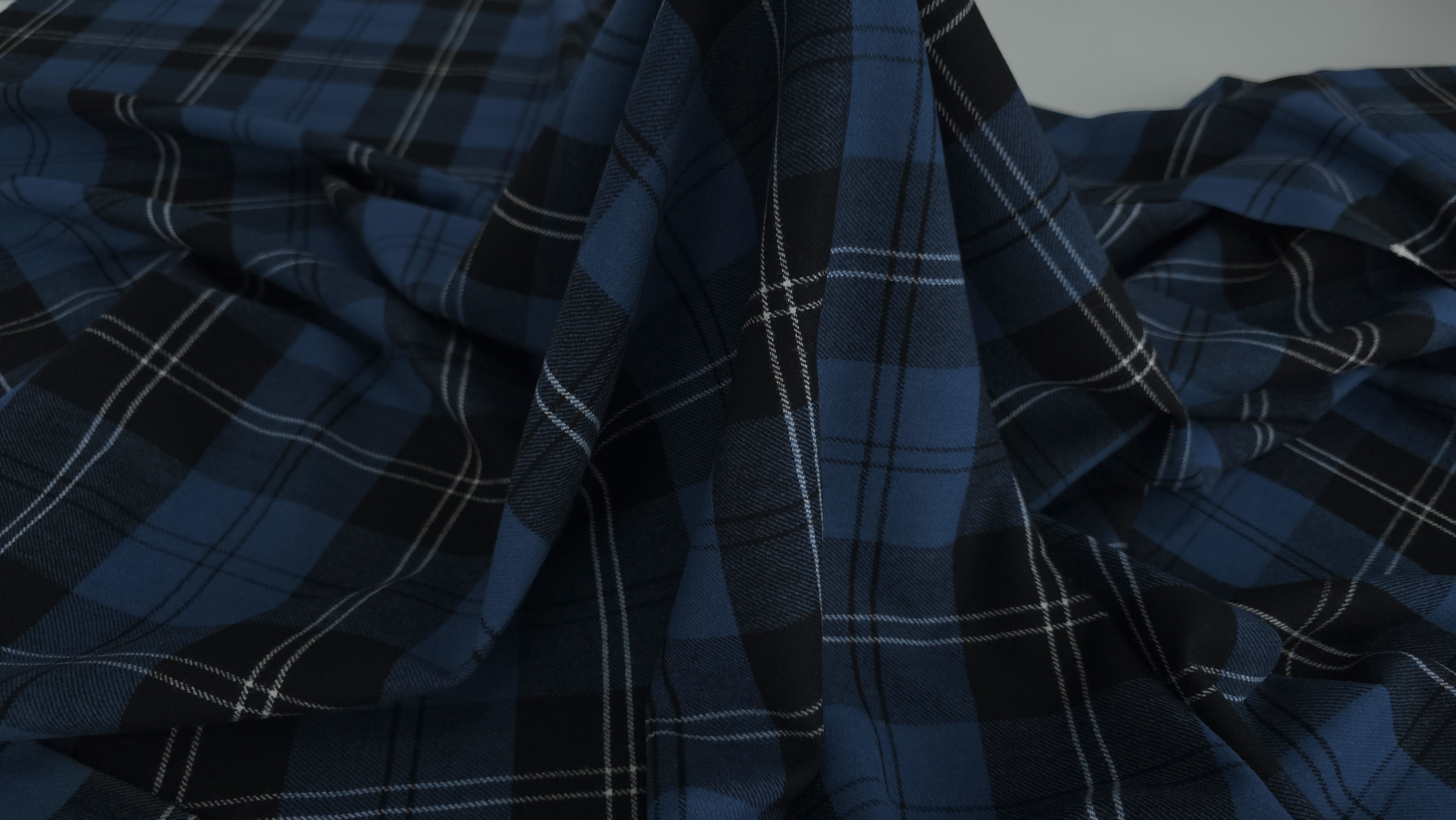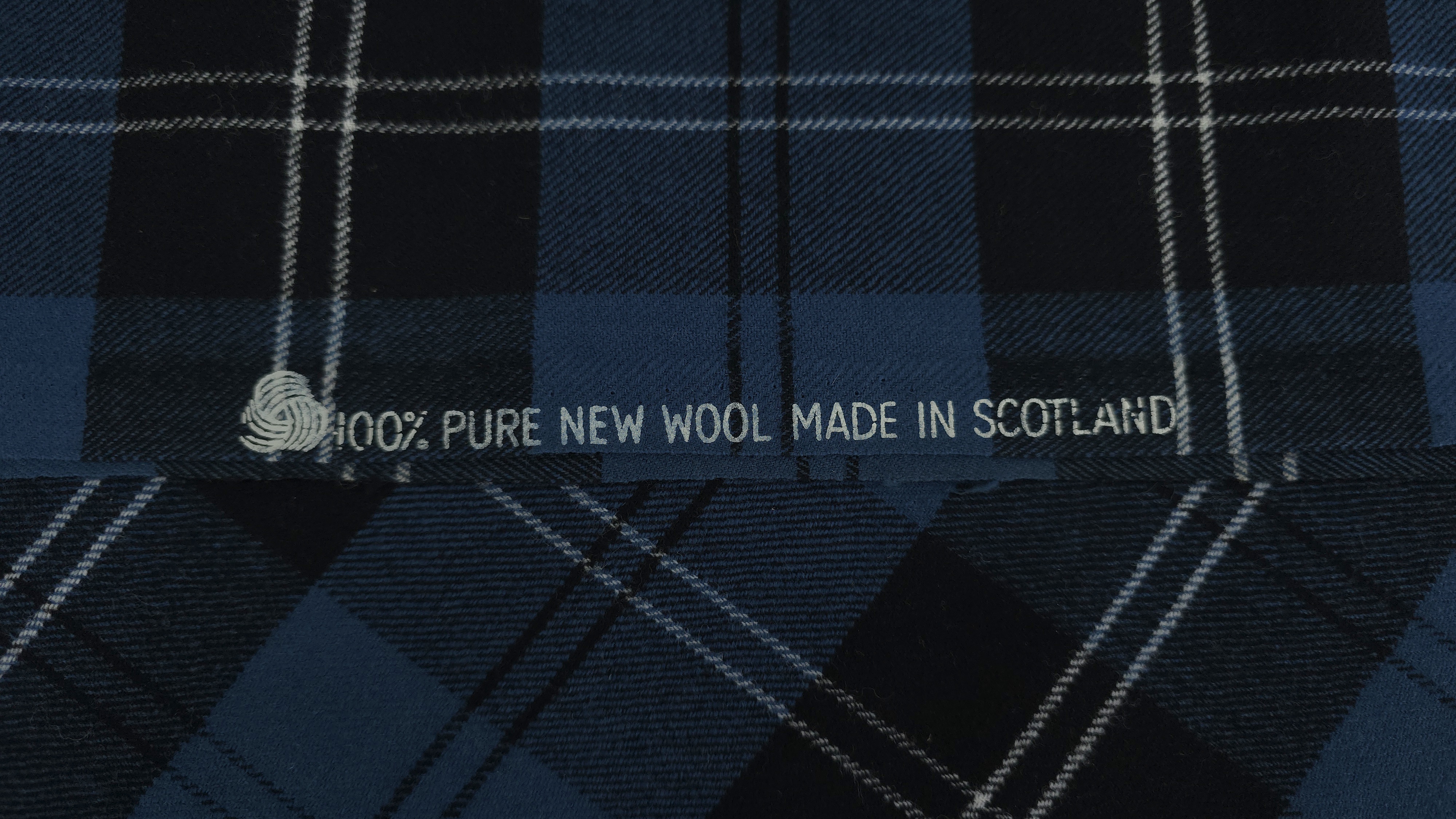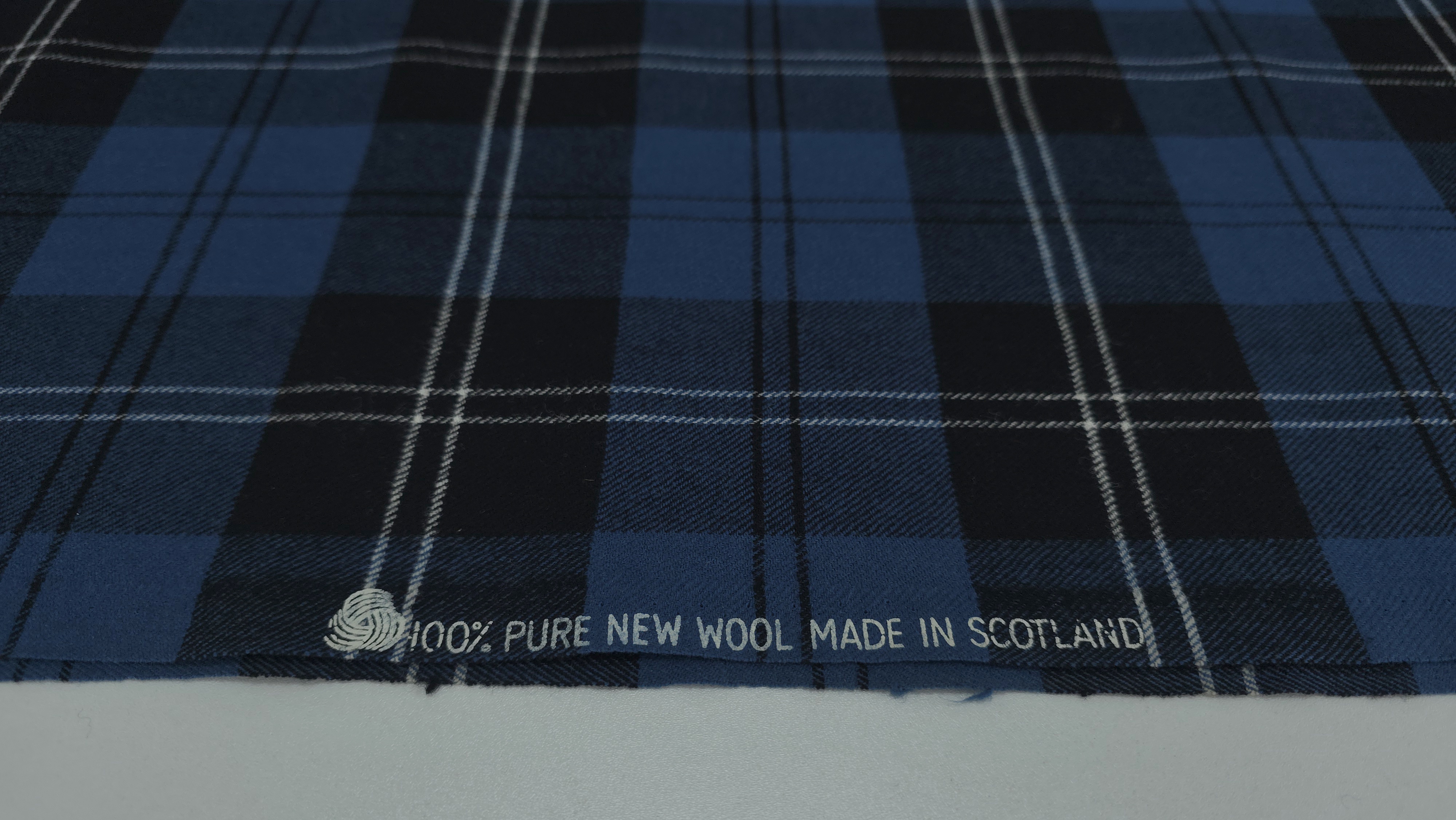 Această stofă este realizată integral din lână pură, provenită din tradiția textilă scoțiană, recunoscută pentru consistență și control al calității. Țeserea este compactă și bine definită, cu un desen clasic în carouri, construit din alternanțe de bleumarin profund și negru, accentuate de linii subțiri deschise.