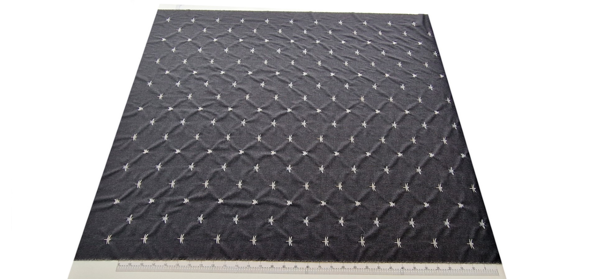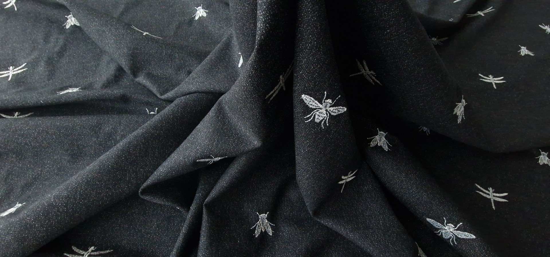 Stofa neagra din lana brodata model Dragonflies, fara elastan, subtire, foarte placuta la atingere, ideala pentru realizarea costumelor.
