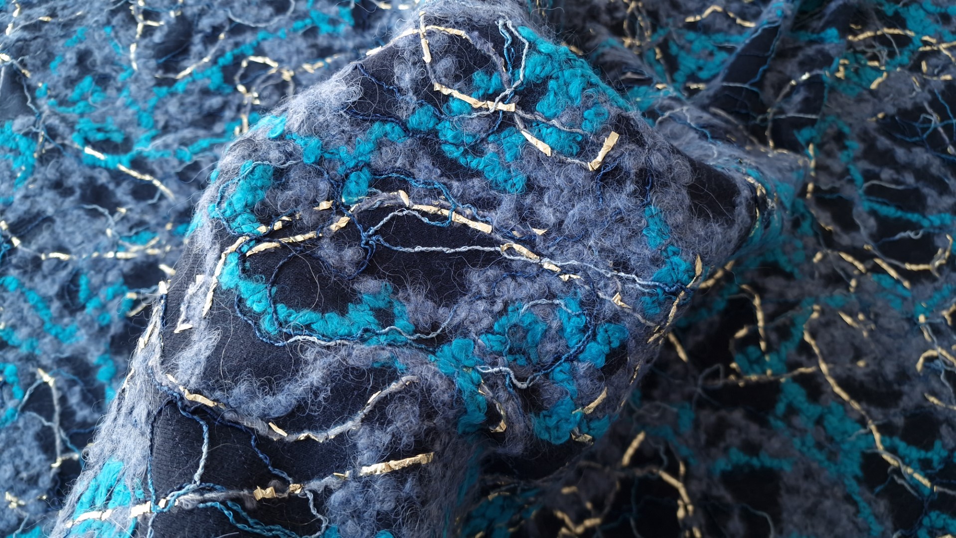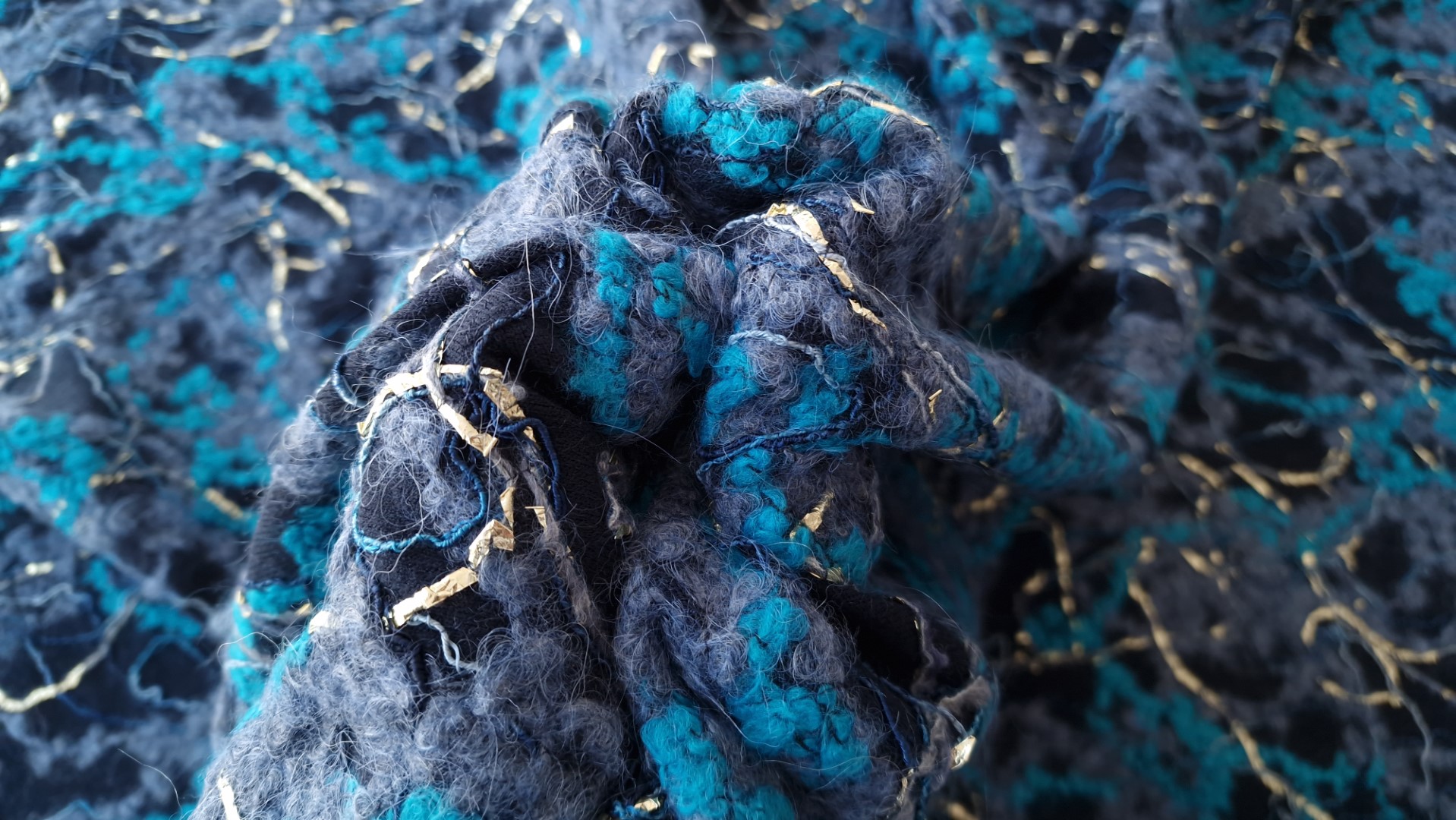 Stofa groasa impletita cu lana si insertii fir metalizat, textura placuta la atingere si purtare, foarte calduroasa.