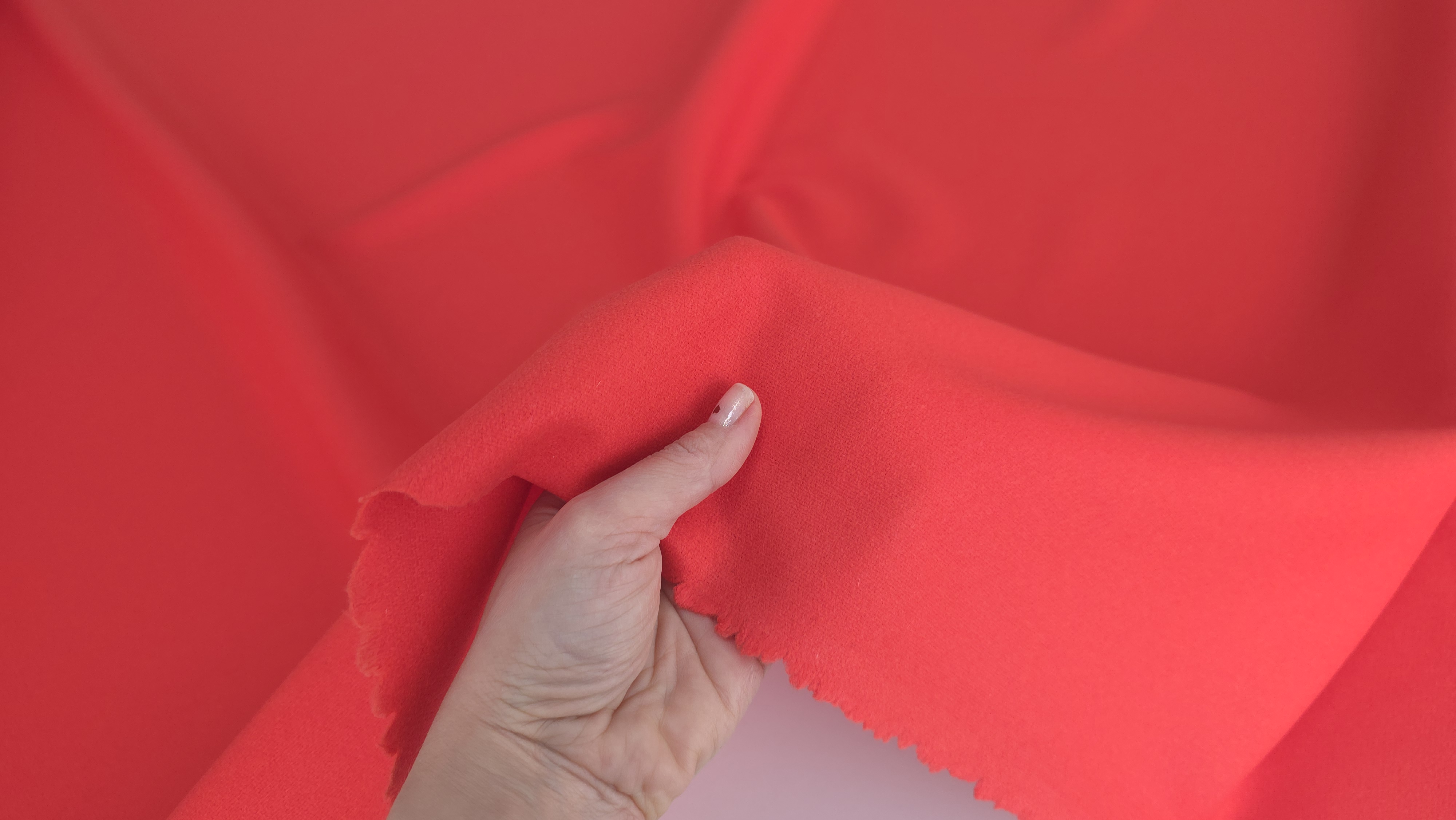 Stofa orange coral din lână și cașmir VAL1003, cu structură medie, destinată confecțiilor vestimentare care necesită stabilitate, comportament controlat și o compoziție naturală cu performanță tehnică ridicată.
