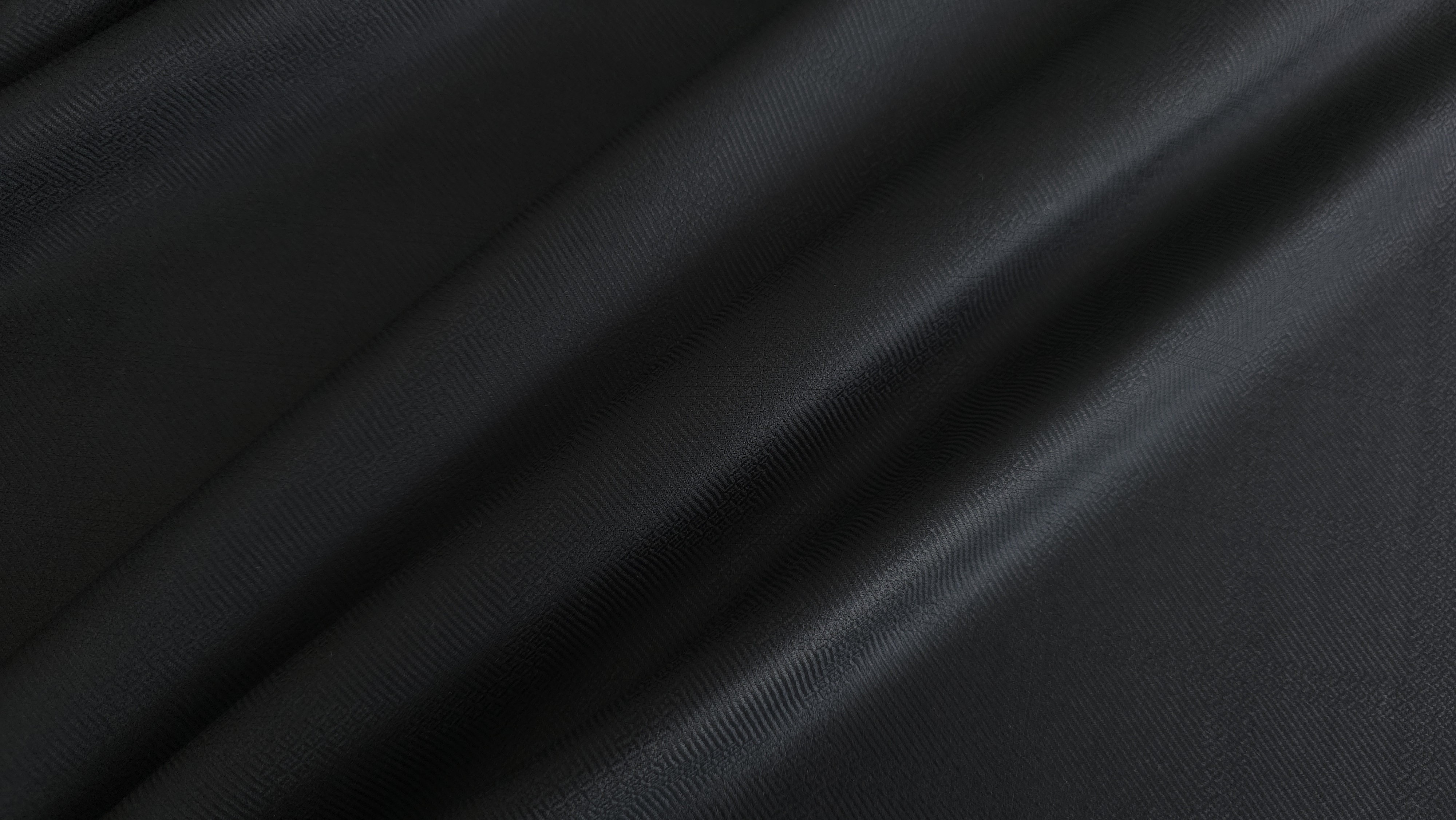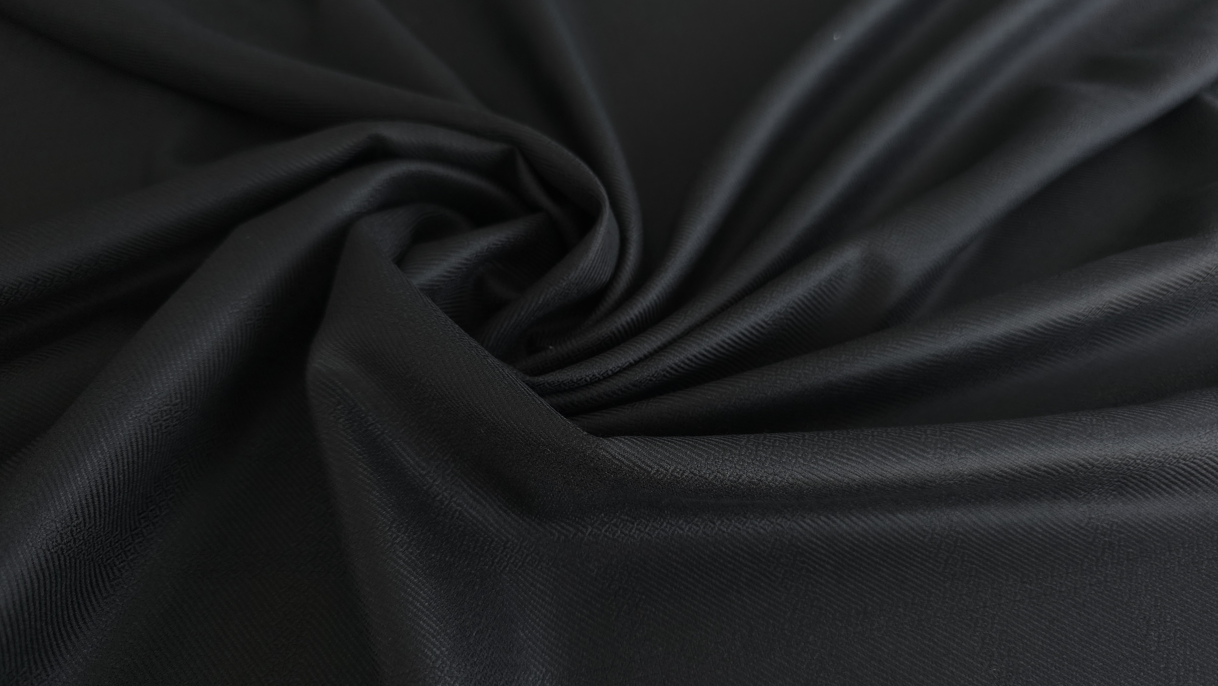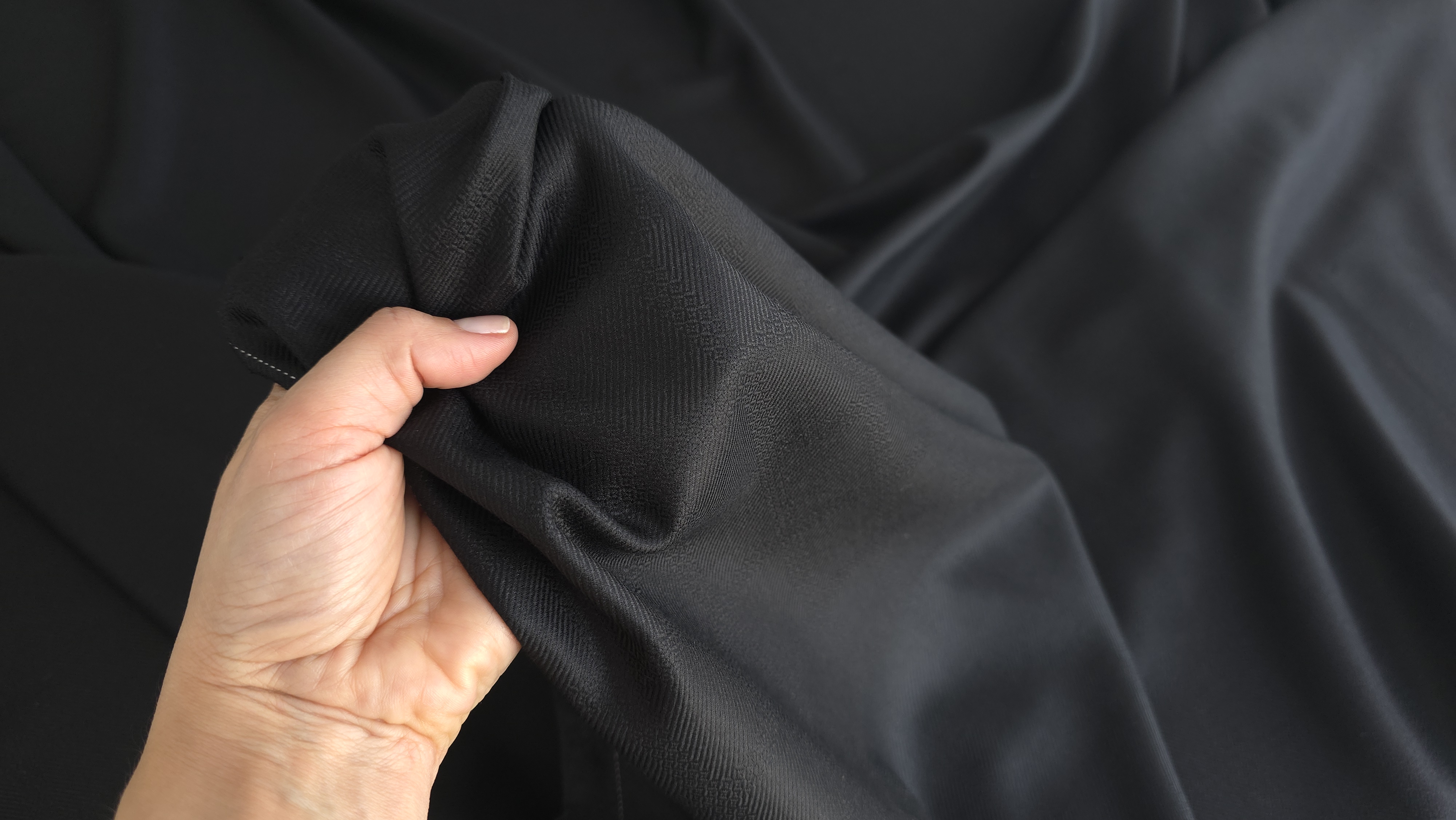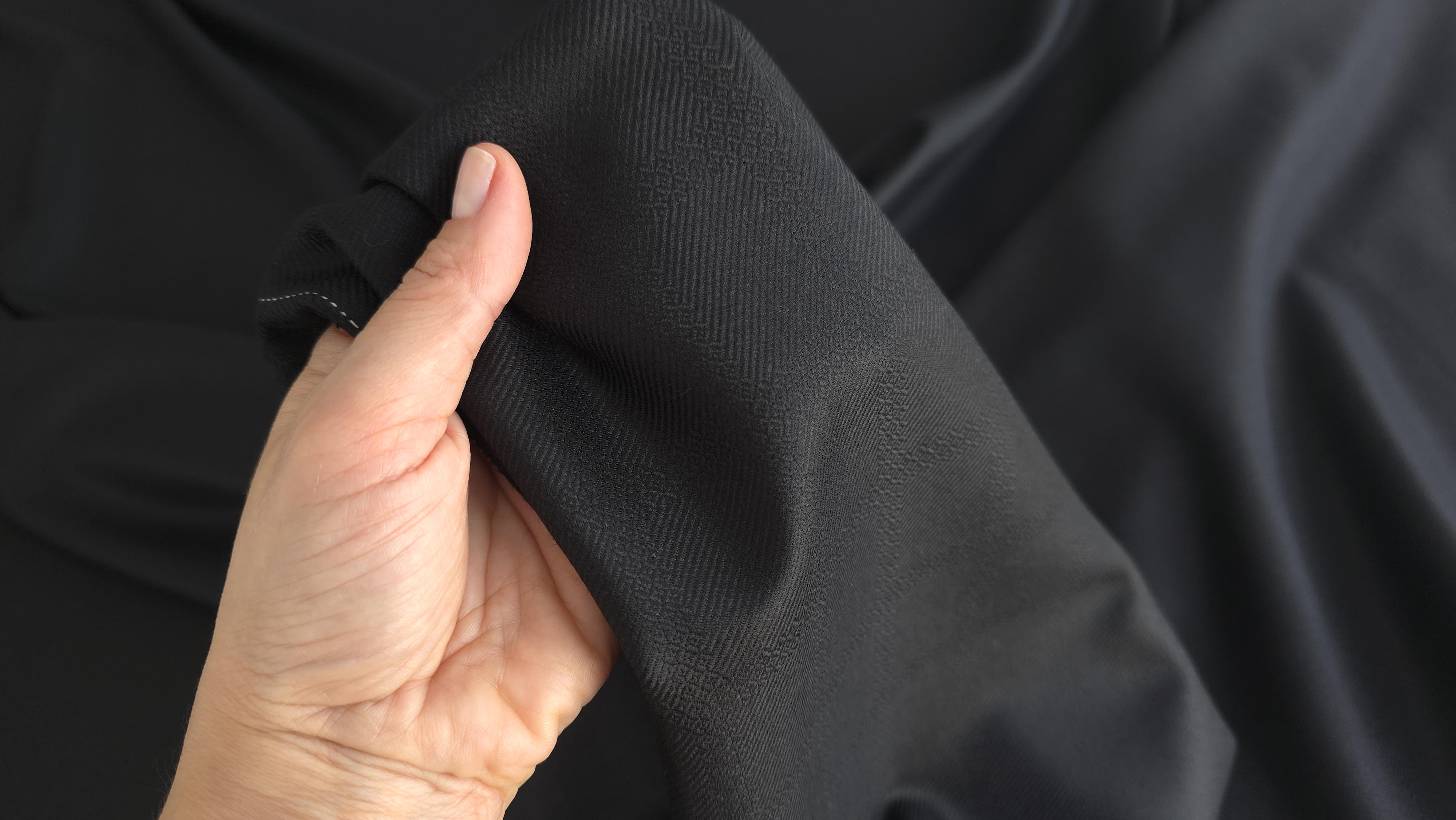 Acest material este o stofă subțire și elegantă din cașmir 100%, într-o nuanță de negru intens, premium, cu o textură de tip micro-pattern. Modelele discrete prezente în țesătură sunt foarte fine, abia sesizabile, dar oferă un efect vizual sofisticat. Aceste micro-structuri sunt specifice țesăturilor destinate costumelor luxoase și sacourilor care cer un plus de personalitate fără a ieși în evidență prin contrast.