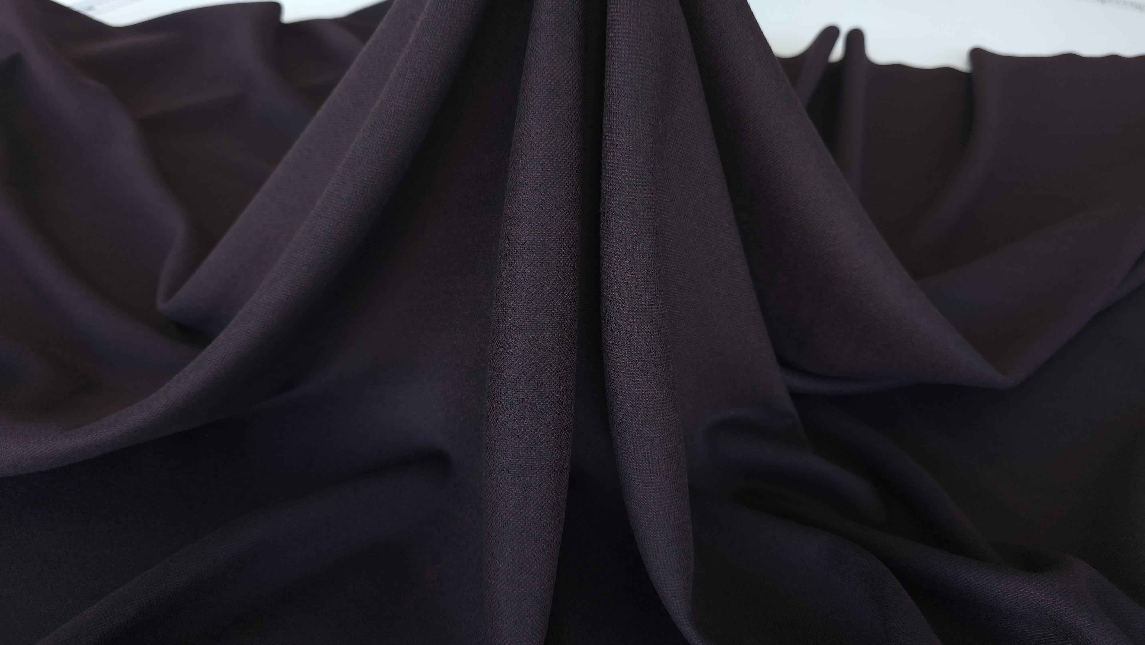 Această stofă burgundy cu un conținut excepțional de 82% cașmir reprezintă una dintre cele mai luxoase variante disponibile pentru piese de iarnă. Combinația între cașmir și lână virgină conferă materialului o atingere fină și o structură densă. Suprafața este moale, uniformă și elegantă, cu o textură subtilă ce reflectă lumina într-un mod delicat. Căderea este fluidă, controlată și perfectă pentru creații premium.