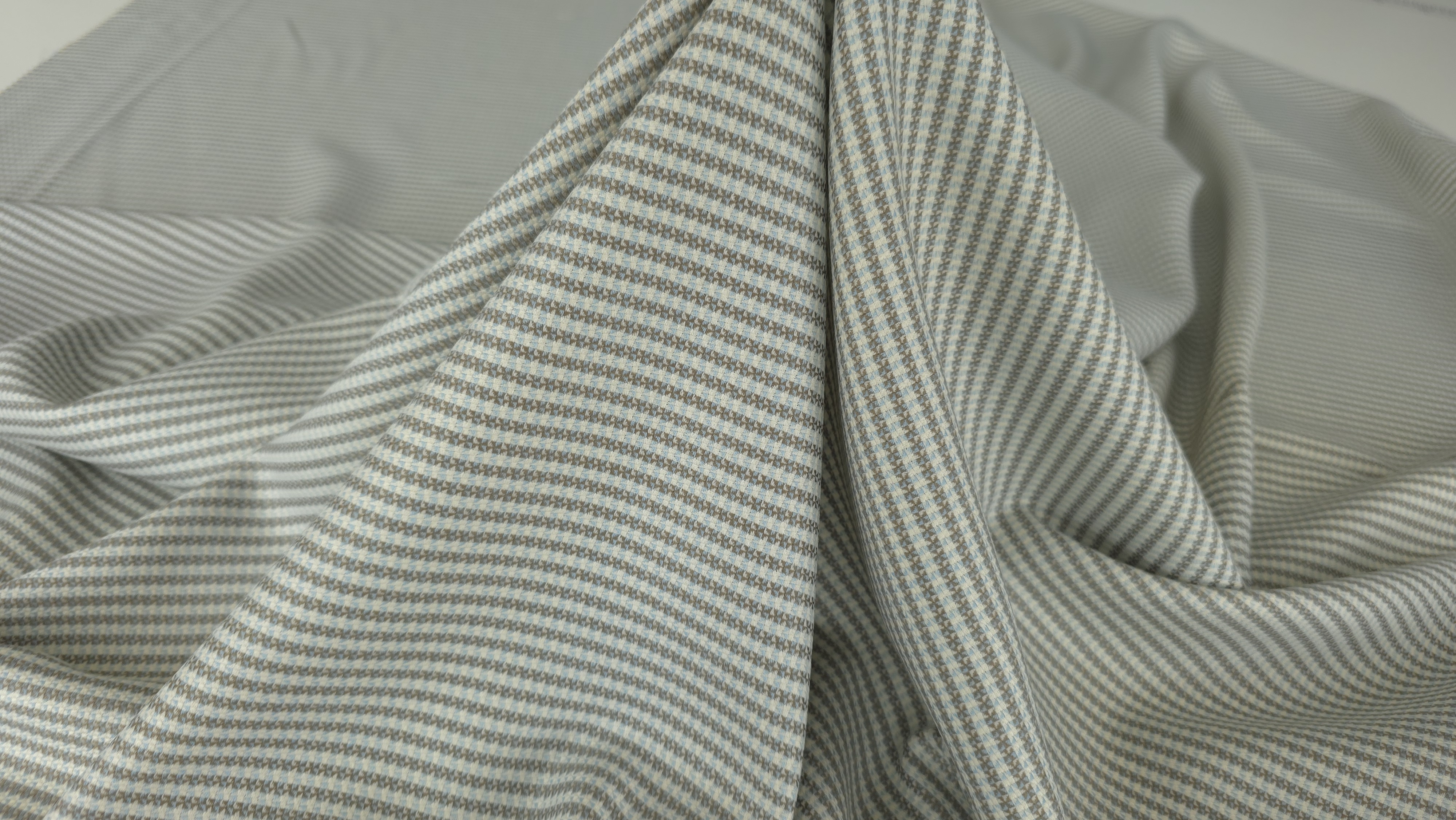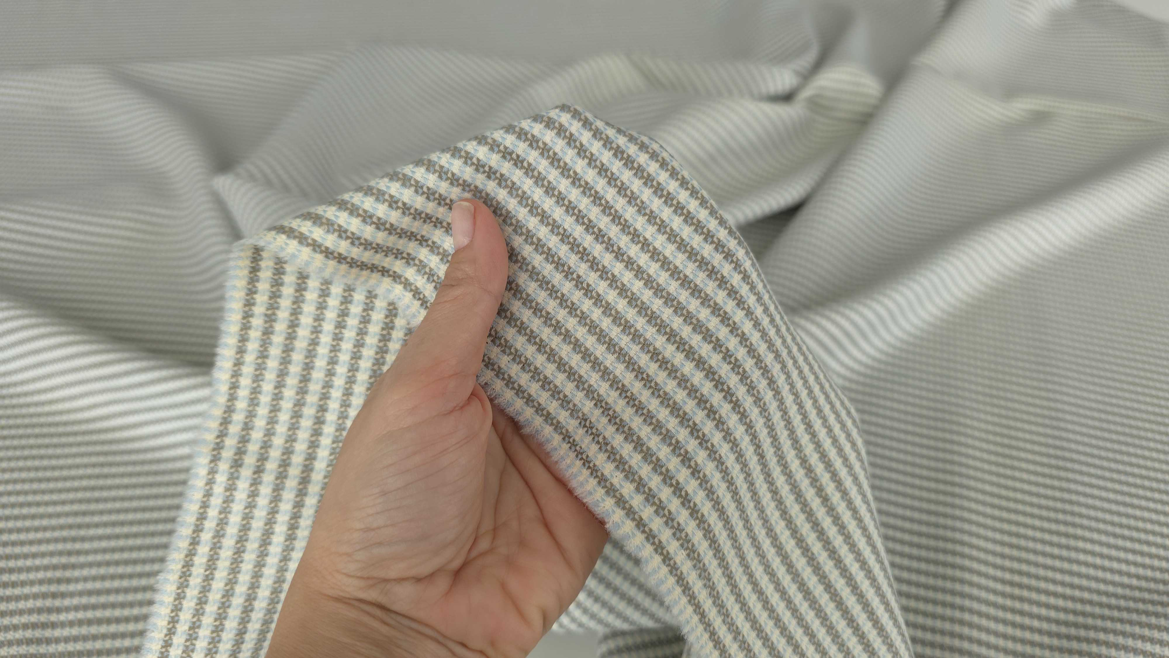Culoarea gri-crem-bleu este modernă și ușor de integrat în garderoba contemporană. Nuanțele pastelate se combină armonios și creează un efect elegant, discret și versatil. Acest mix permite folosirea materialului într-o gamă variată de proiecte, de la piese clasice la ținute moderne.