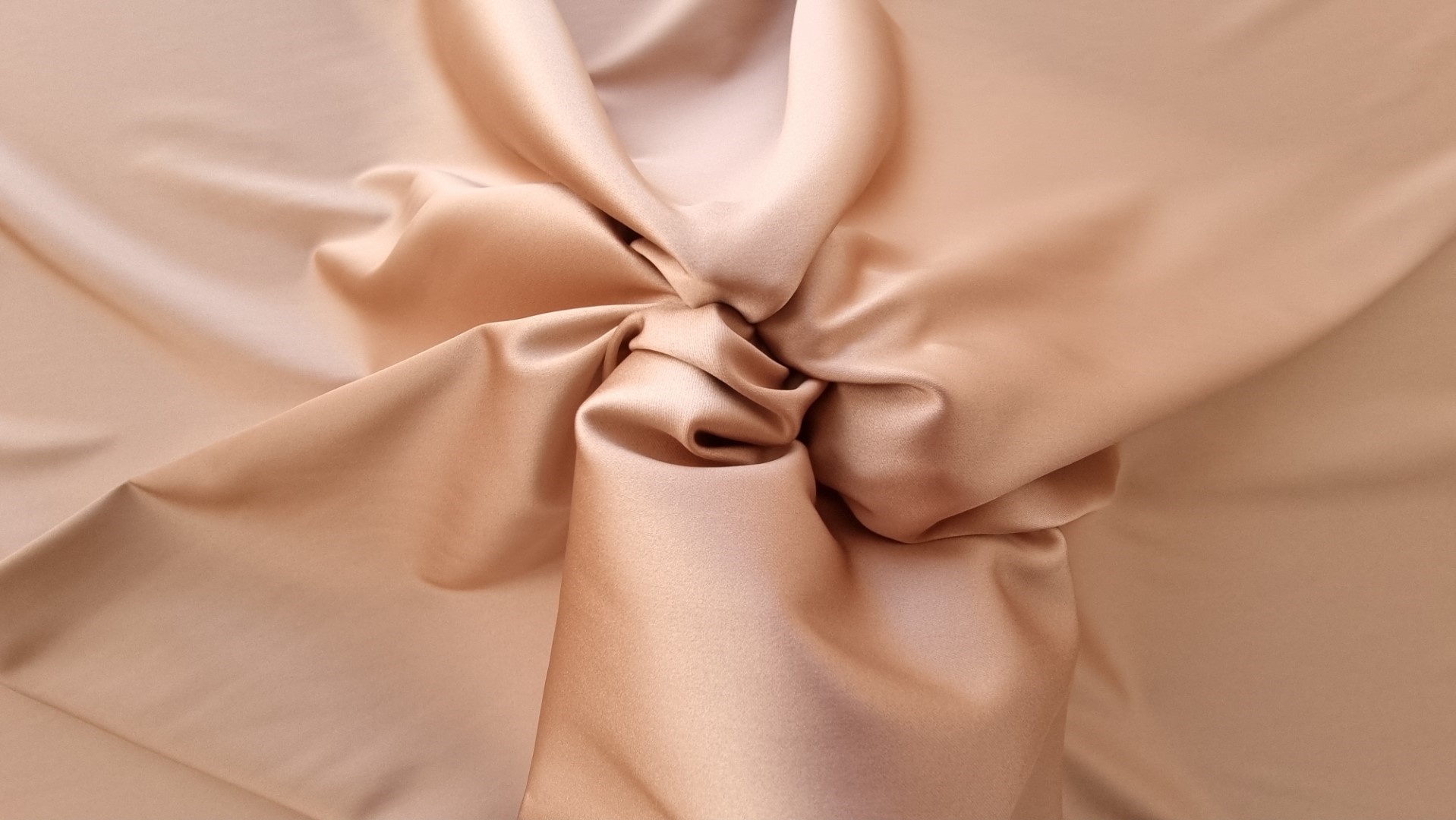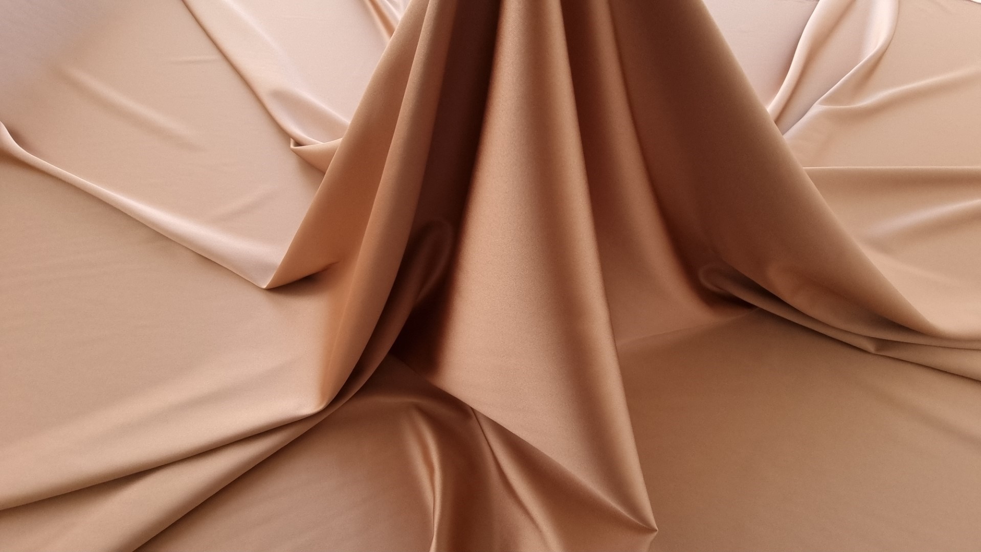 Tafta subtire elastica camel Selin are toate caracteristicile necesare pentru a fi demna de covorul rosu. Este o tesatura rafinata, de inalta calitate, cu luciu discret, cu tuseu moale, fin si “cadere” excelenta.