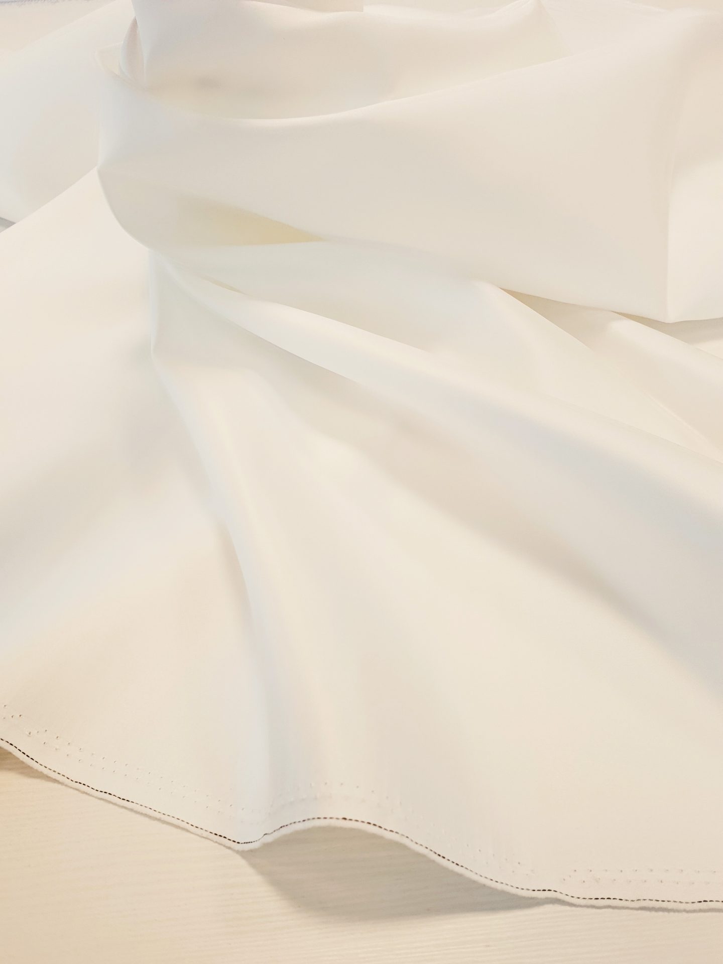 Tafta Duchesse ivory are o textura cu tinuta, fara elastan, pretabila pentru rochii de volum sau cele care au nevoie de un aspect rigid.