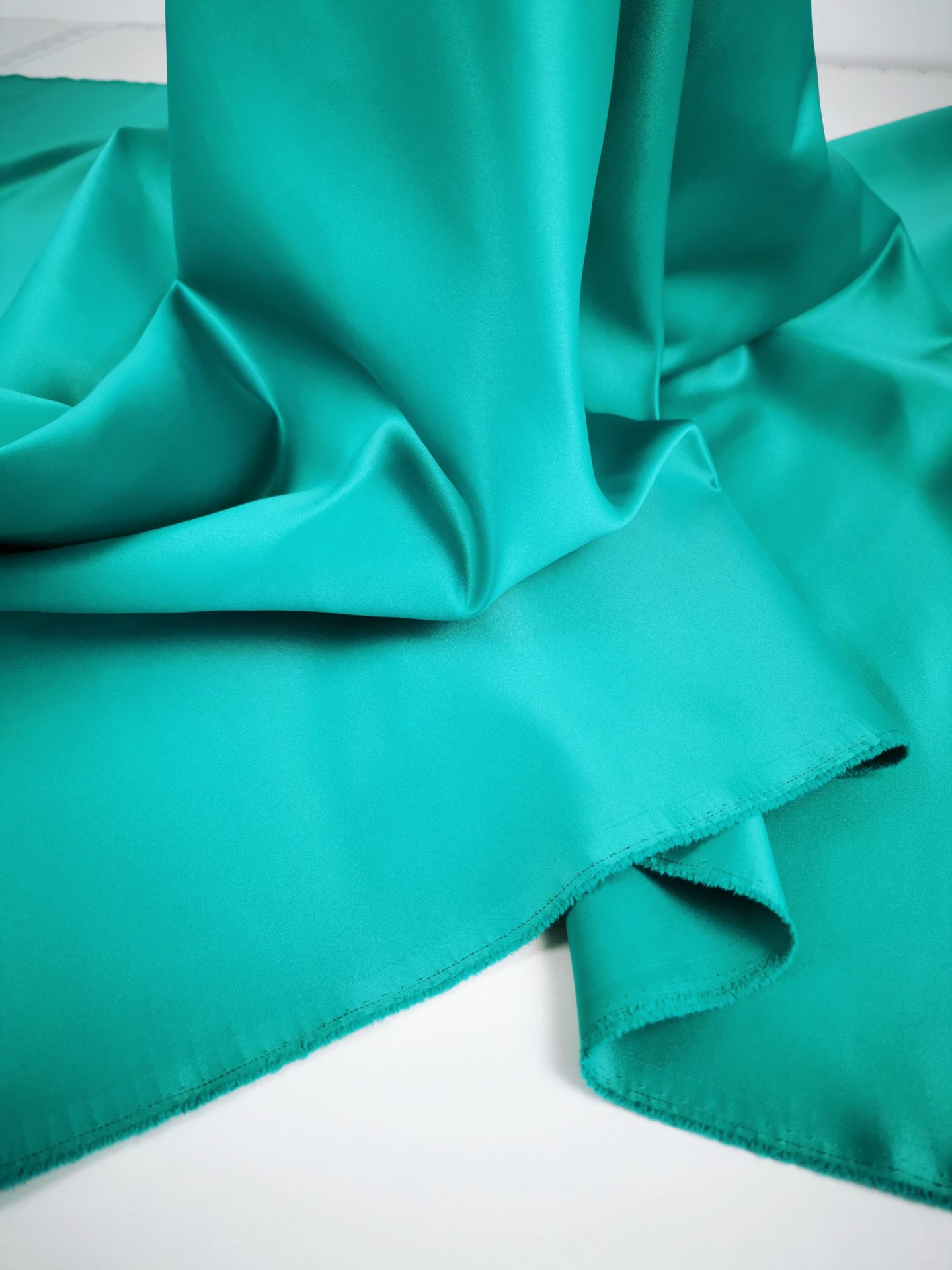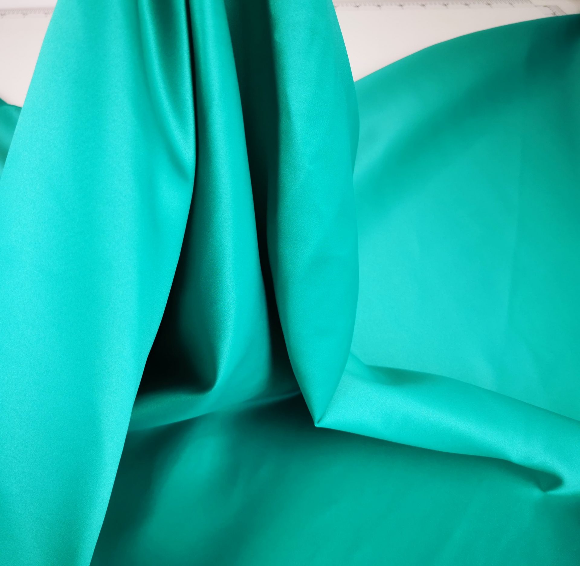 Tafta Duchesse verde turquoise are o textura cu tinuta, fara elastan, pretabila pentru rochii de volum sau cele care au nevoie de un aspect rigid.