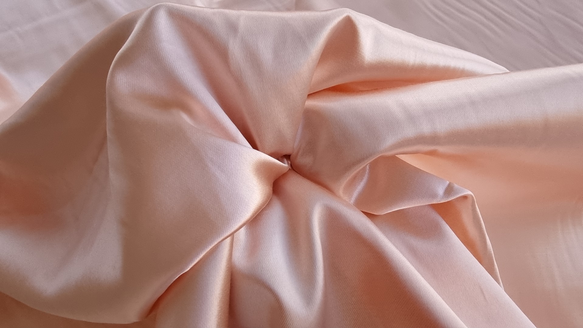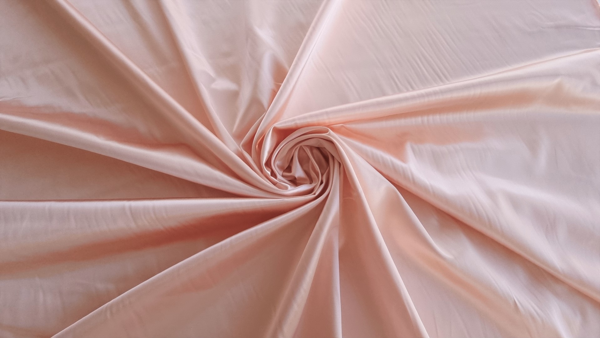 Tafta satinata din fibre naturala light peach, fara elastan, usor rigida, tesatura cu vascoza si bumbac, pretabila pentru rochii de volum sau cele care au nevoie de un aspect rigid.