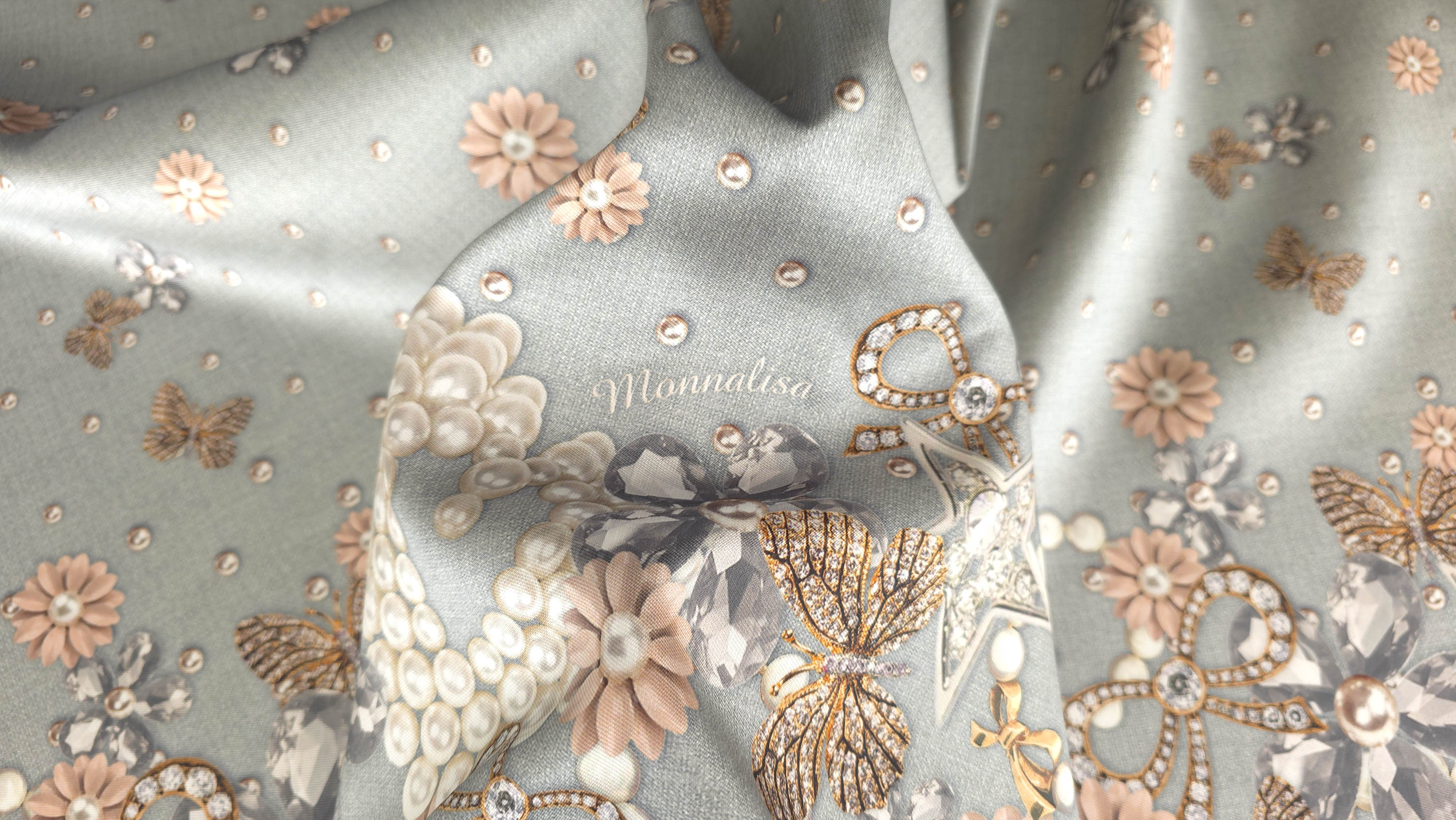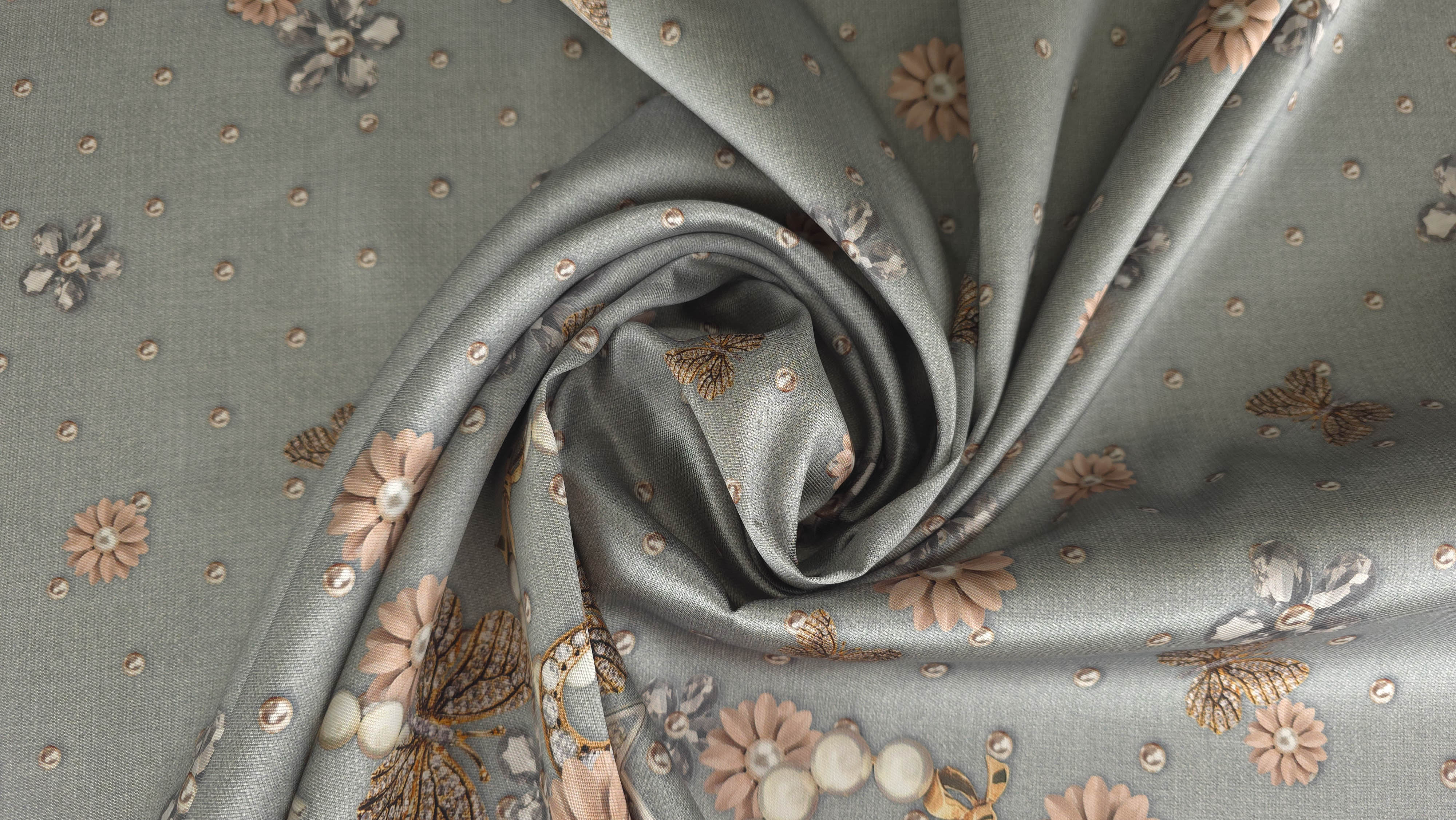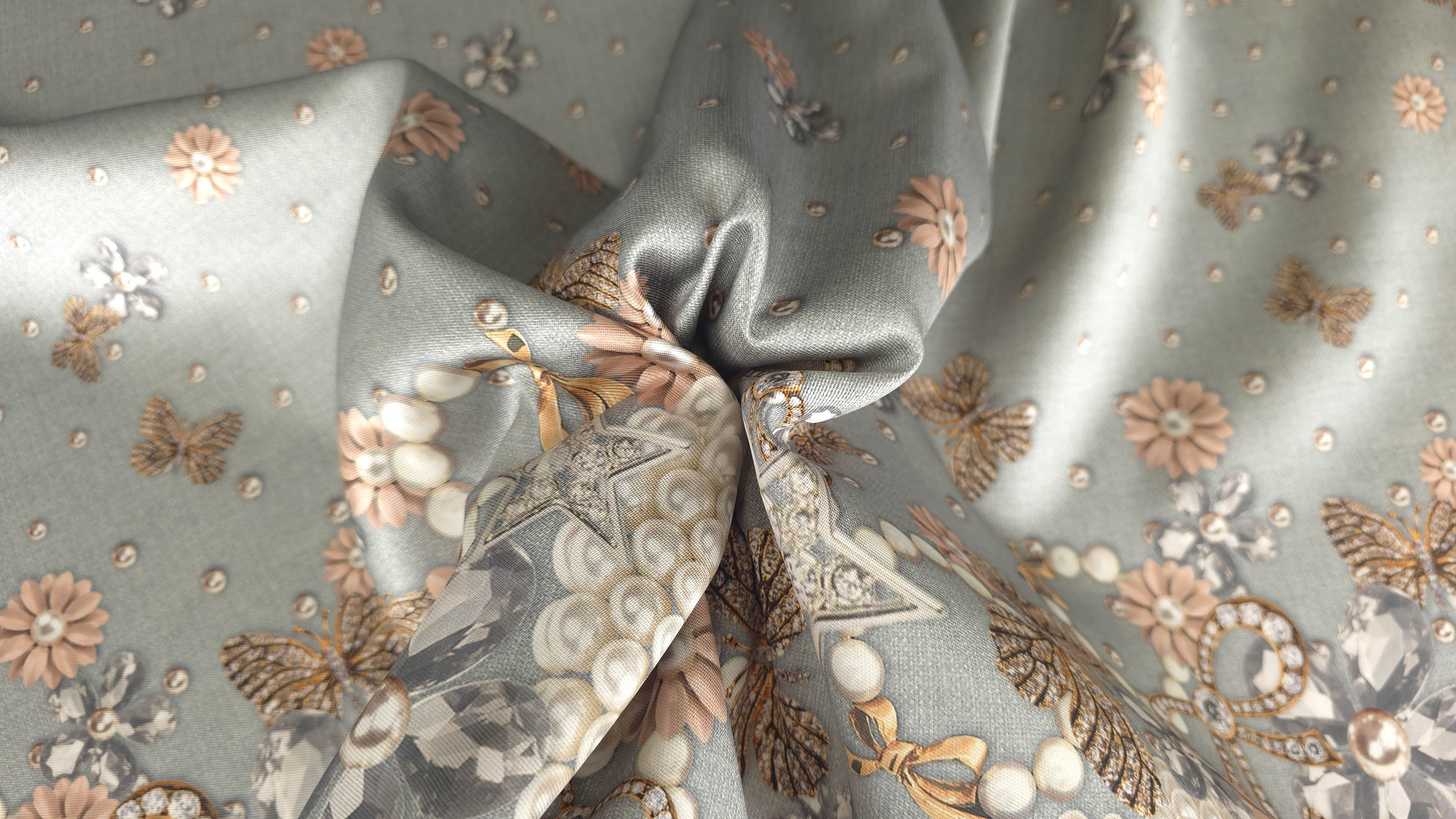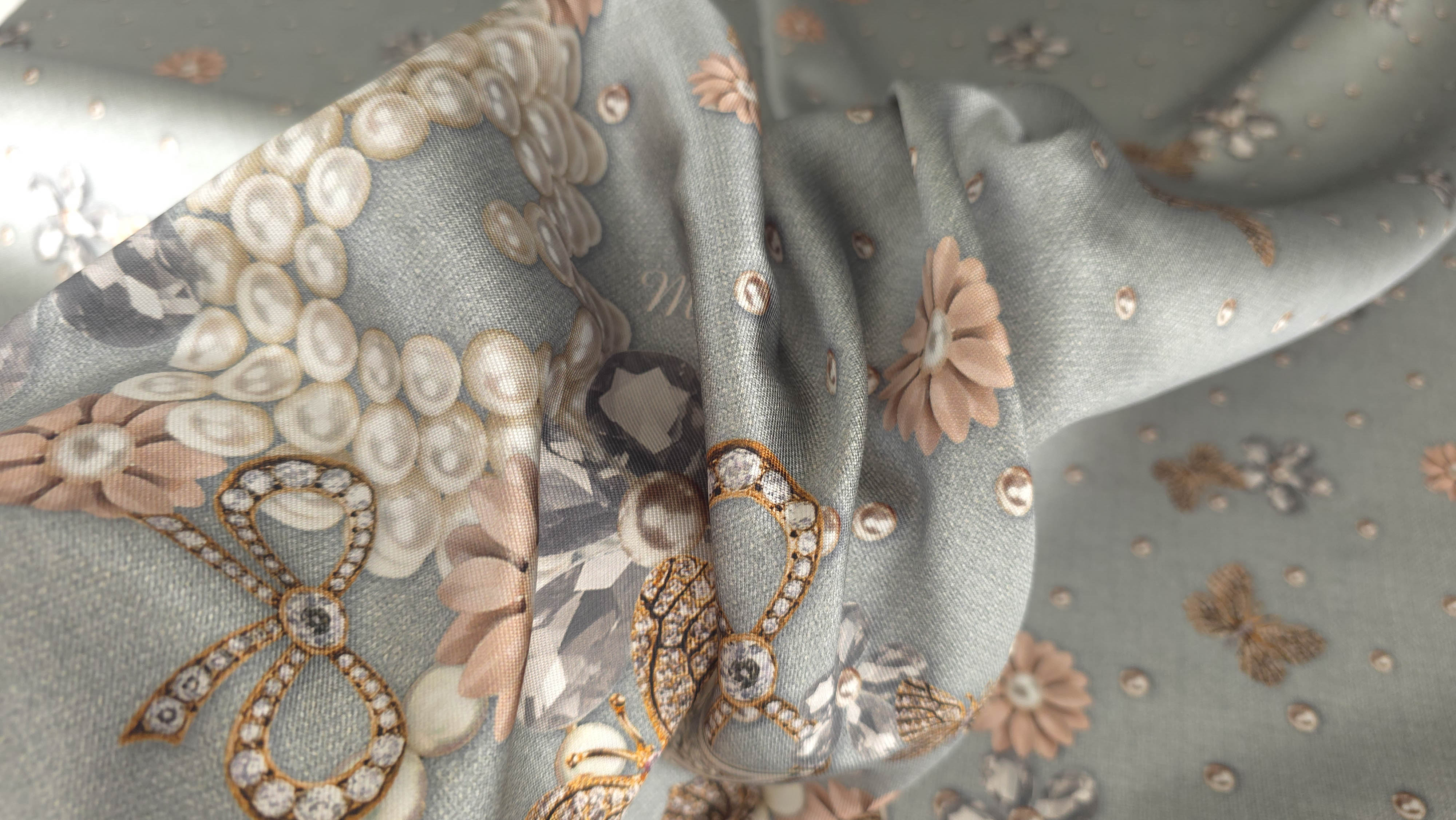 Tafta imprimata Bejewelled Brooches MNL1021 este o țesătură din poliester, cu un imprimeu multicolor. Imprimeul are un caracter decorativ, cu elemente tip bijuterie și detalii florale. Materialul are o suprafață netedă, cu un luciu discret, vizibil în lumină. Aspectul rămâne clar pe întreaga lățime, iar imprimeul este ușor de pus în valoare.