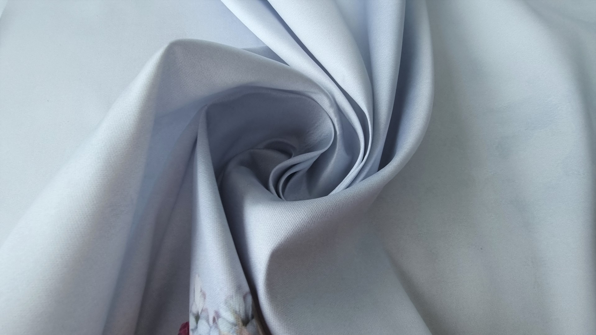 Material textil cu tinuta, cu suprafata usor satinata, pretabil pentru rochii cu volum.