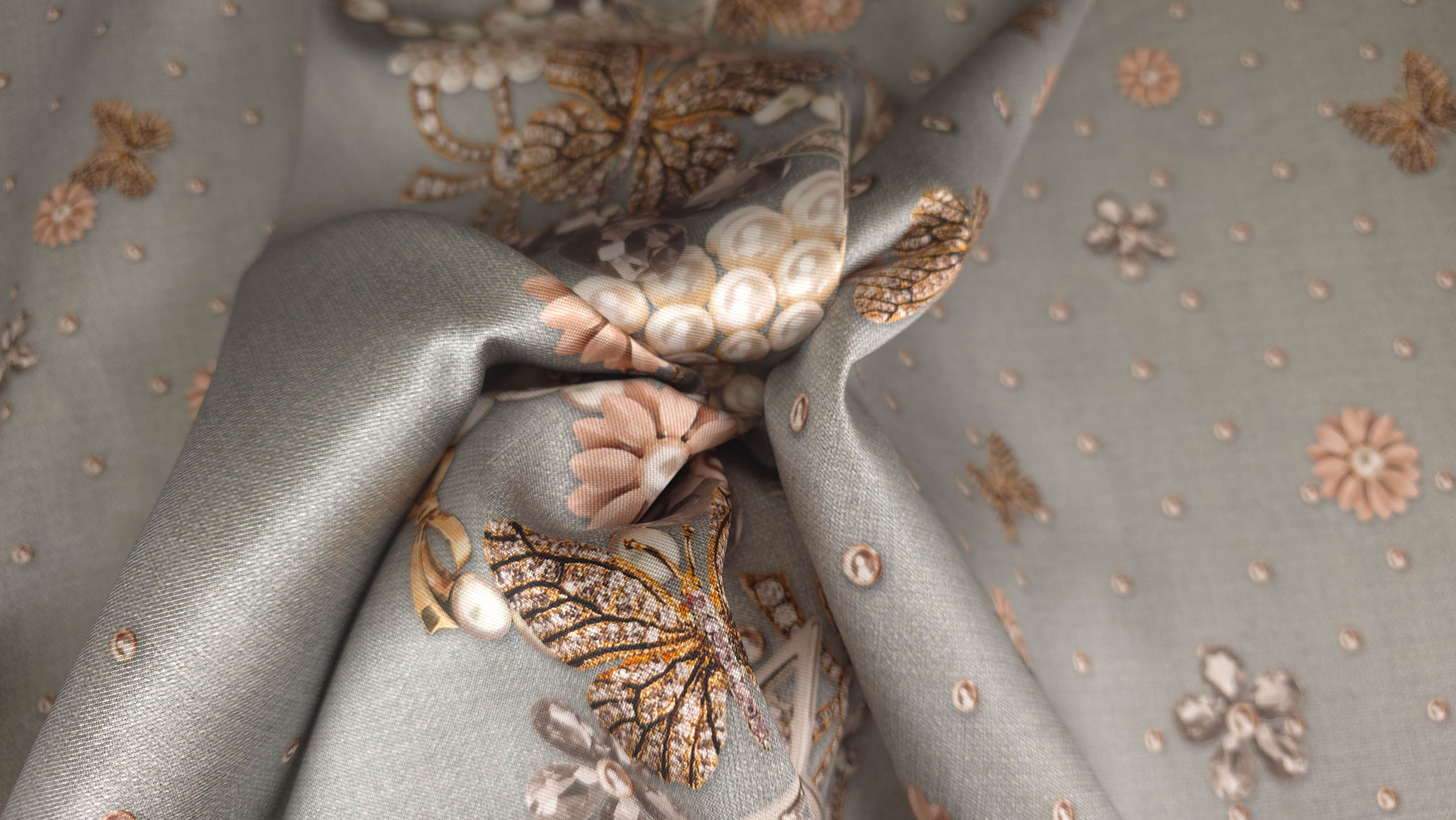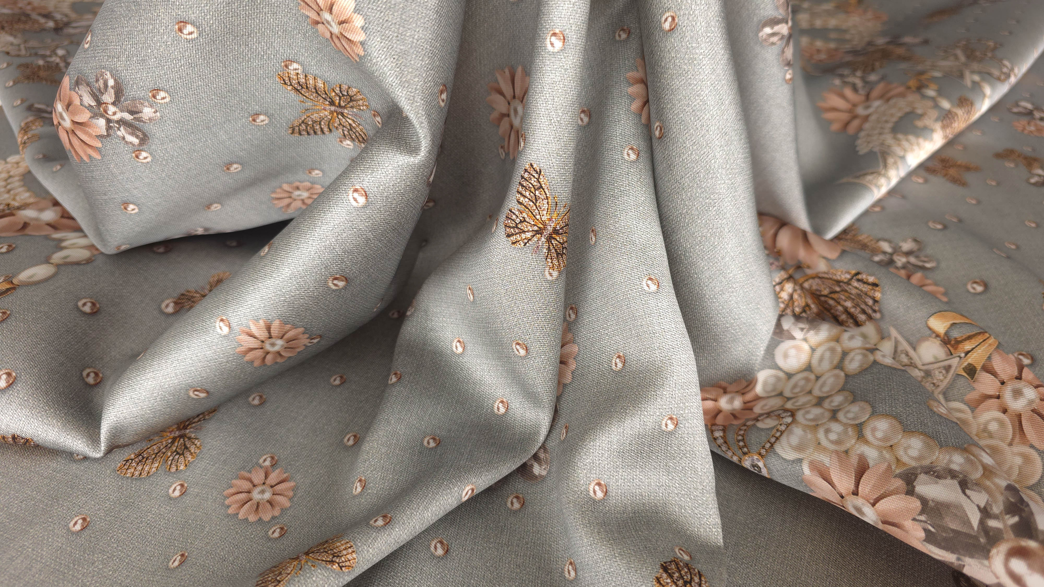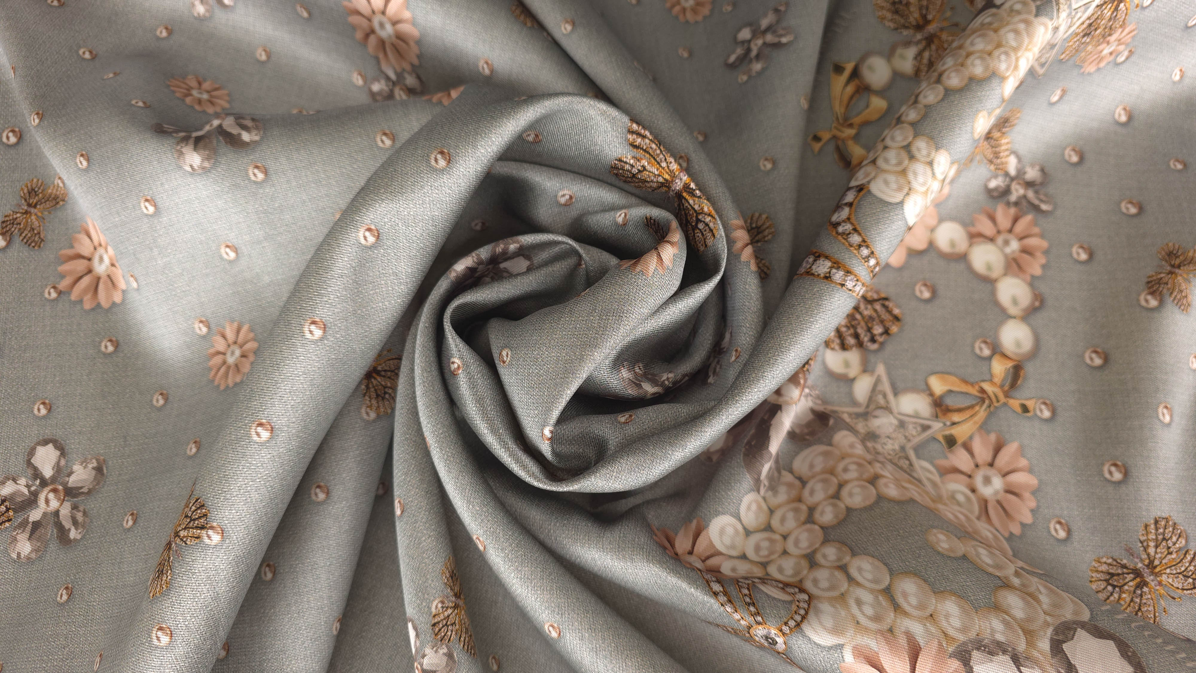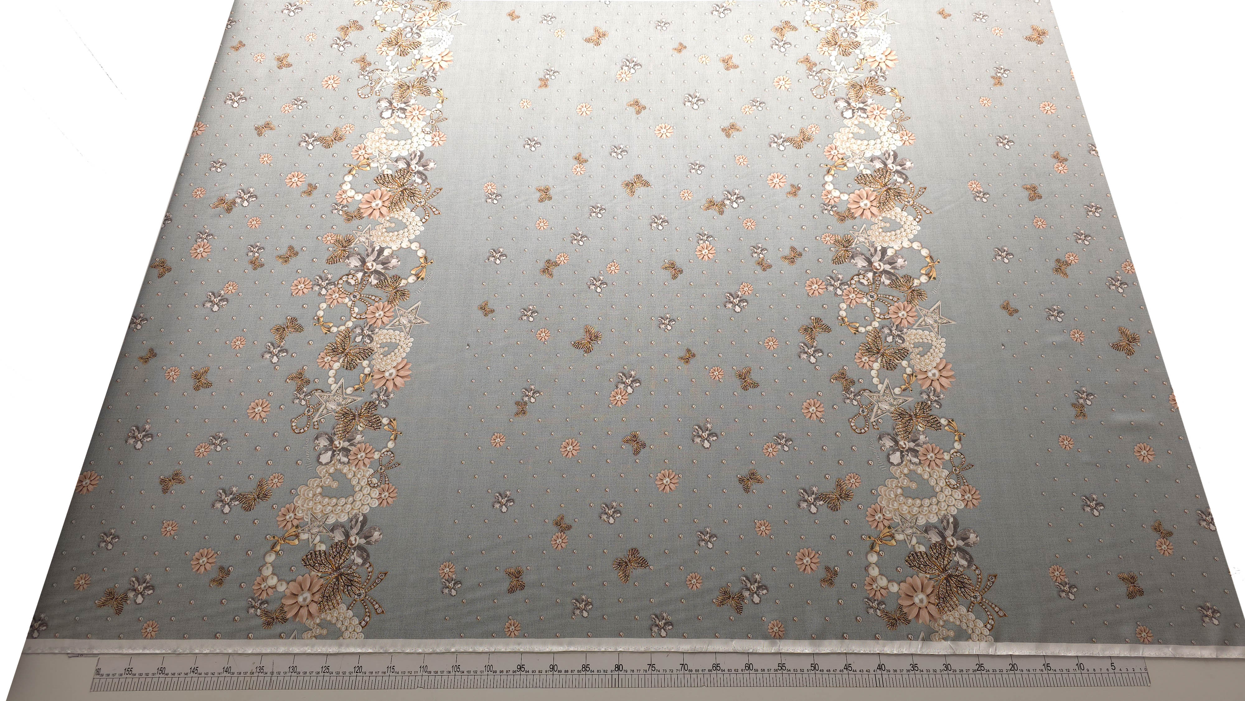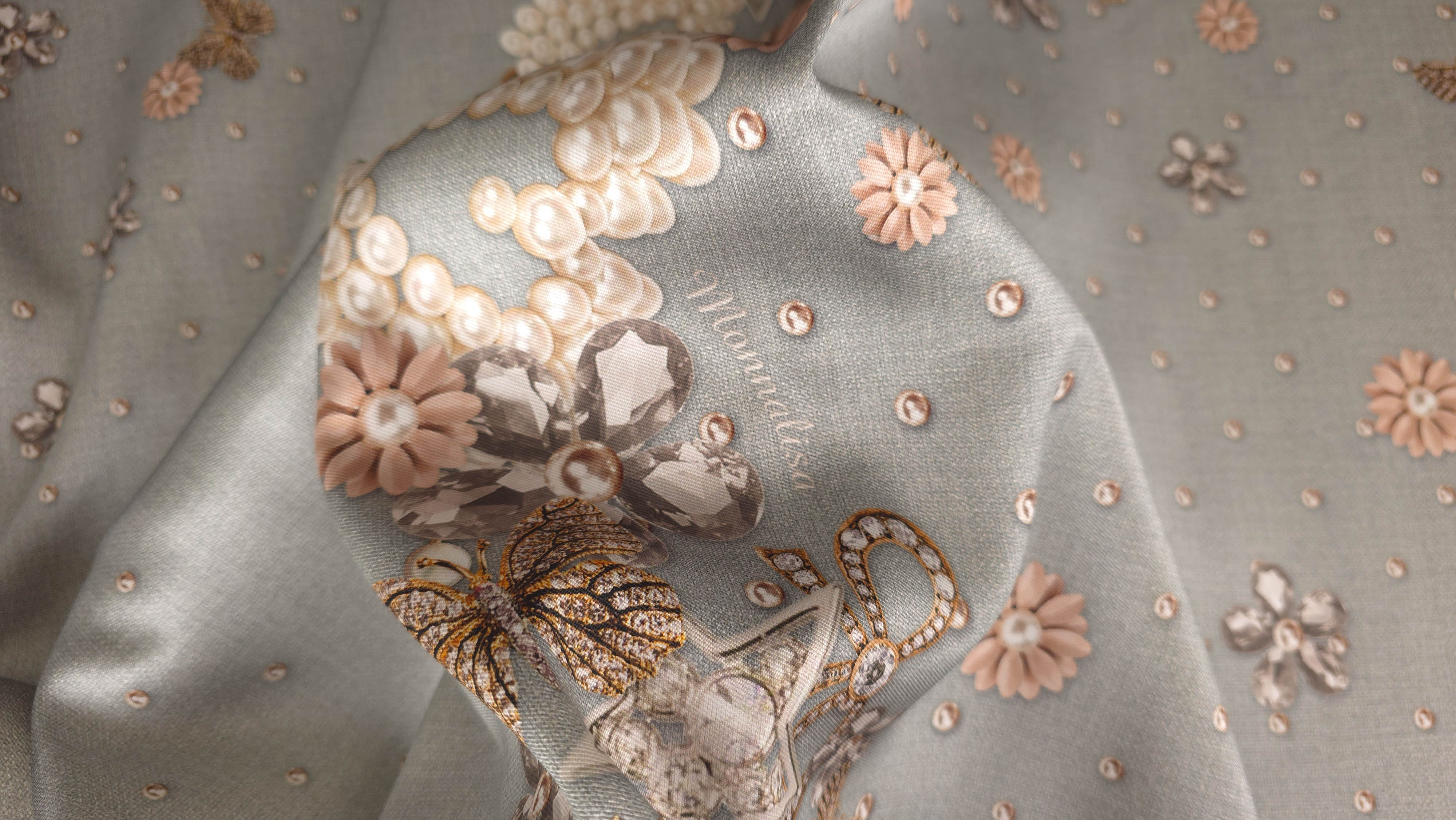 Tafta imprimata multicolora mln1808 este o țesătură din poliester, cu structură specifică taftalei, caracterizată printr-un aspect ușor lucios și o ținută bine definită. Materialul prezintă un imprimeu complex, cu elemente decorative inspirate din bijuterii, perle, flori și motive ornamentale, dispuse sub formă de panou.
