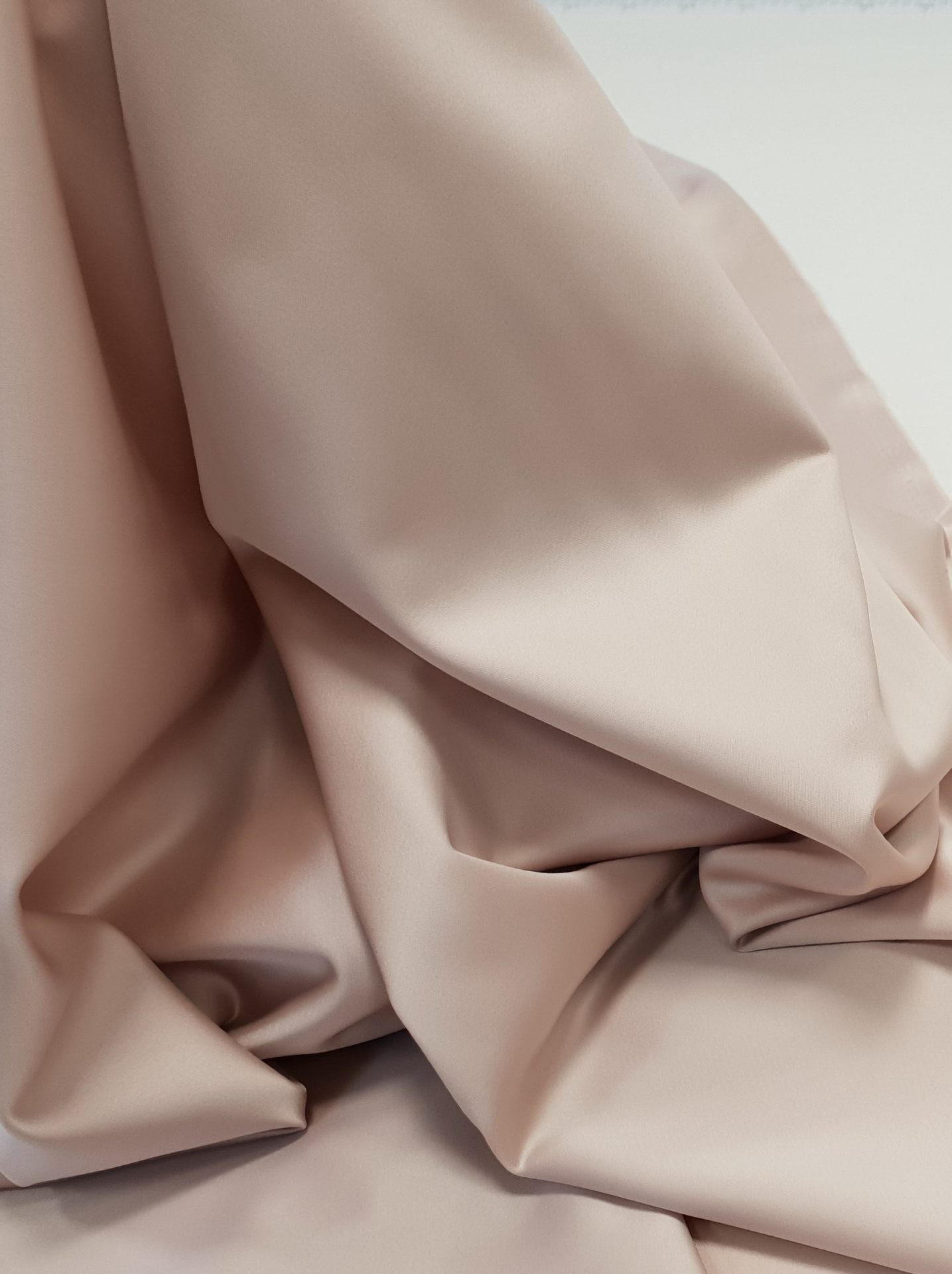 Tafta Oscar nude latte are toate caracteristicile necesare pentru a fi demna de covorul rosu. Este o tesatura rafinata, de inalta calitate, cu luciu discret, cu tuseu moale, fin si “cadere” excelenta.
