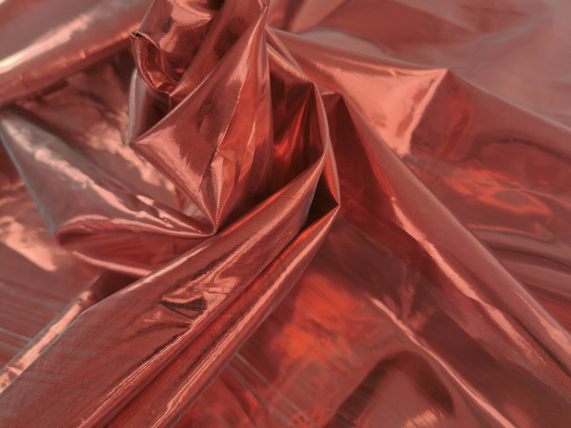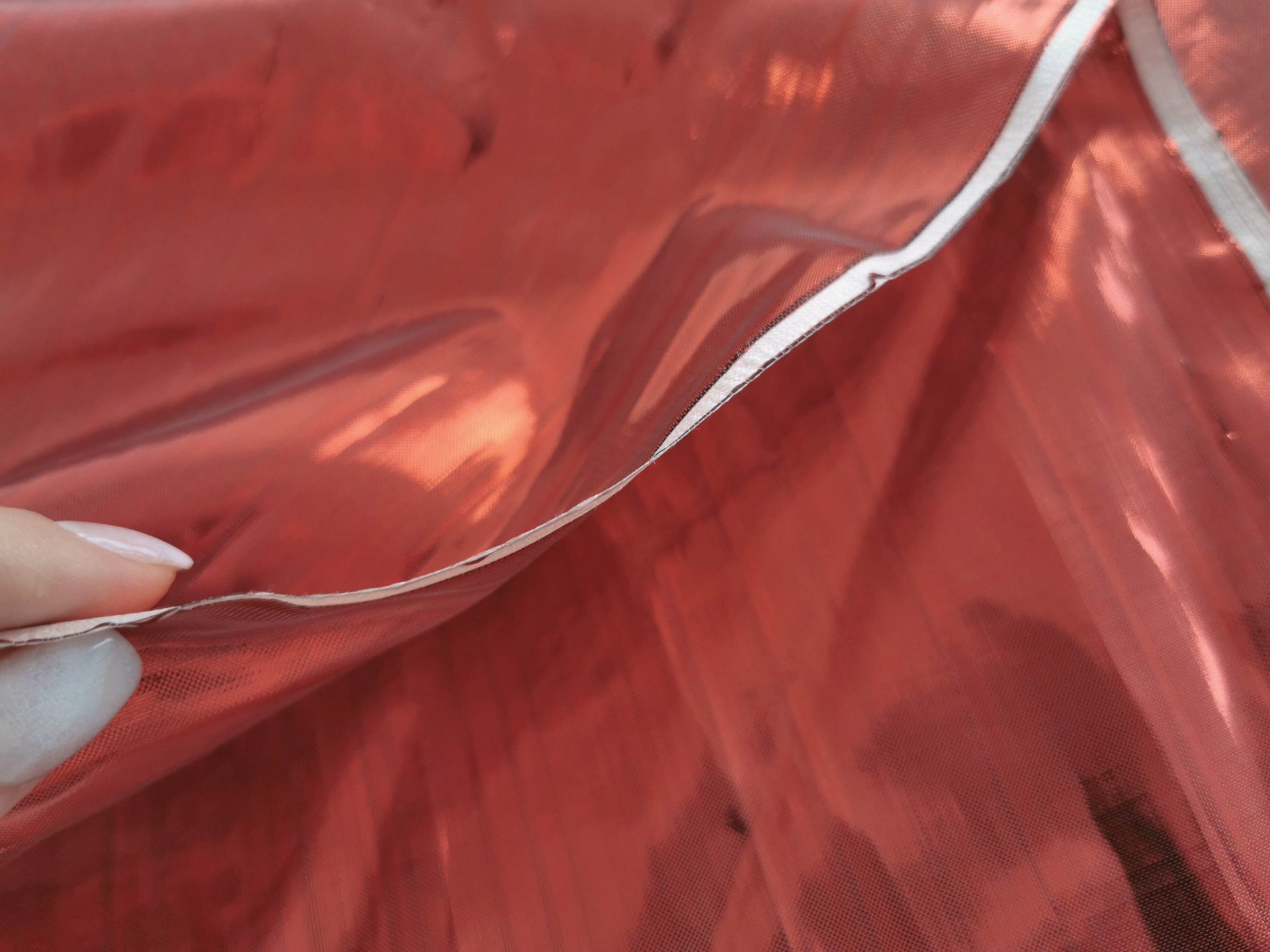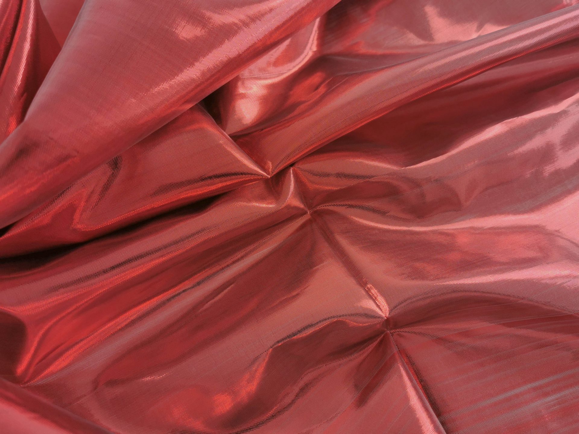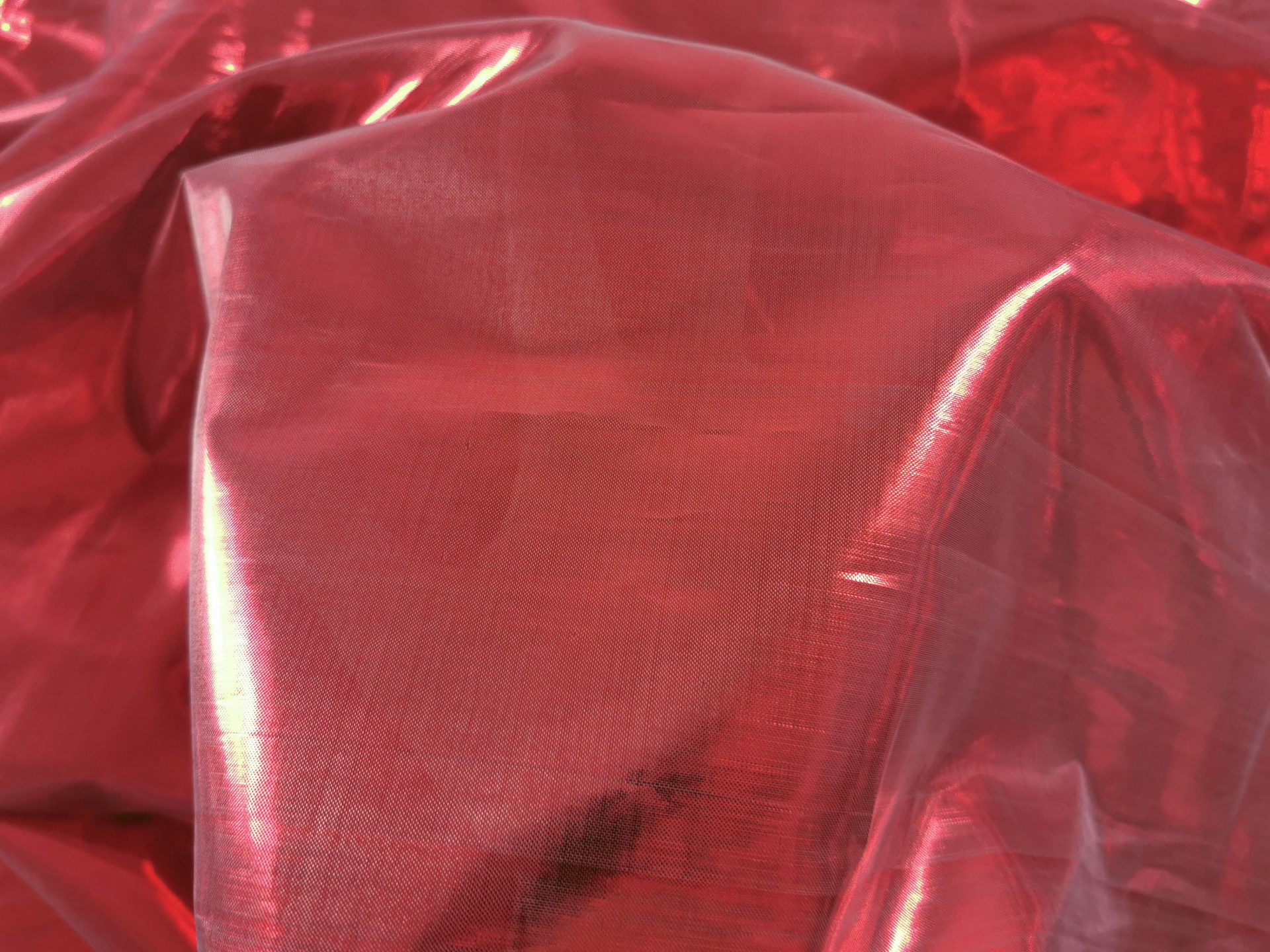 Organza metalizata rosie, material textil cu textura subtire si transparenta medie.