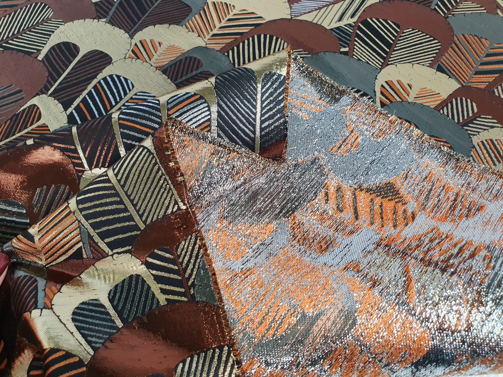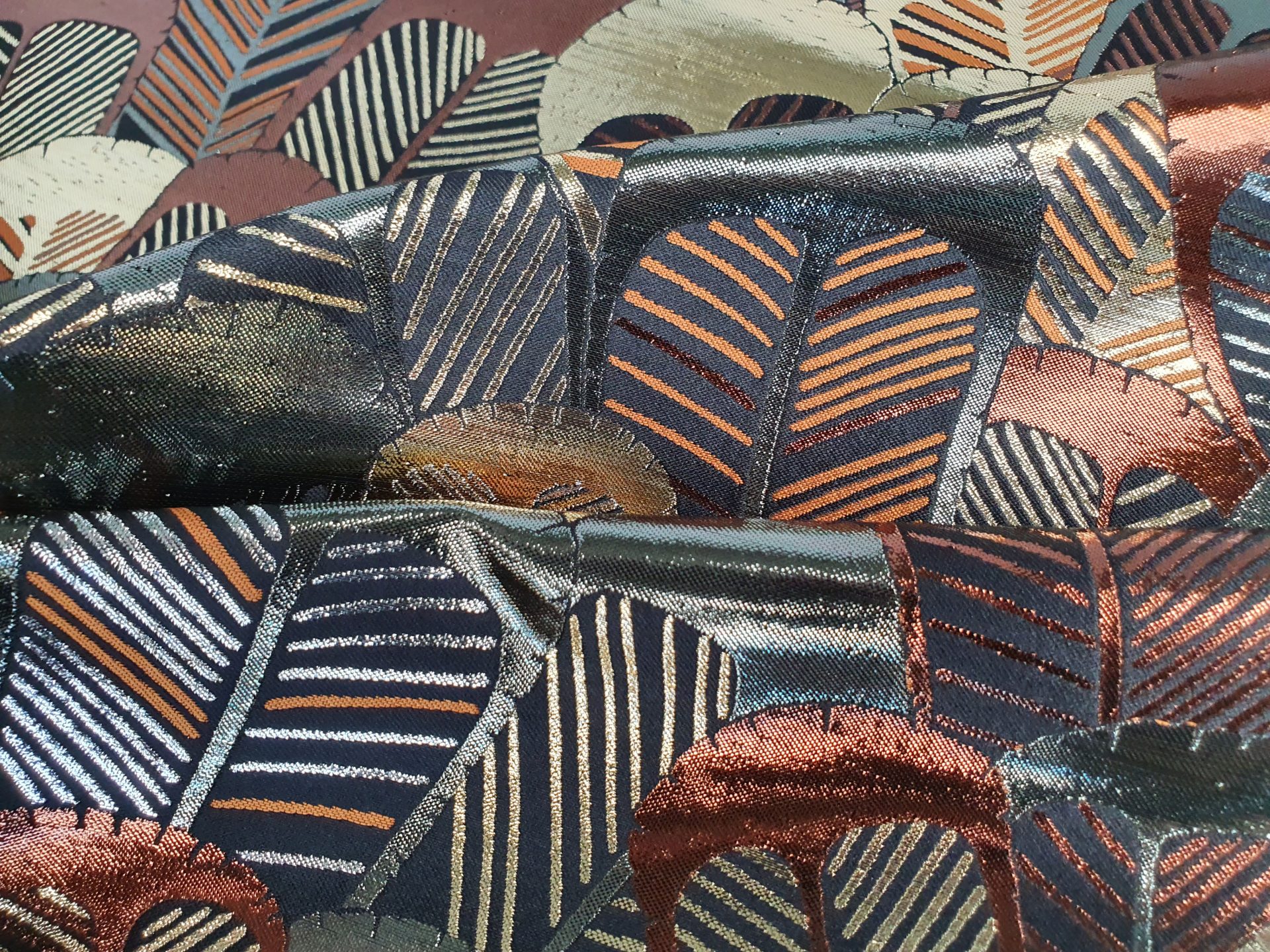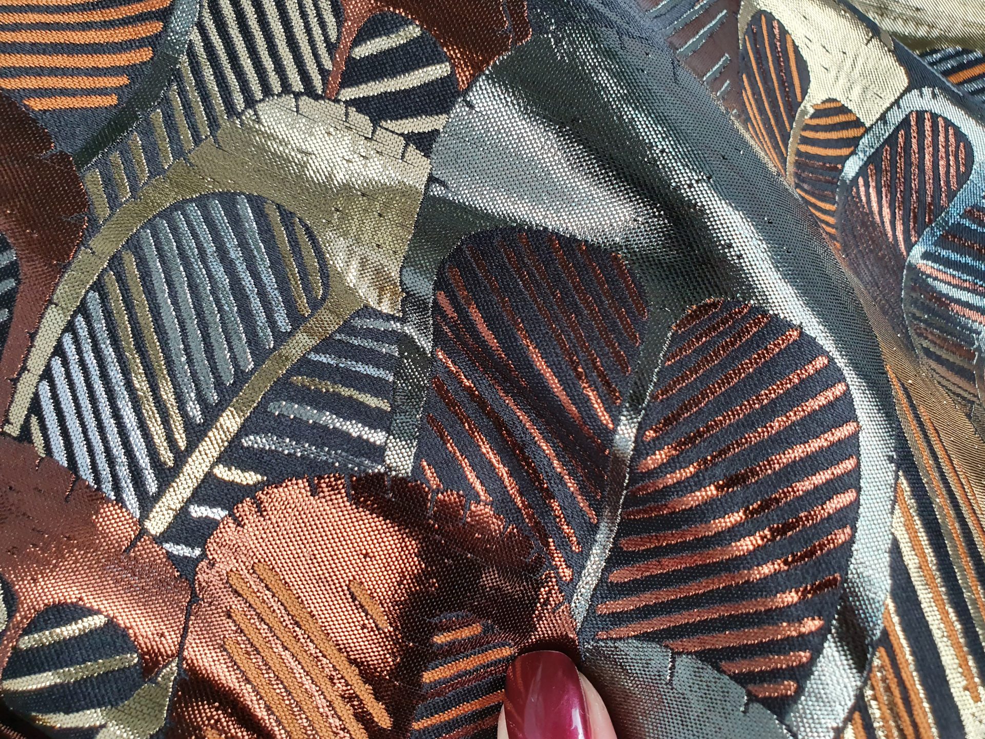 Brocard metalizat cu matase naturala DSQ140, cu model frunze multicolore raspandite pe intreaga suprafata.