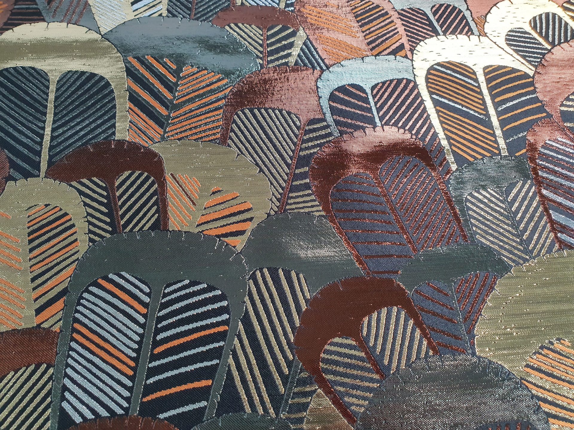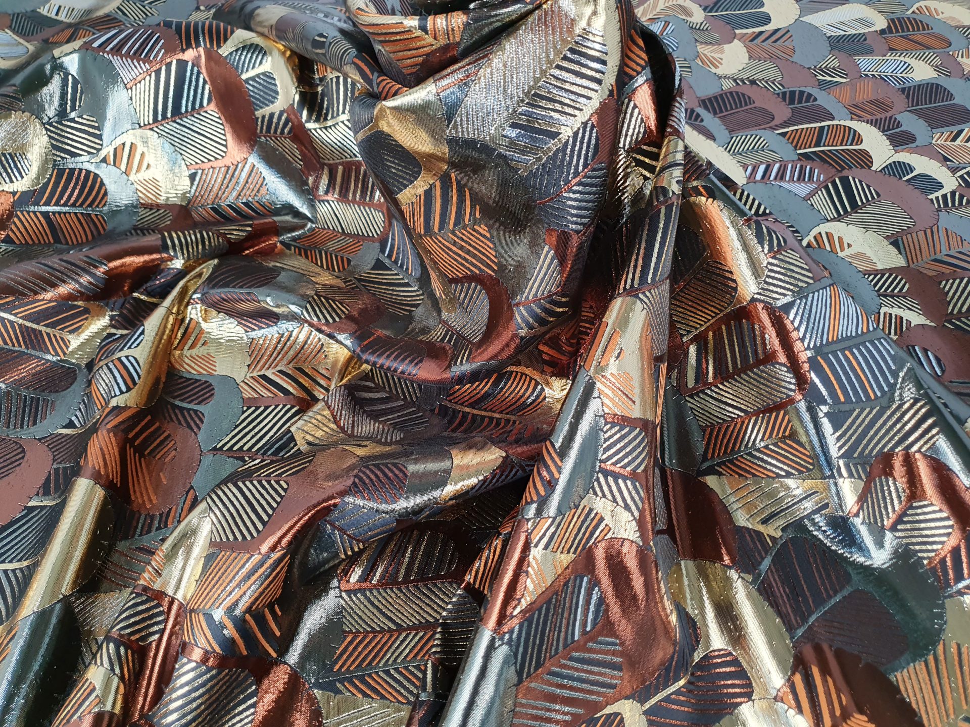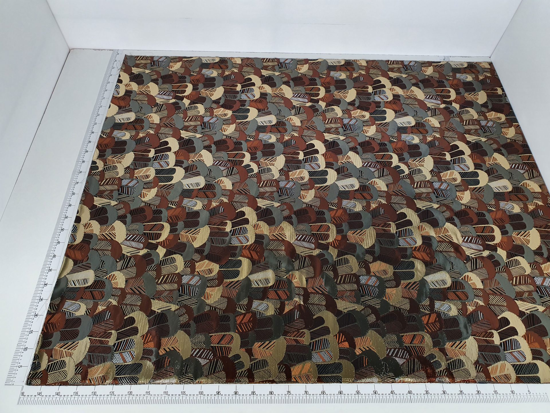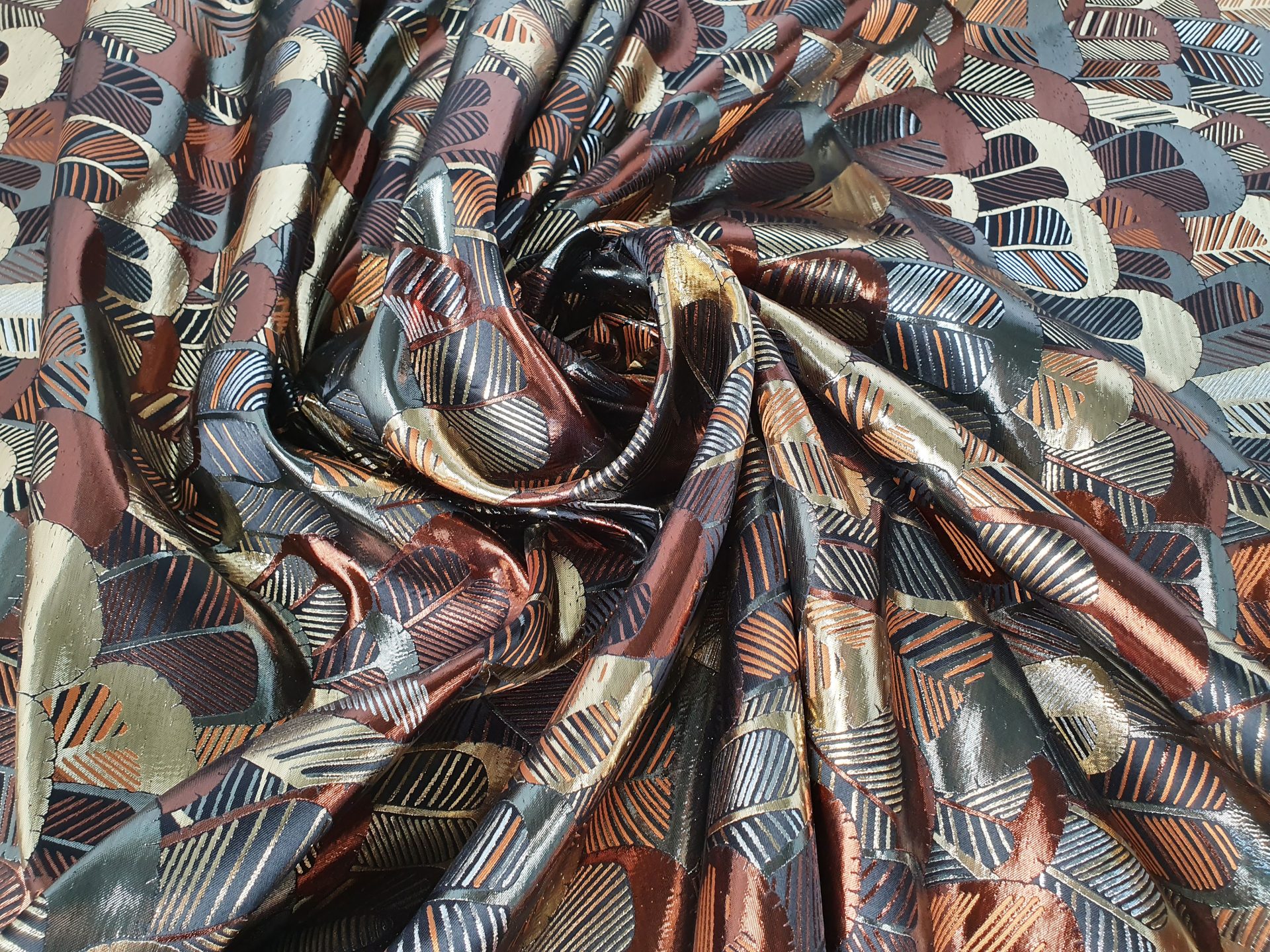 Brocard metalizat cu matase naturala DSQ140, cu model frunze multicolore raspandite pe intreaga suprafata.
