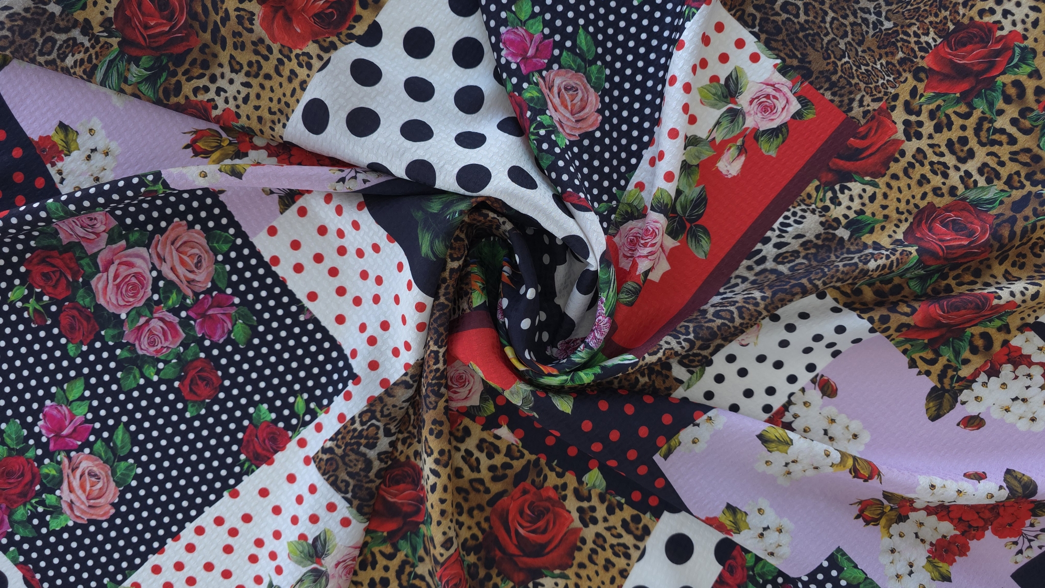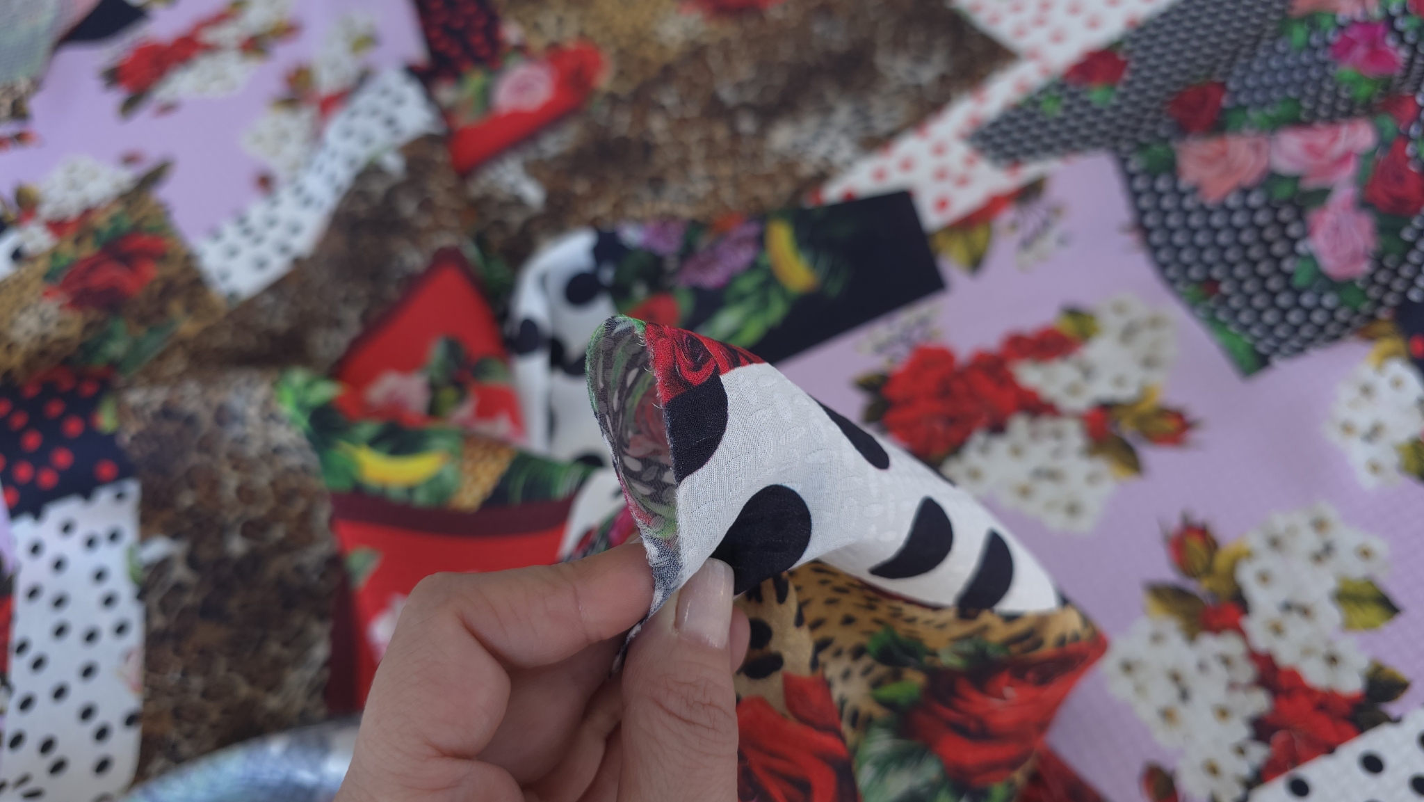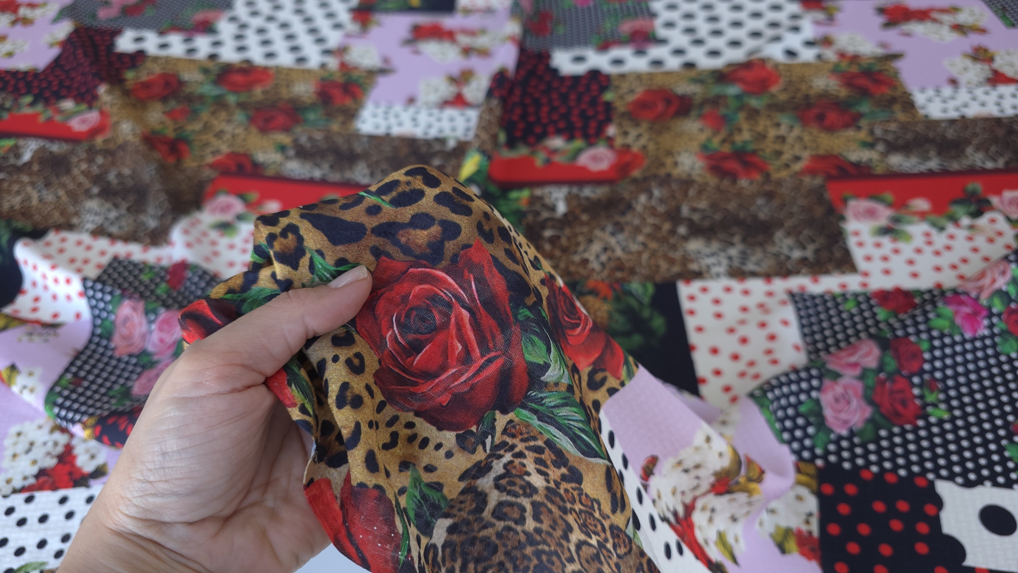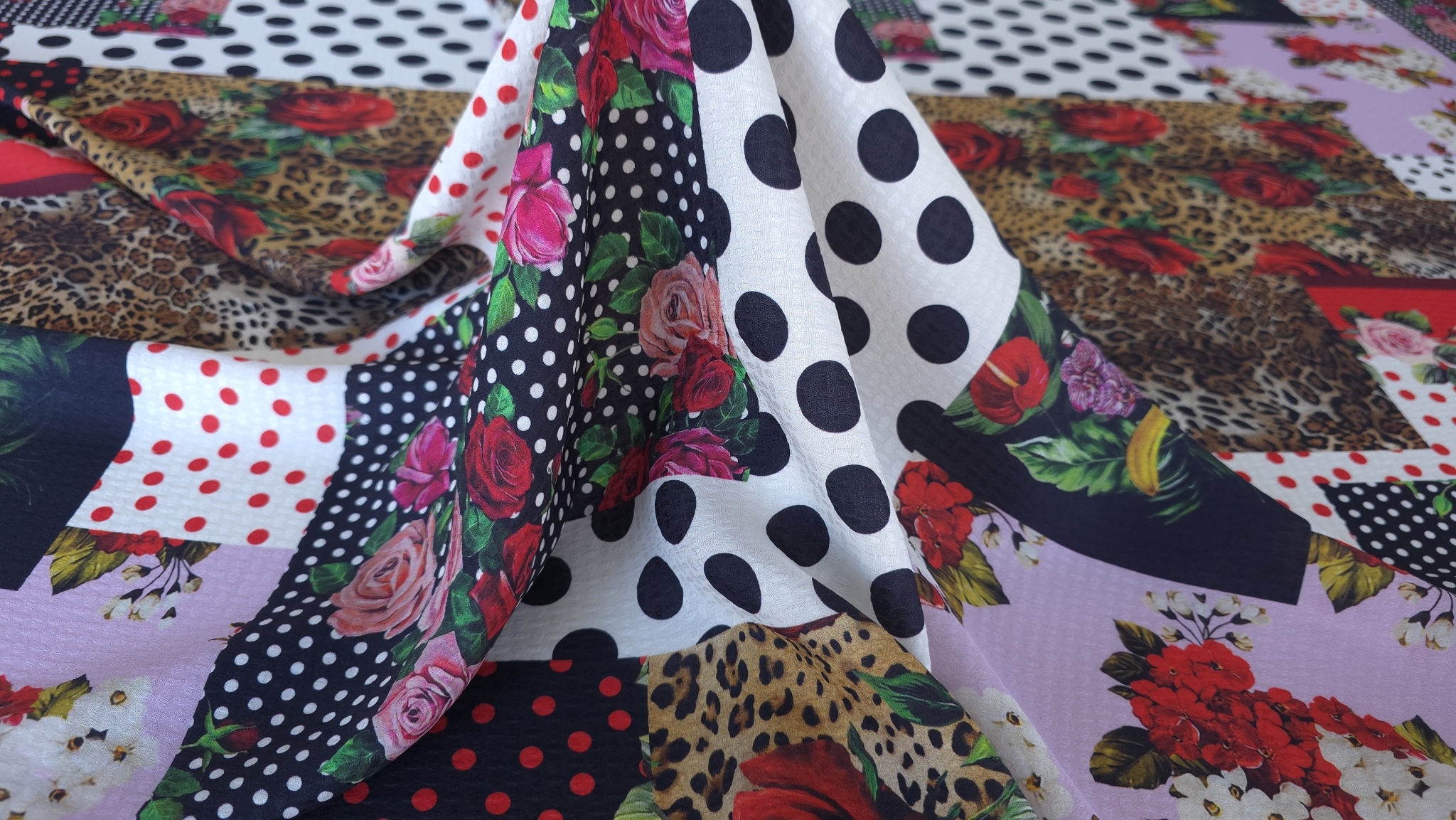 Structura fina si subtire face ca materialul sa fie potrivit pentru piese fluide. Modelul patchwork este alcatuit din imprimeuri inspirate din estetica marilor case de moda. Desenul este distribuit uniform si creeaza un impact vizual puternic.