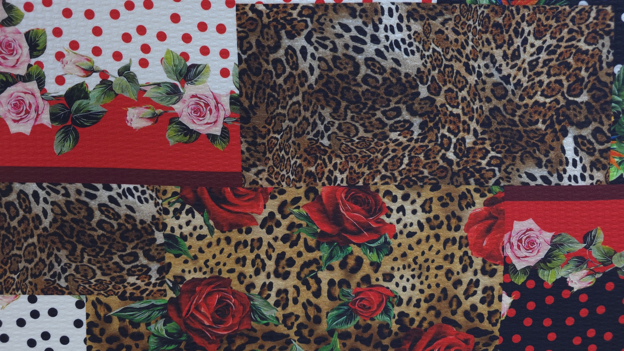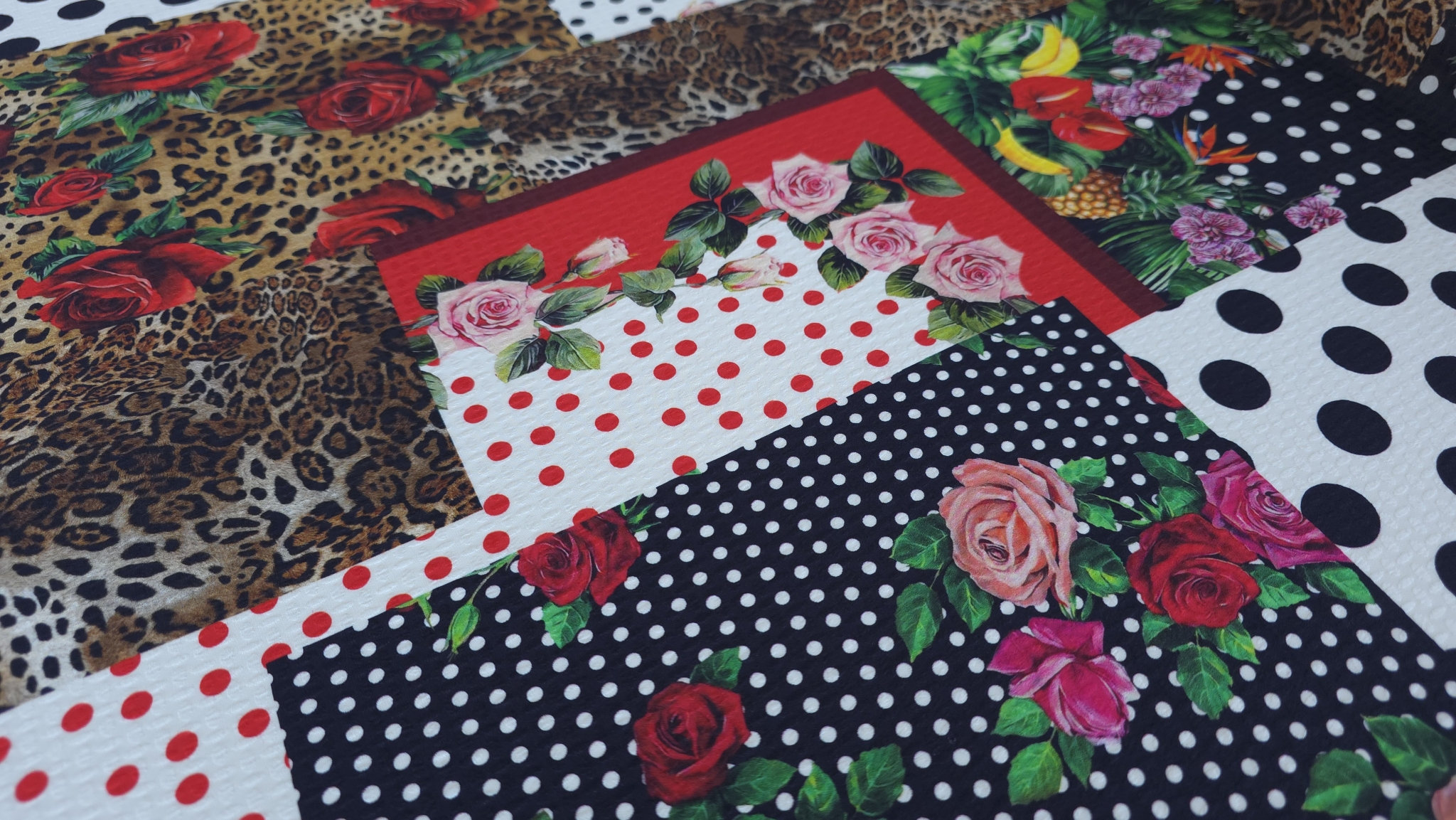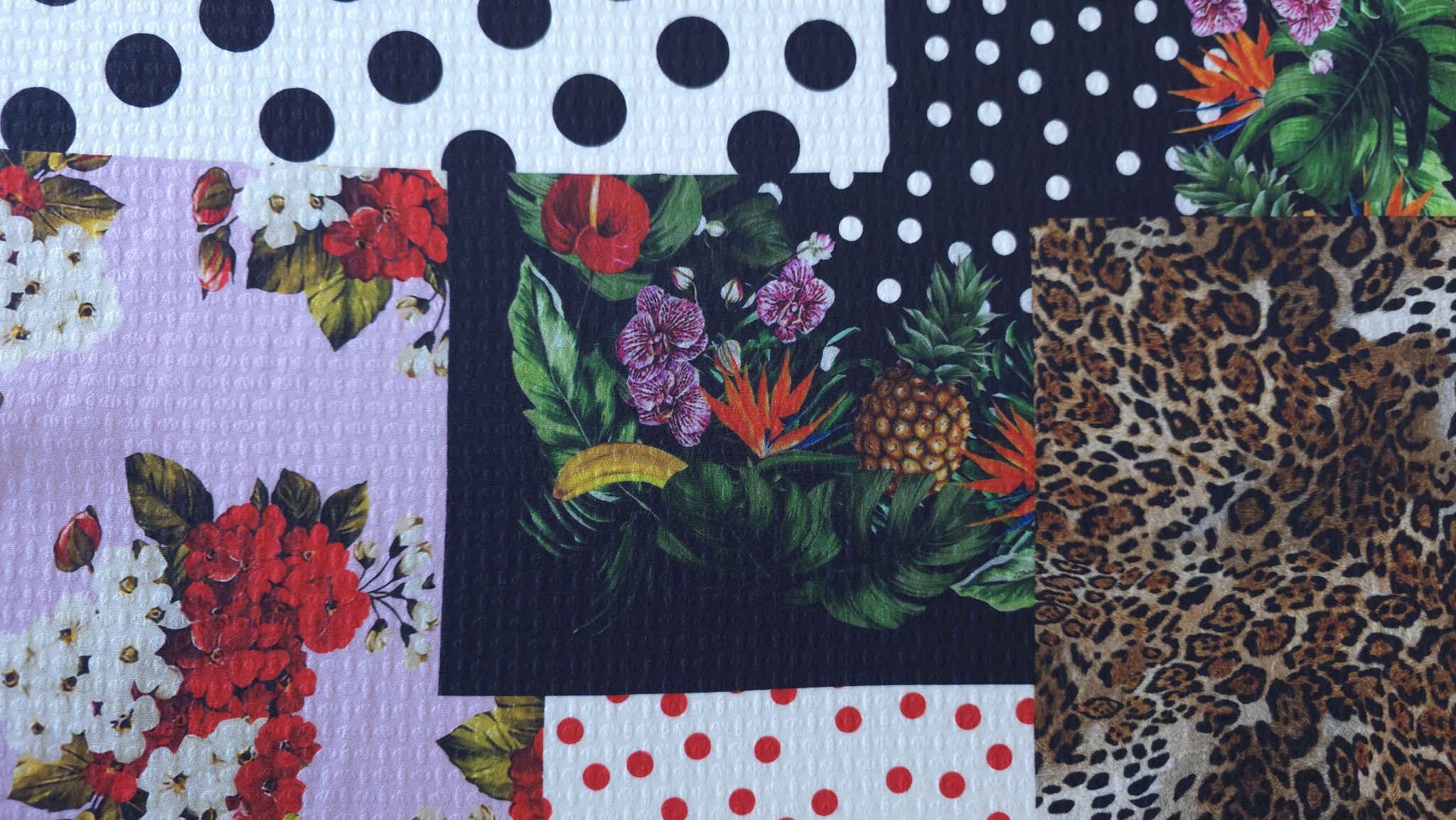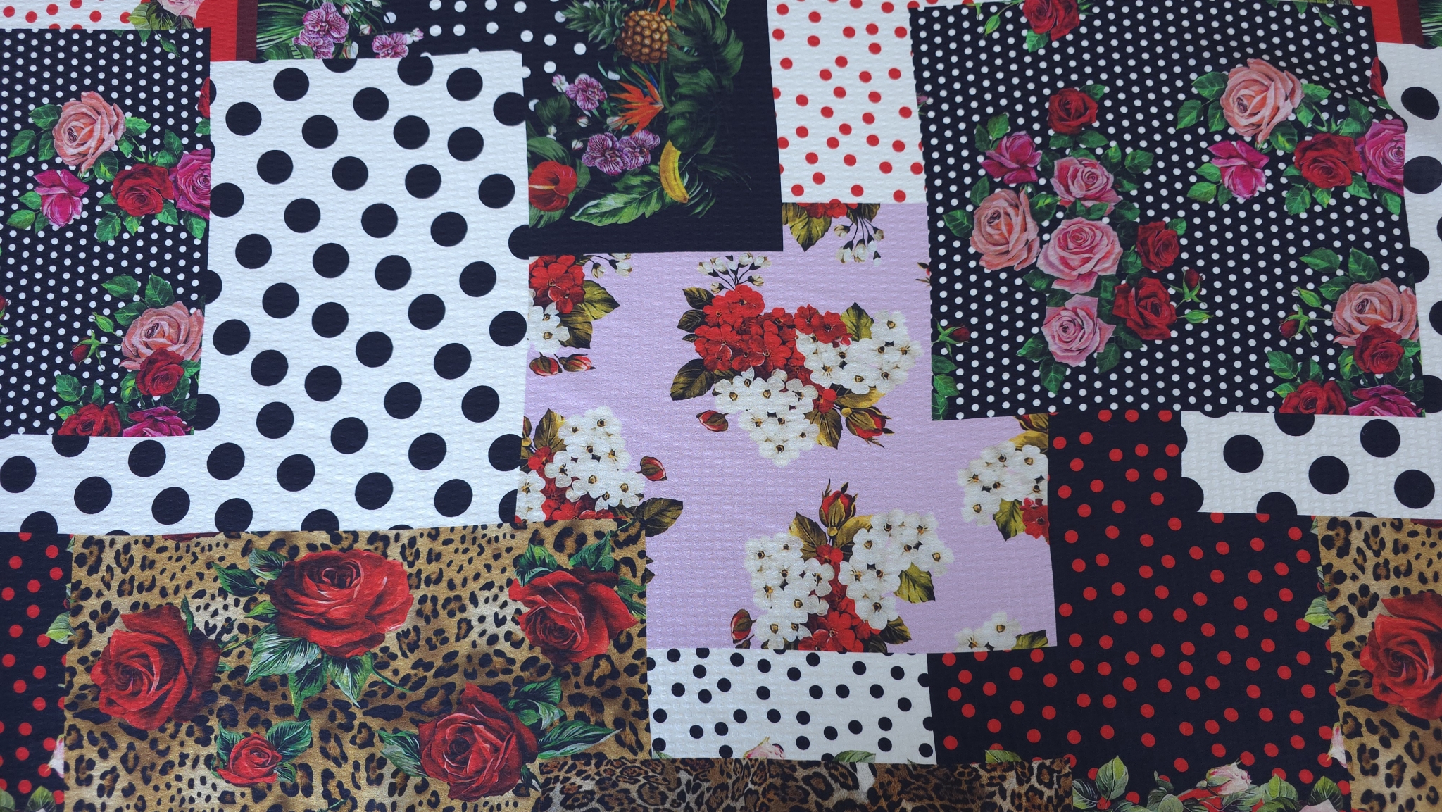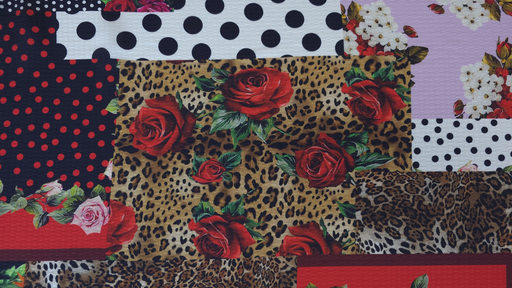 Structura fina si subtire face ca materialul sa fie potrivit pentru piese fluide. Modelul patchwork este alcatuit din imprimeuri inspirate din estetica marilor case de moda. Desenul este distribuit uniform si creeaza un impact vizual puternic.
