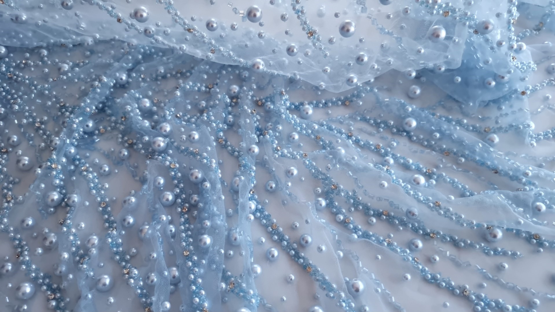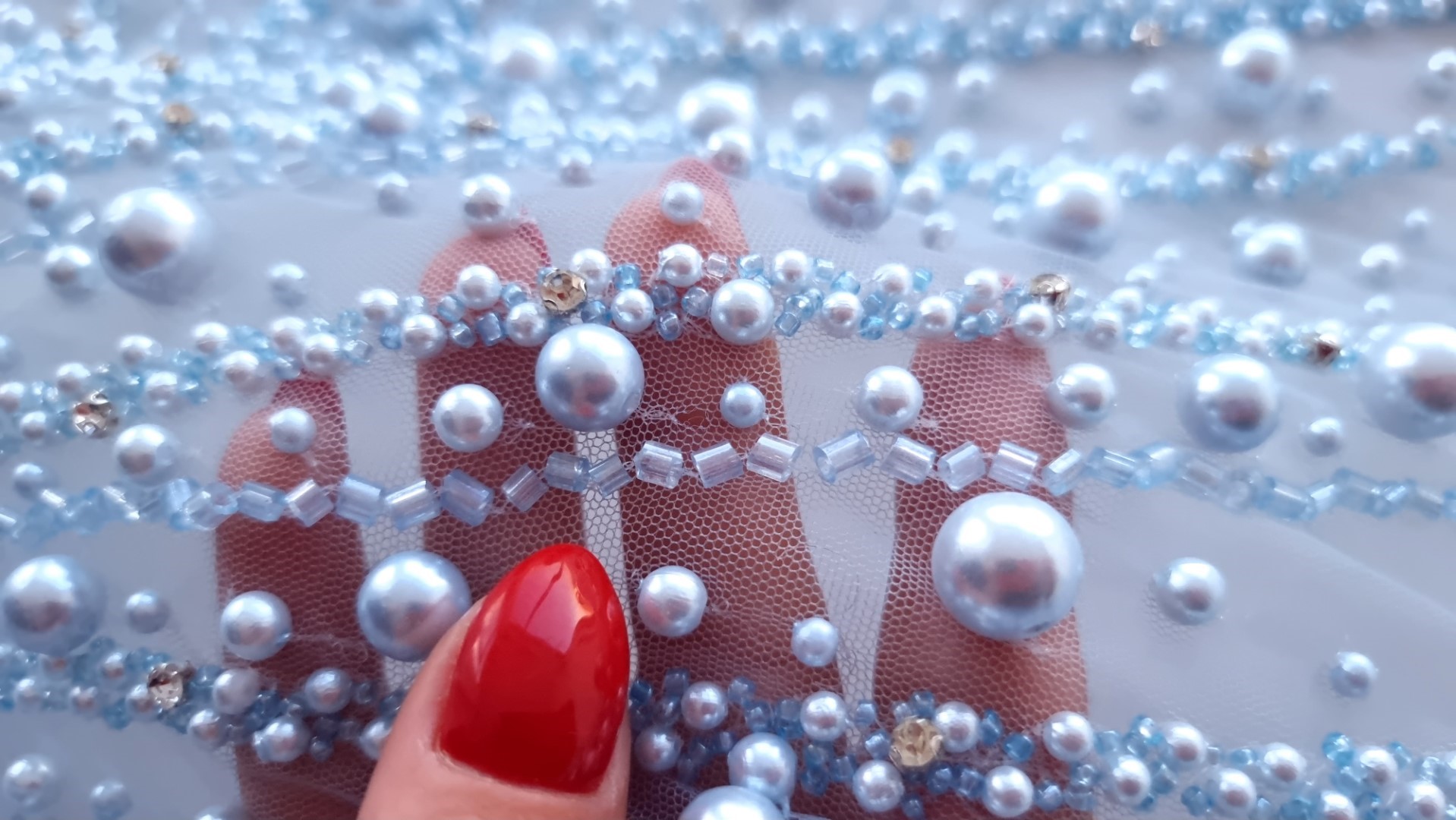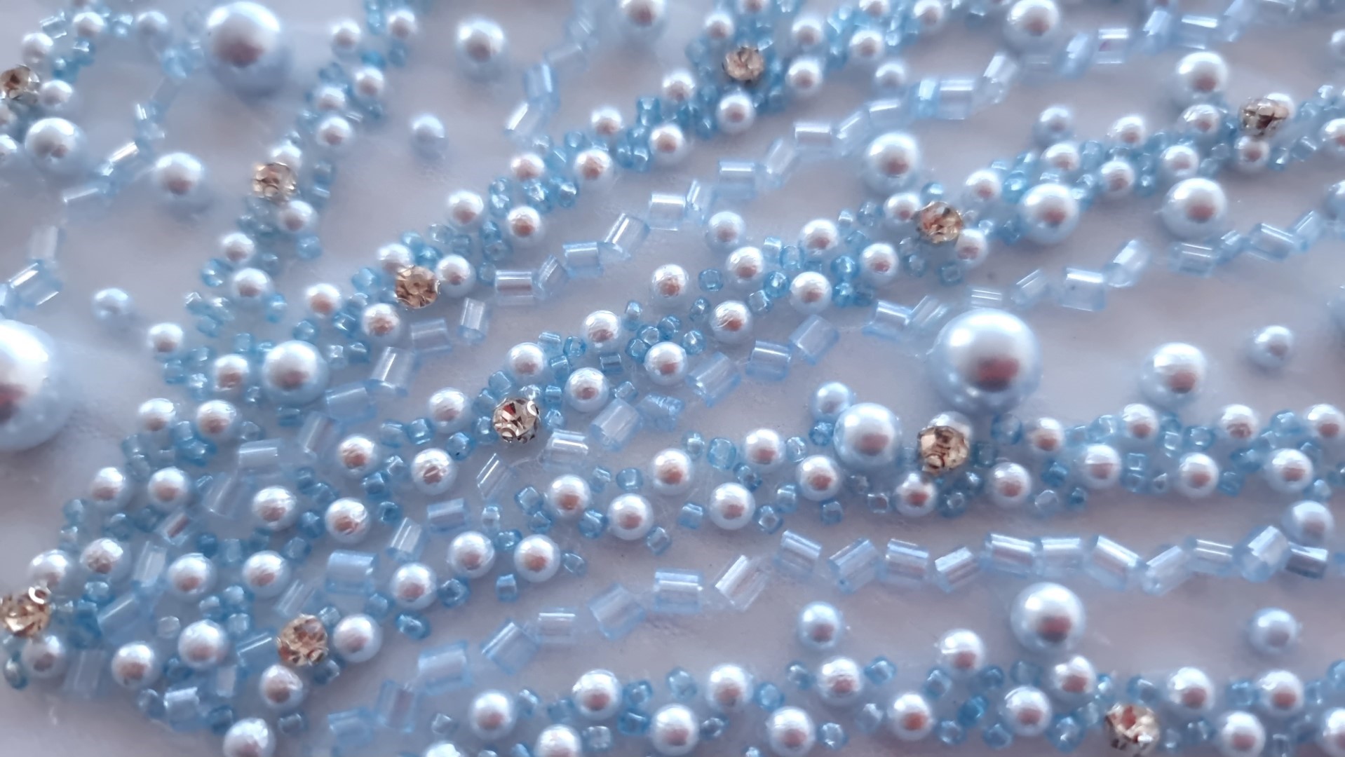 Broderie baby blue cu perle, pietre si margelute tubulare cusute manual pe tulle bleu.