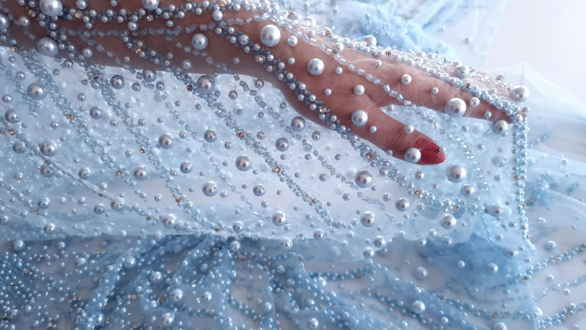 Prezent in majoritatea colectiilor de gala haute couture a celor mai renumiti designeri internationali, tulle-ul brodat manual cu perle de inalta calitate a devenit unul dintre cele mai ravnite materiale ce scoate din anonimat orice creatie vestimentara menita sa capteze toate privirile. Baza folosita este un tulle fin, dar rezistent si putin elastic. Aplicatiile sunt formate din perle intregi de diferite marimi, pietre argintii si margelute cusute manual cu fir transparent si rezistent termic. Atentia cu care au fost cusute individual face ca in momentul taierii materialului, perlele sa nu se desprinda de pe tulle chiar daca se afla la doar 1-2 mm de marginea taiata, conferind usurinta in procesul de lucru. Caracterul exclusivist este dat de faptul ca fiind lucrate manual, aceste creatii minunate sunt disponibile in cantitati mici.