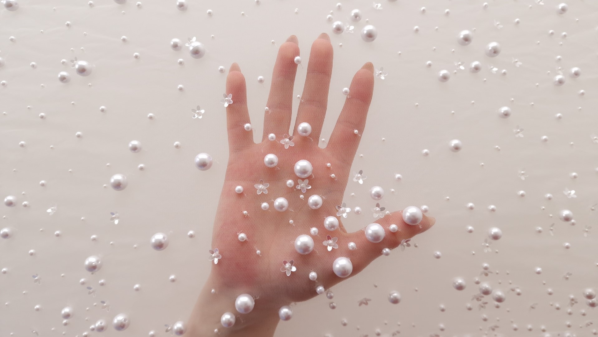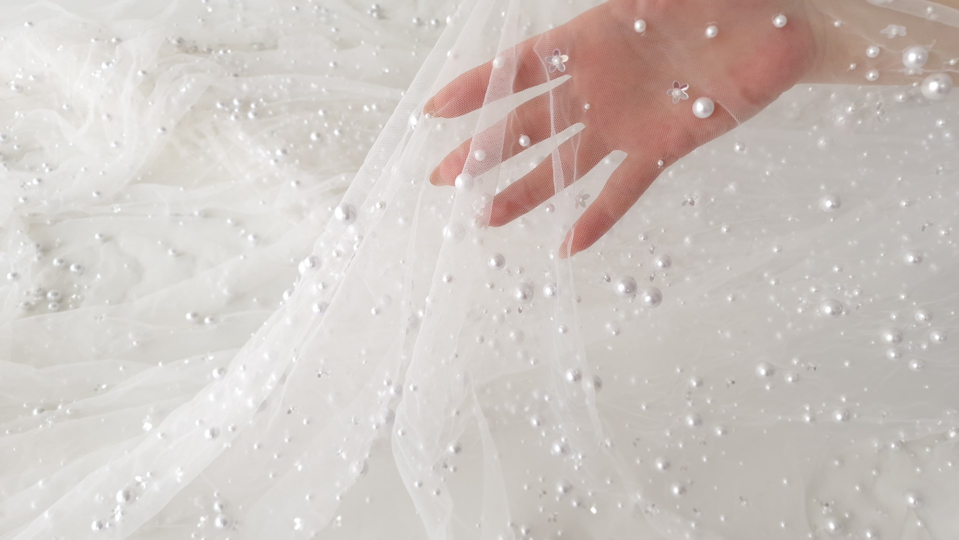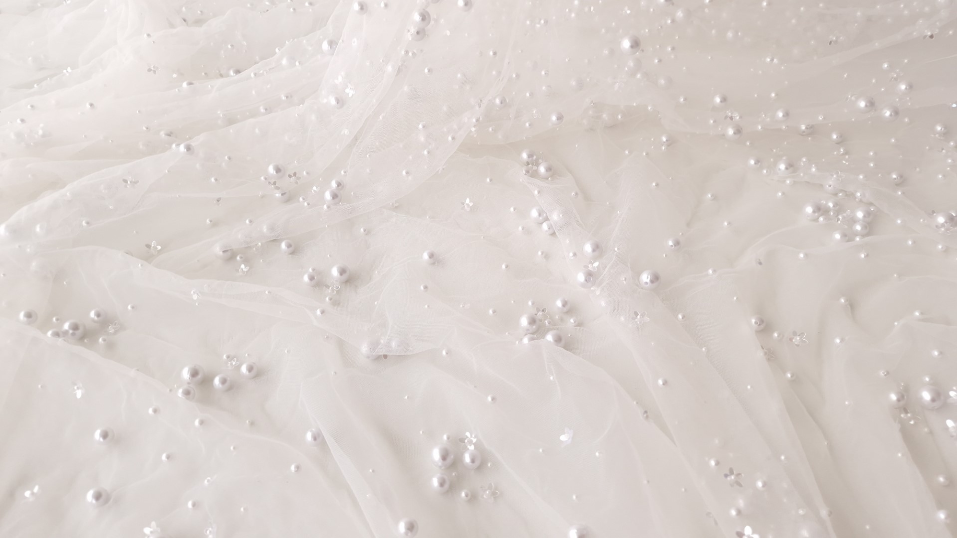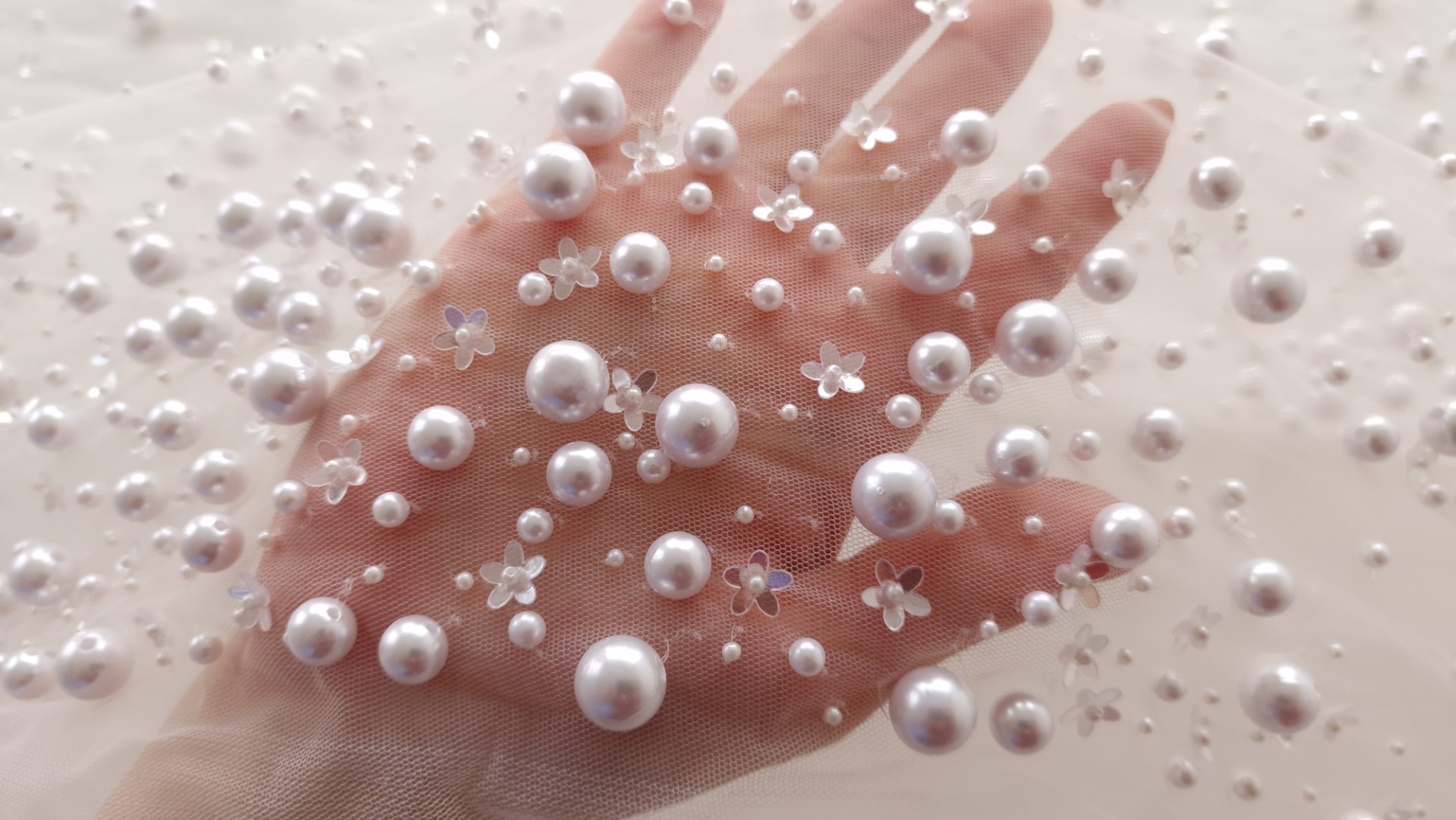 Prezent in majoritatea colectiilor de gala haute couture a celor mai renumiti designeri internationali, tulle-ul brodat manual cu perle de inalta calitate a devenit unul dintre cele mai ravnite materiale ce scoate din anonimat orice creatie vestimentara menita sa capteze toate privirile. Baza folosita este un tulle fin, dar rezistent si putin elastic. Aplicatiile sunt formate din perle intregi de diferite marimi, pietre argintii si margelute cusute manual cu fir transparent si rezistent termic. Atentia cu care au fost cusute individual face ca in momentul taierii materialului, perlele sa nu se desprinda de pe tulle chiar daca se afla la doar 1-2 mm de marginea taiata, conferind usurinta in procesul de lucru. Caracterul exclusivist este dat de faptul ca fiind lucrate manual, aceste creatii minunate sunt disponibile in cantitati mici.