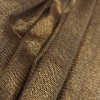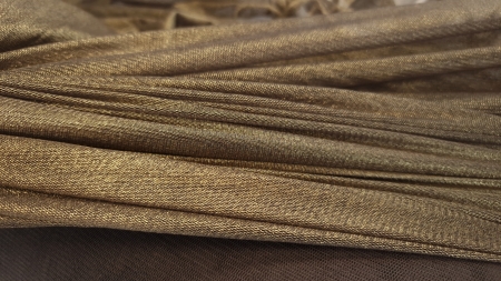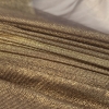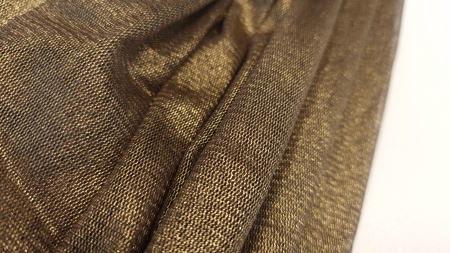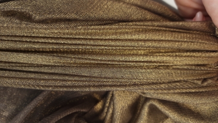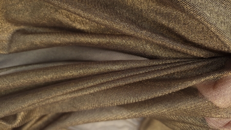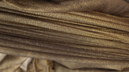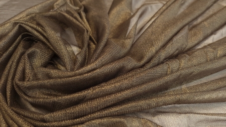 Tulle peliculizat din matase dark gold, ideal pentru o tinuta pretioasa si eleganta. Pelicula metalizata este una discreta, astfel textura tesaturii ramane moale si foarte placuta la atingere, fiind in acelasi timp fluida, perfecta pentru fronseuri sofisticate, cu scopul de a avantaja orice croi si silueta. Tulle-ul din 100% matase naturala este potrivit pentru rochii cu sau fara corsetaje, indiferent de lungime, dar si pentru salopete ample si vaporoase. Pentru ca tinuta sa devina cat mai spectaculoasa este de preferat sa fie folosit in croiuri bogate. Recomandam o captuseala dintr-o textura naturala, la fel de prietenoasa cu pielea.