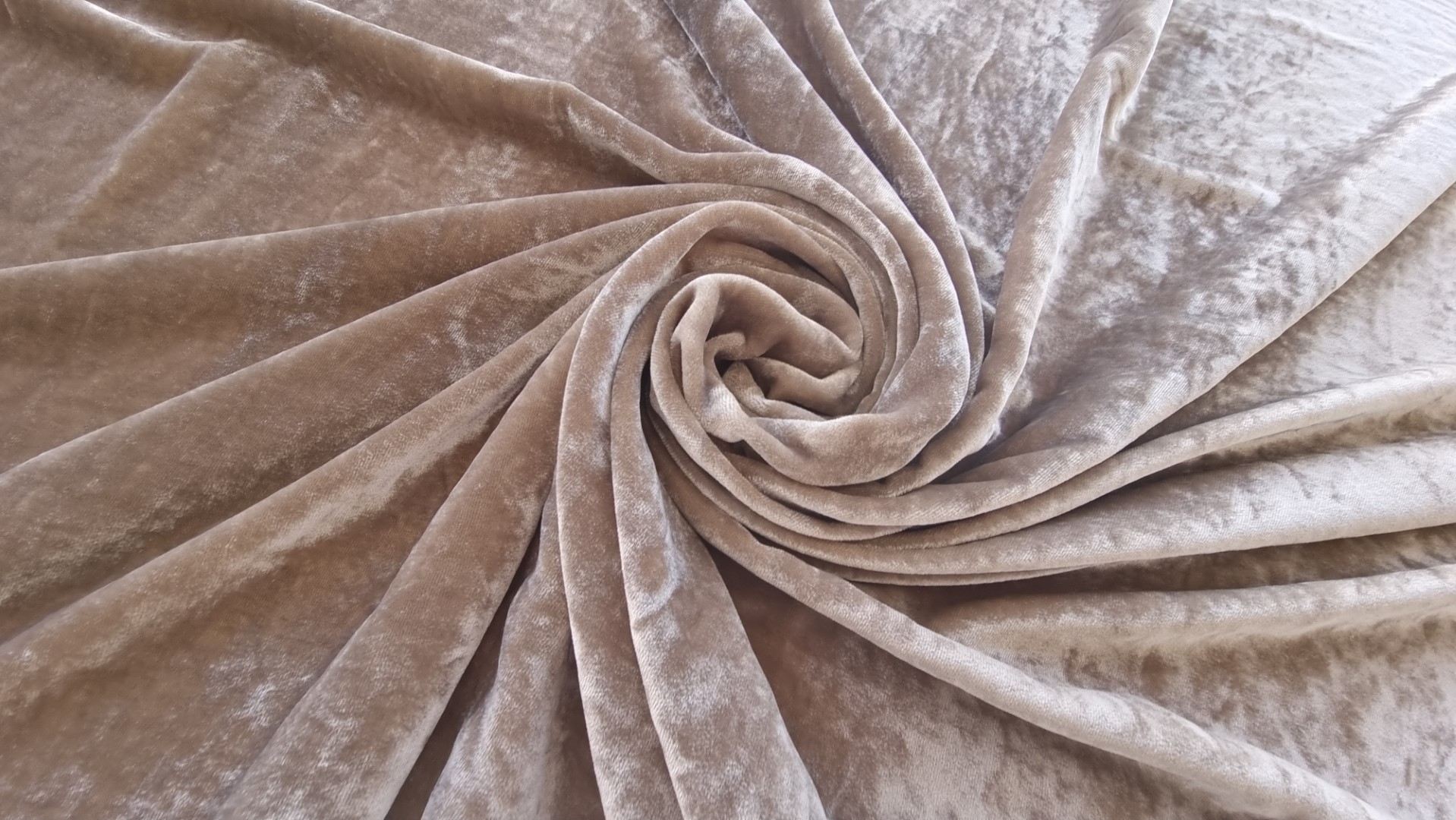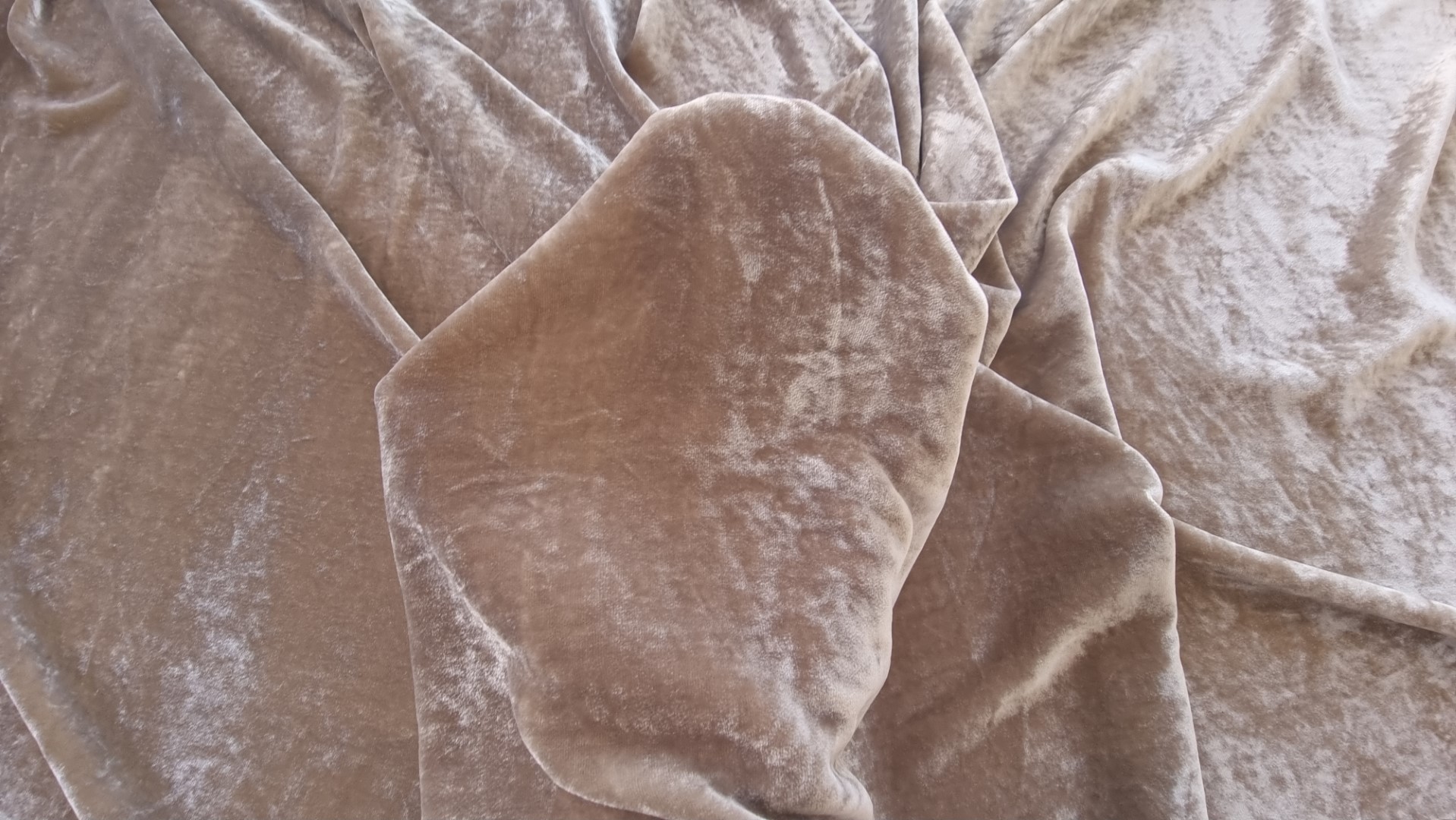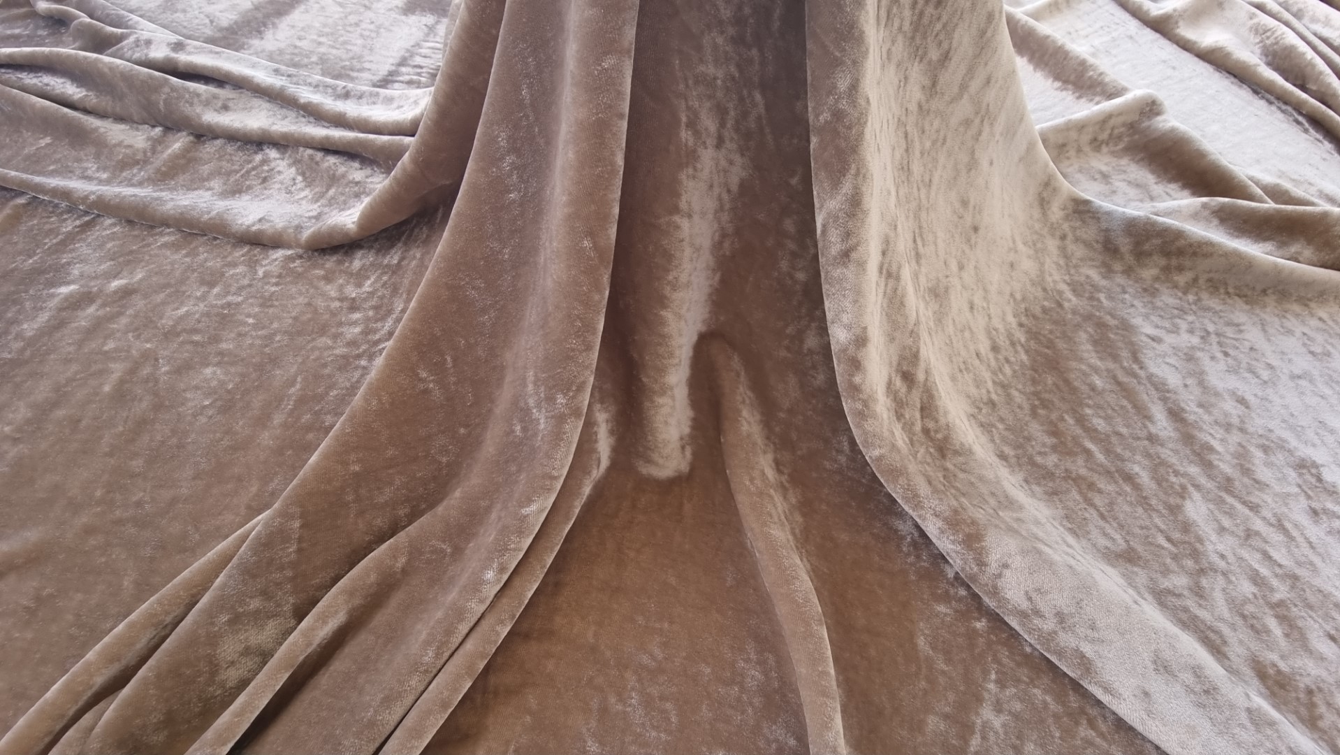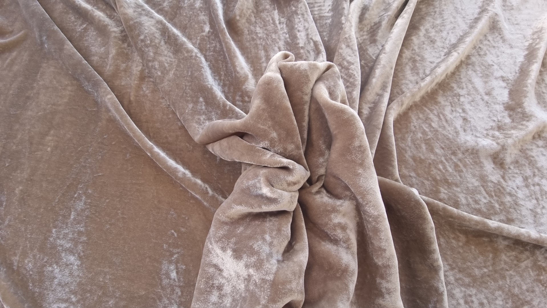 Catifea cu matase naturala si vascoza caffe latte, fara elastan, cu fir scurt si cadere usoara.