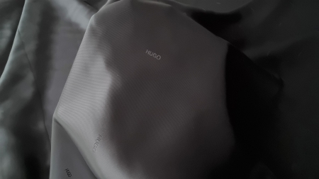 Captuseala neagra din vascoza brand imprimat BOSS8395, opaca, fara elastan si placuta la atingere.