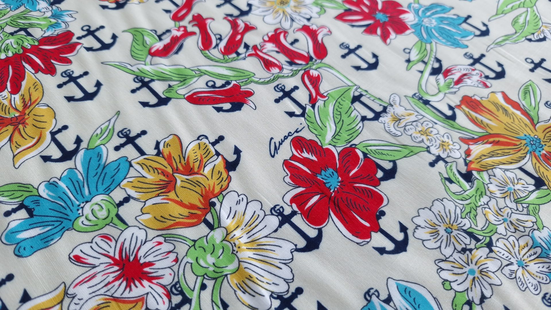 Tesatura fina din vascoza imprimata cu logo GUC1540, model floral dispus pe intreaga suprafata, de inspiratie Gucci.
