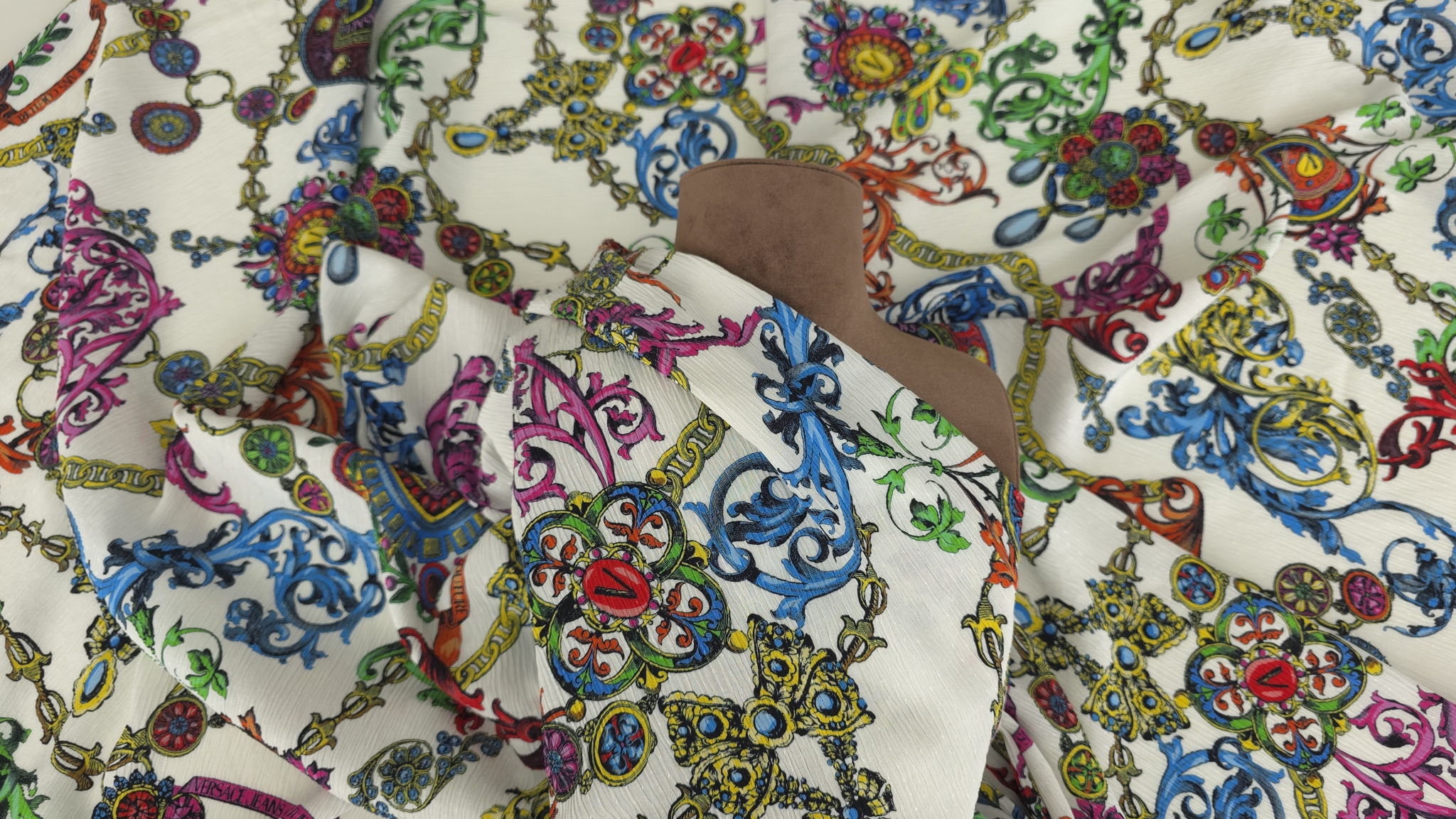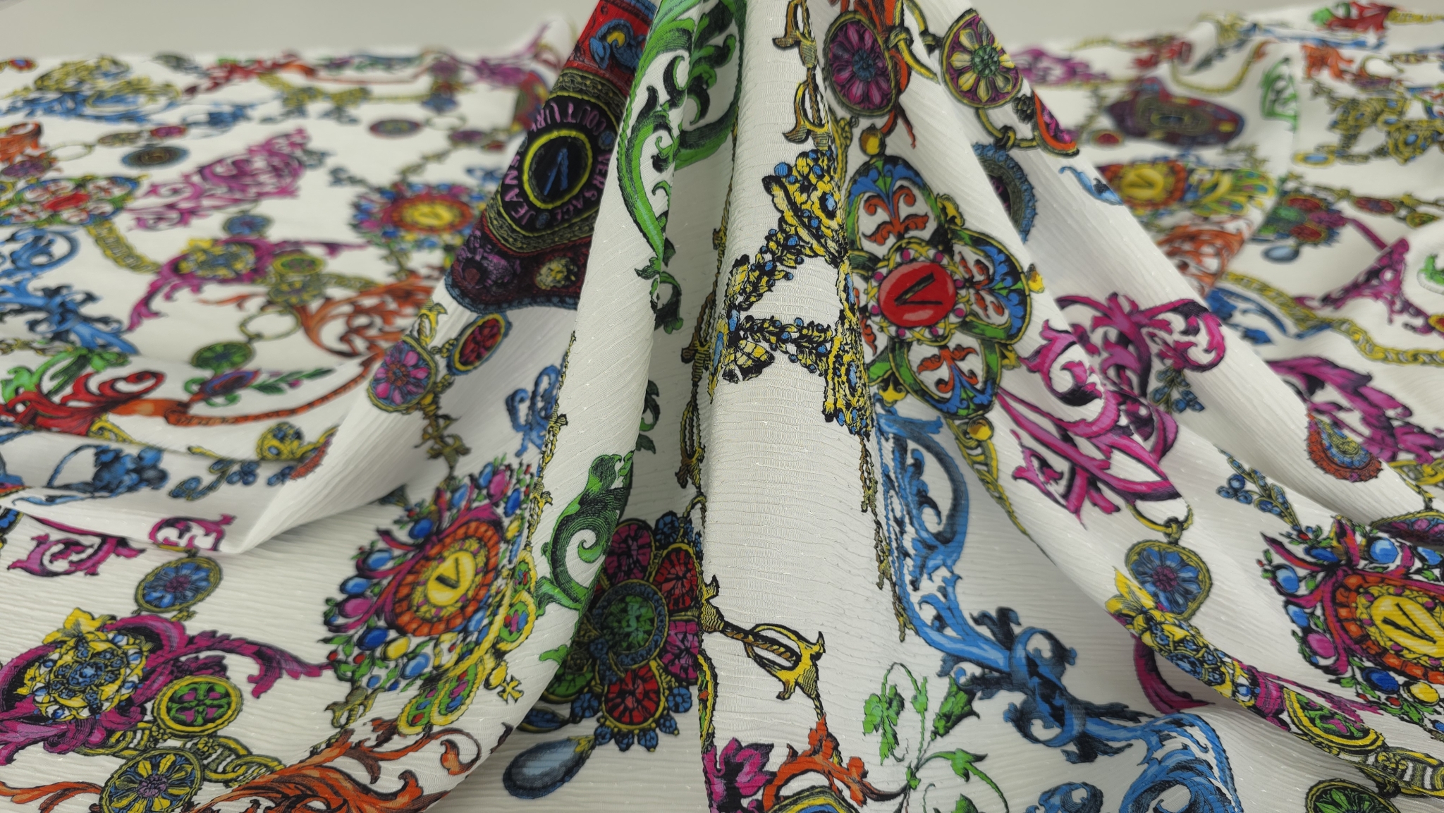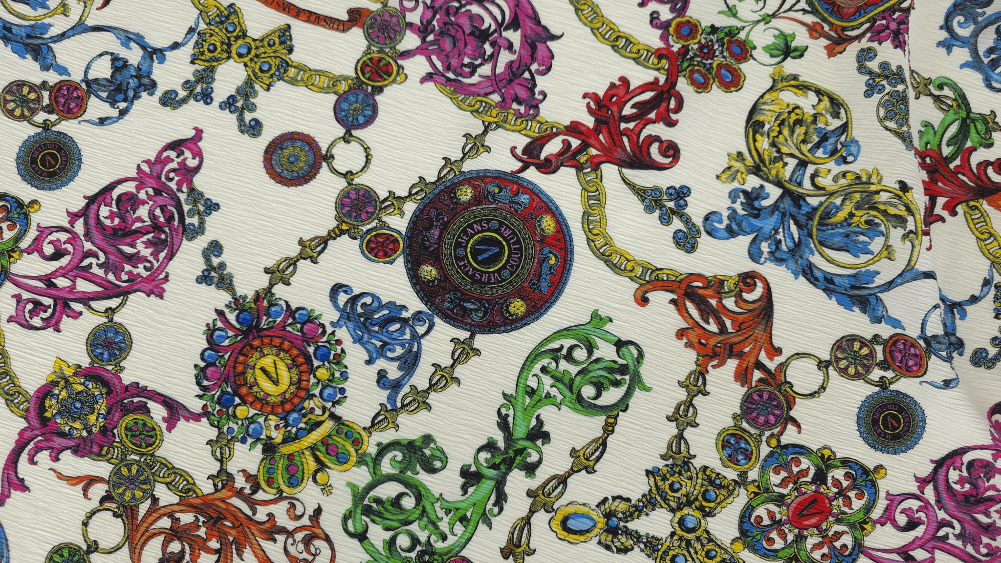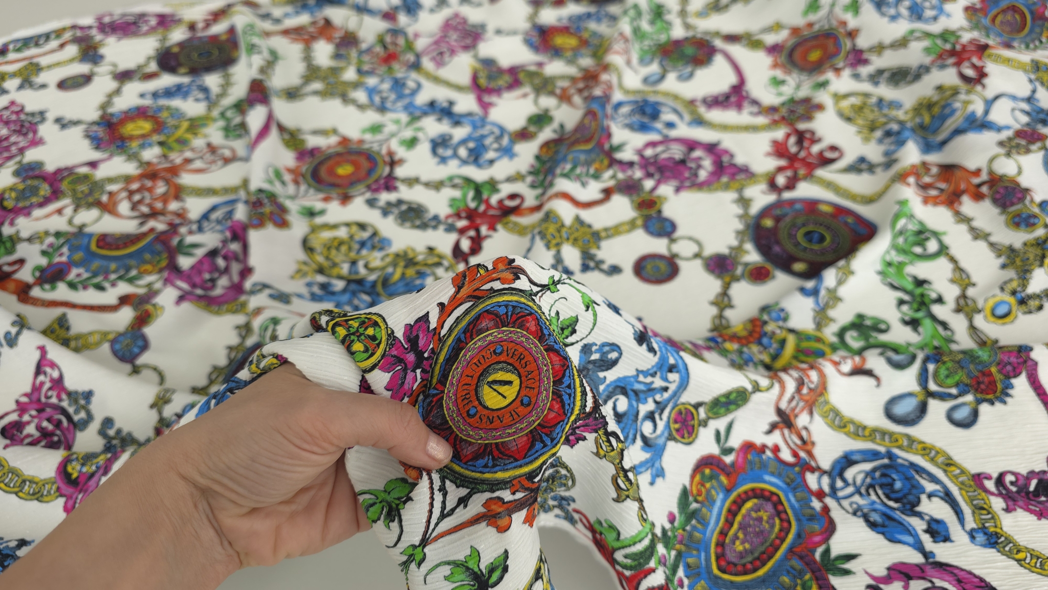 Vâscoză creponată multicolor cu imprimeu baroc este un material de designer V.J.C, cu volute, medalioane și lanțuri decorative distribuite uniform pe toată suprafața, într-o paletă vibrantă.