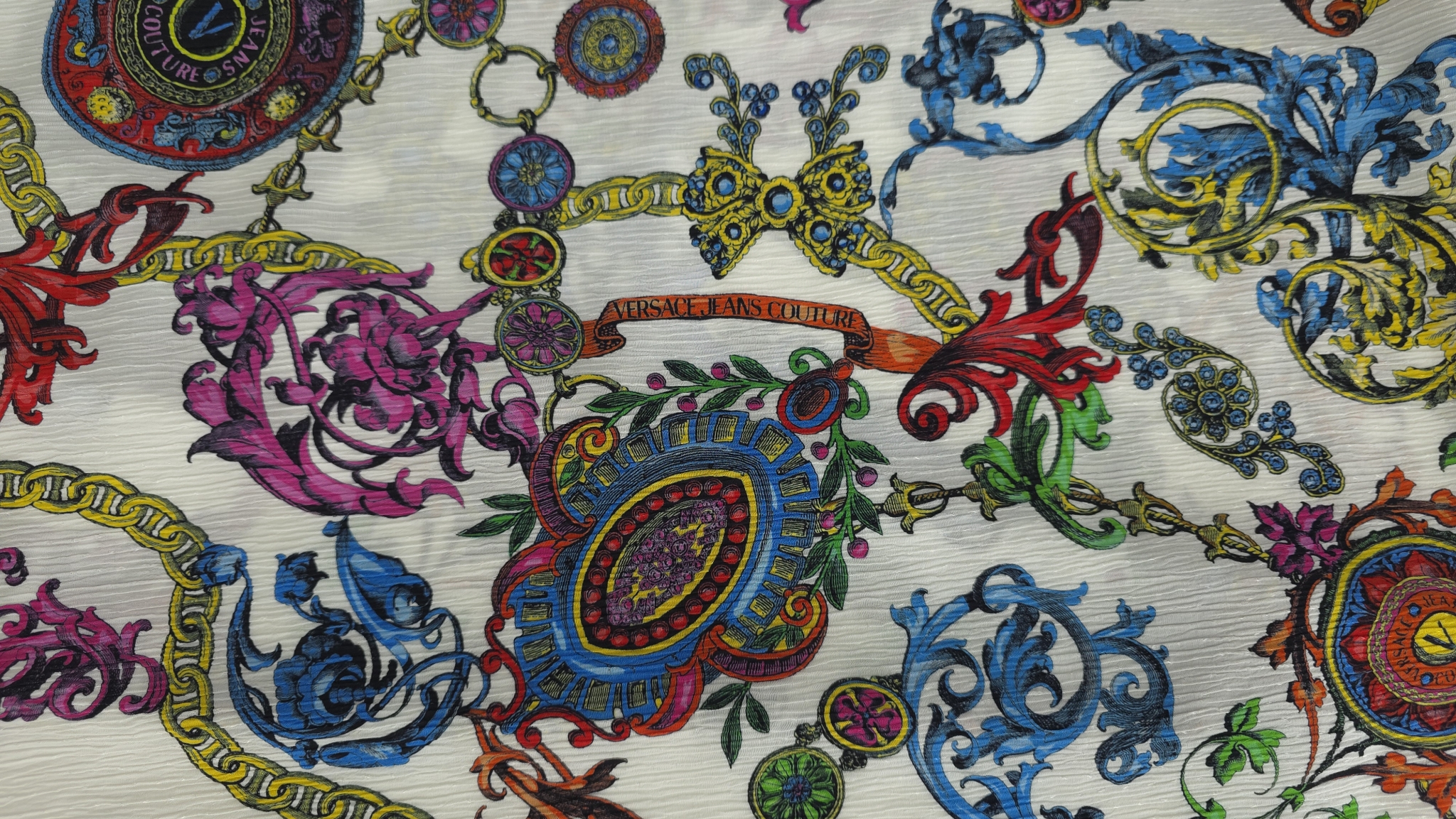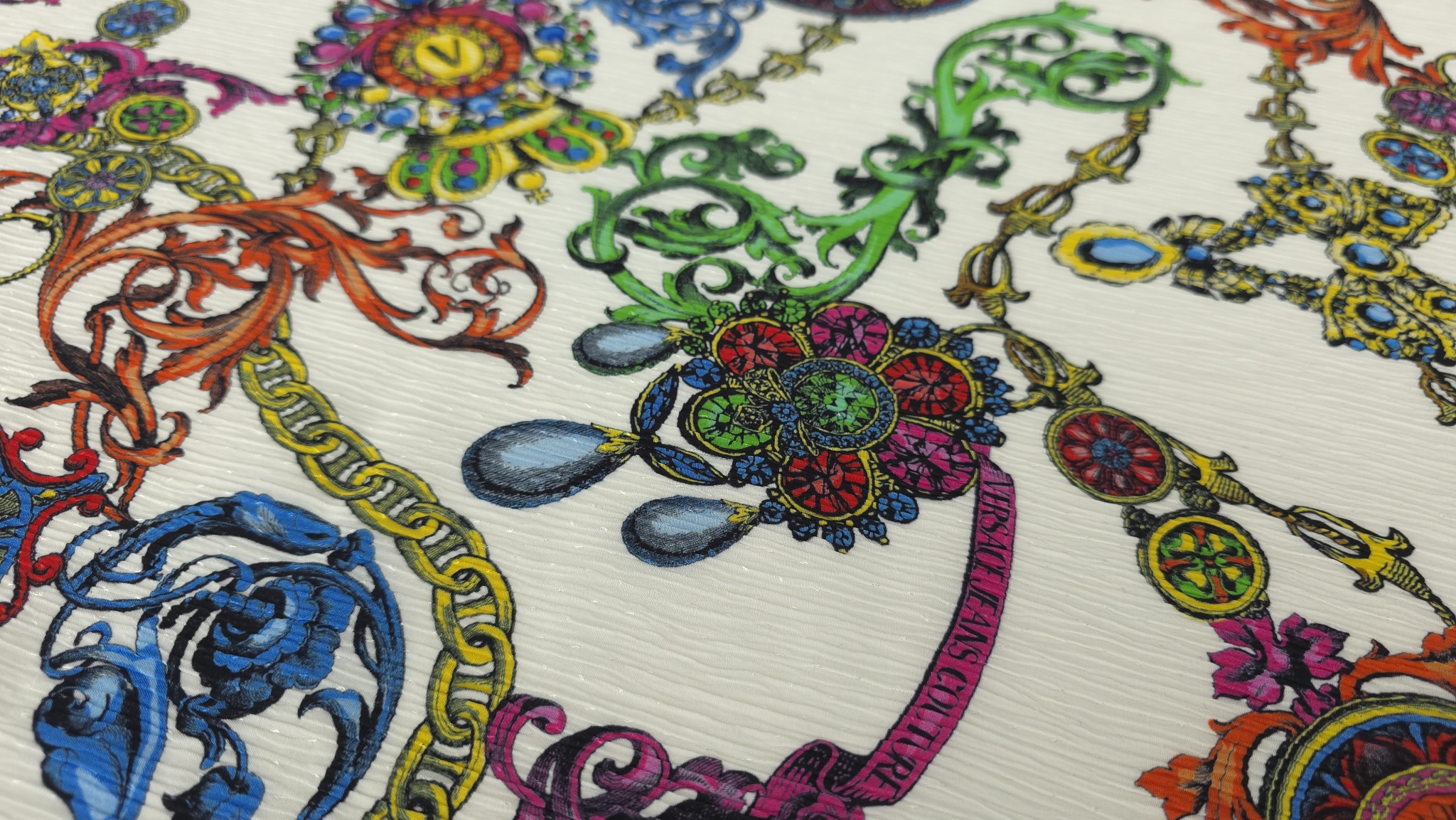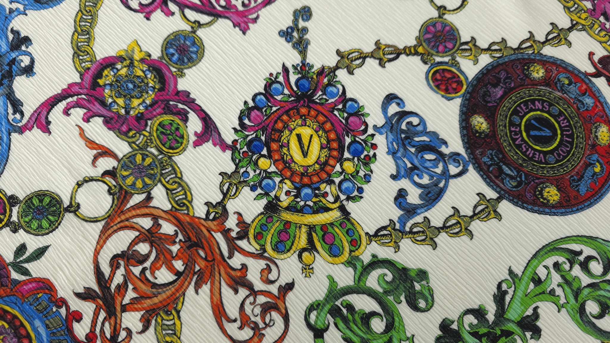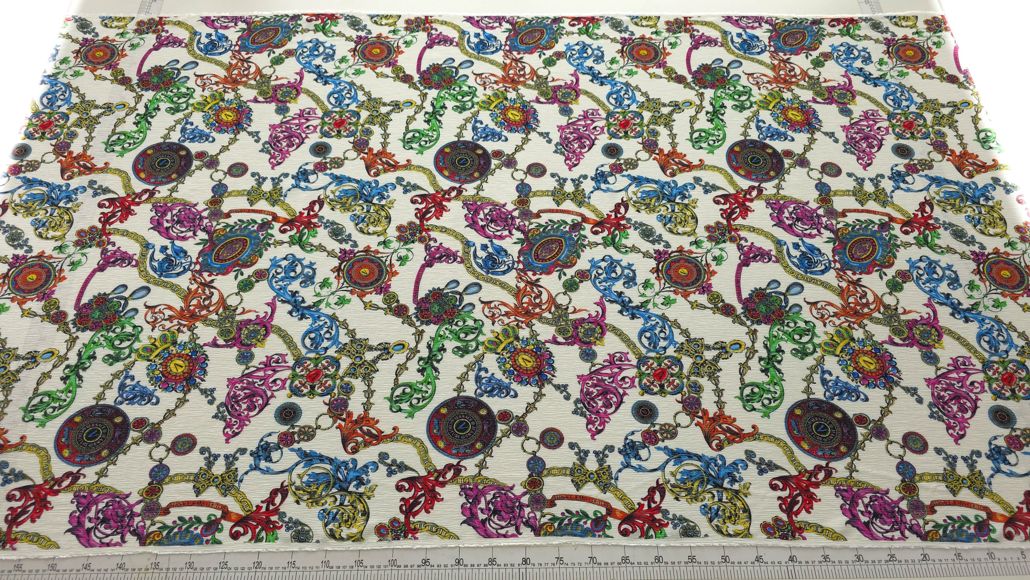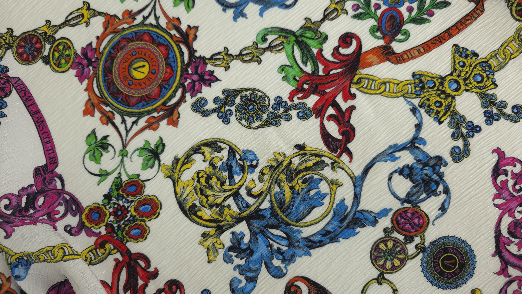 Vâscoză creponată multicolor cu imprimeu baroc este un material de designer V.J.C, cu volute, medalioane și lanțuri decorative distribuite uniform pe toată suprafața, într-o paletă vibrantă.