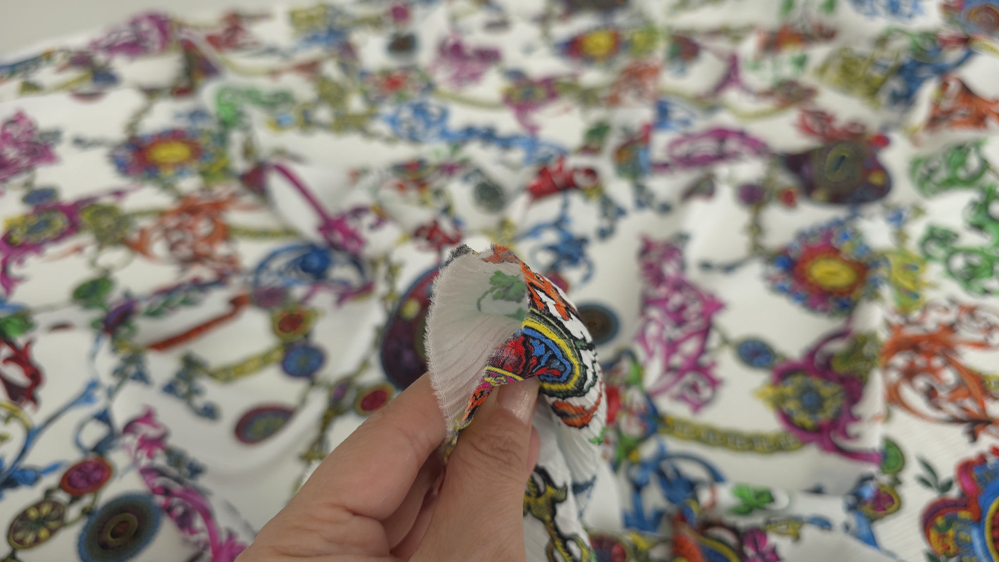 Descriere detaliată – Vâscoză creponată multicolor cu imprimeu baroc
