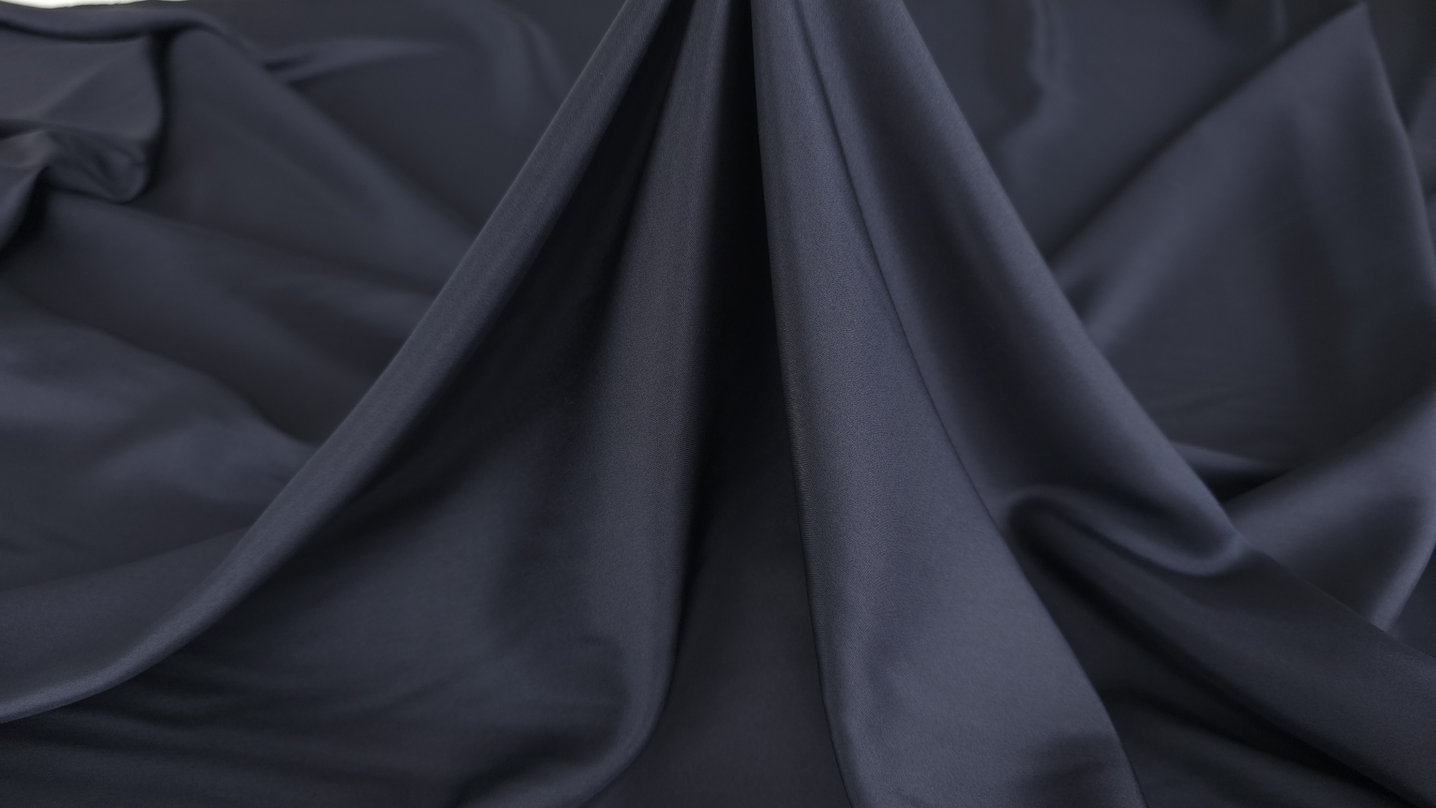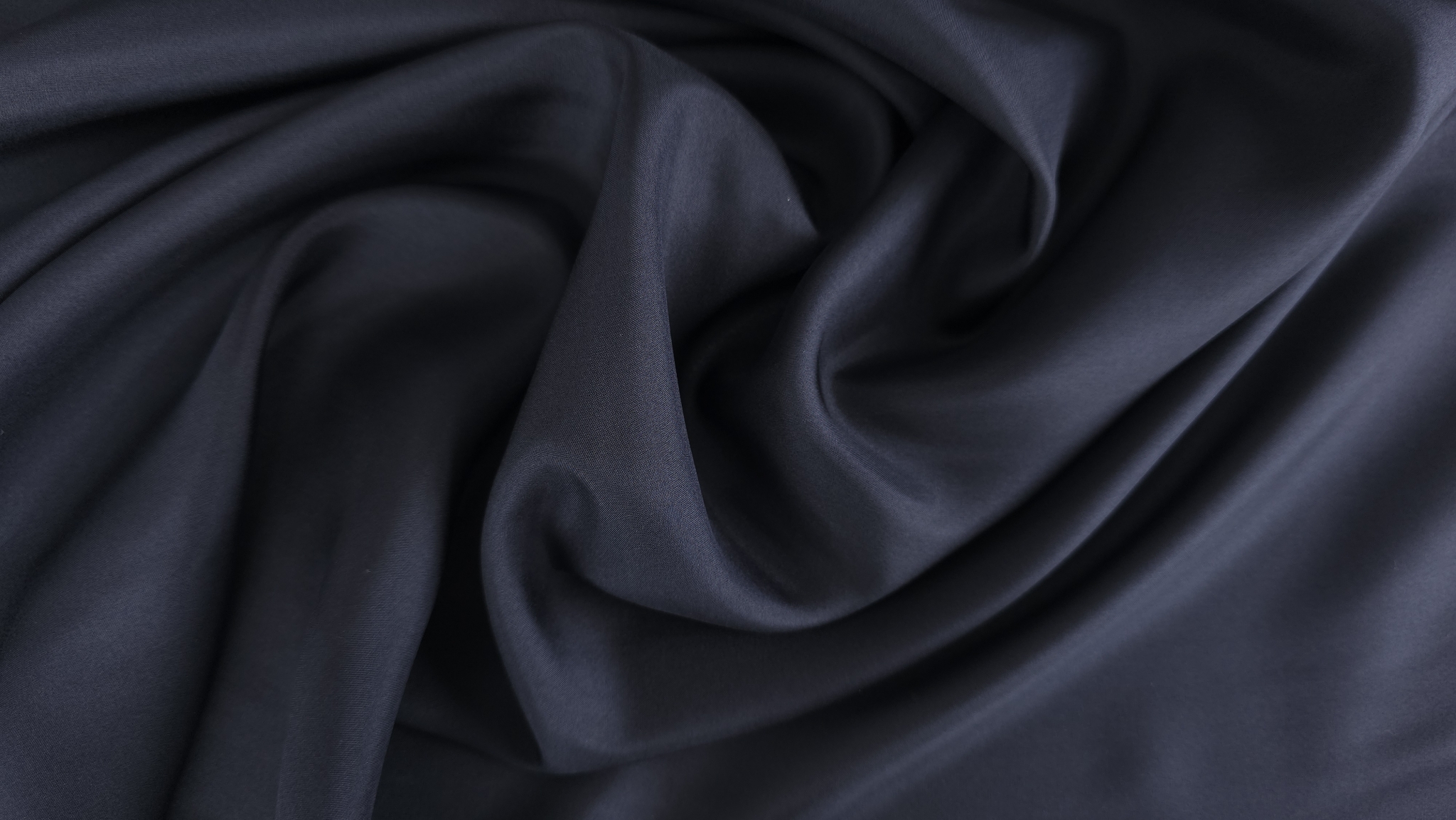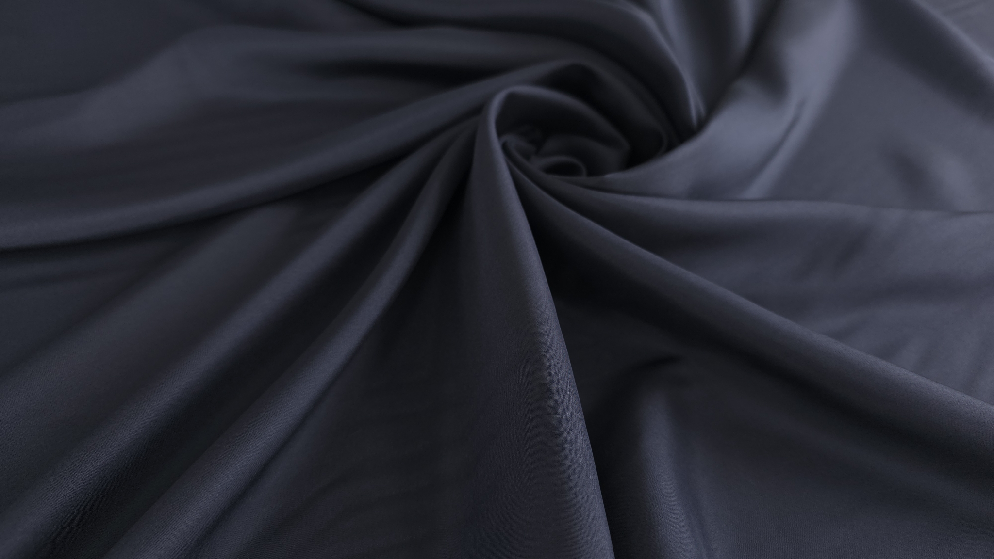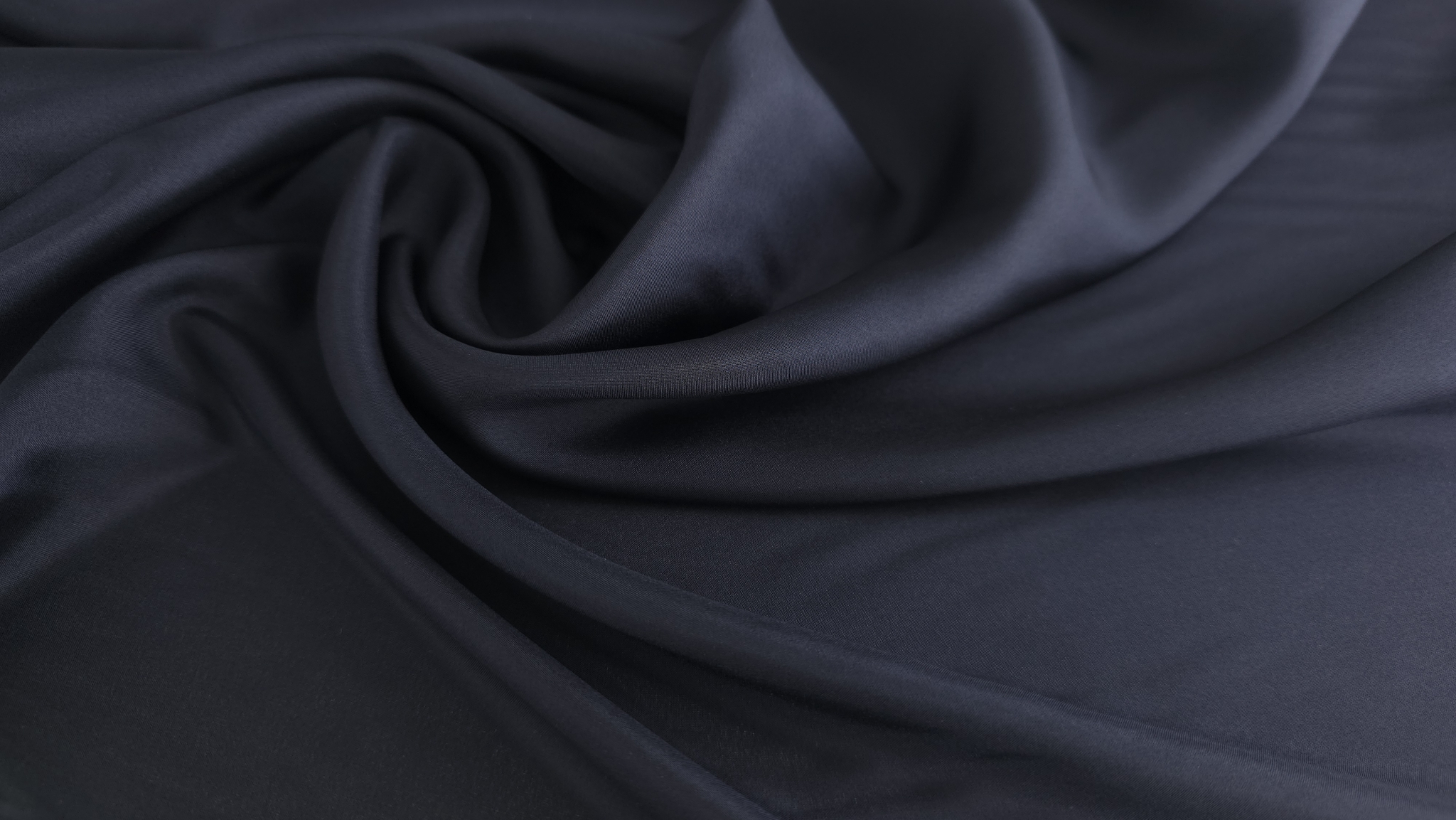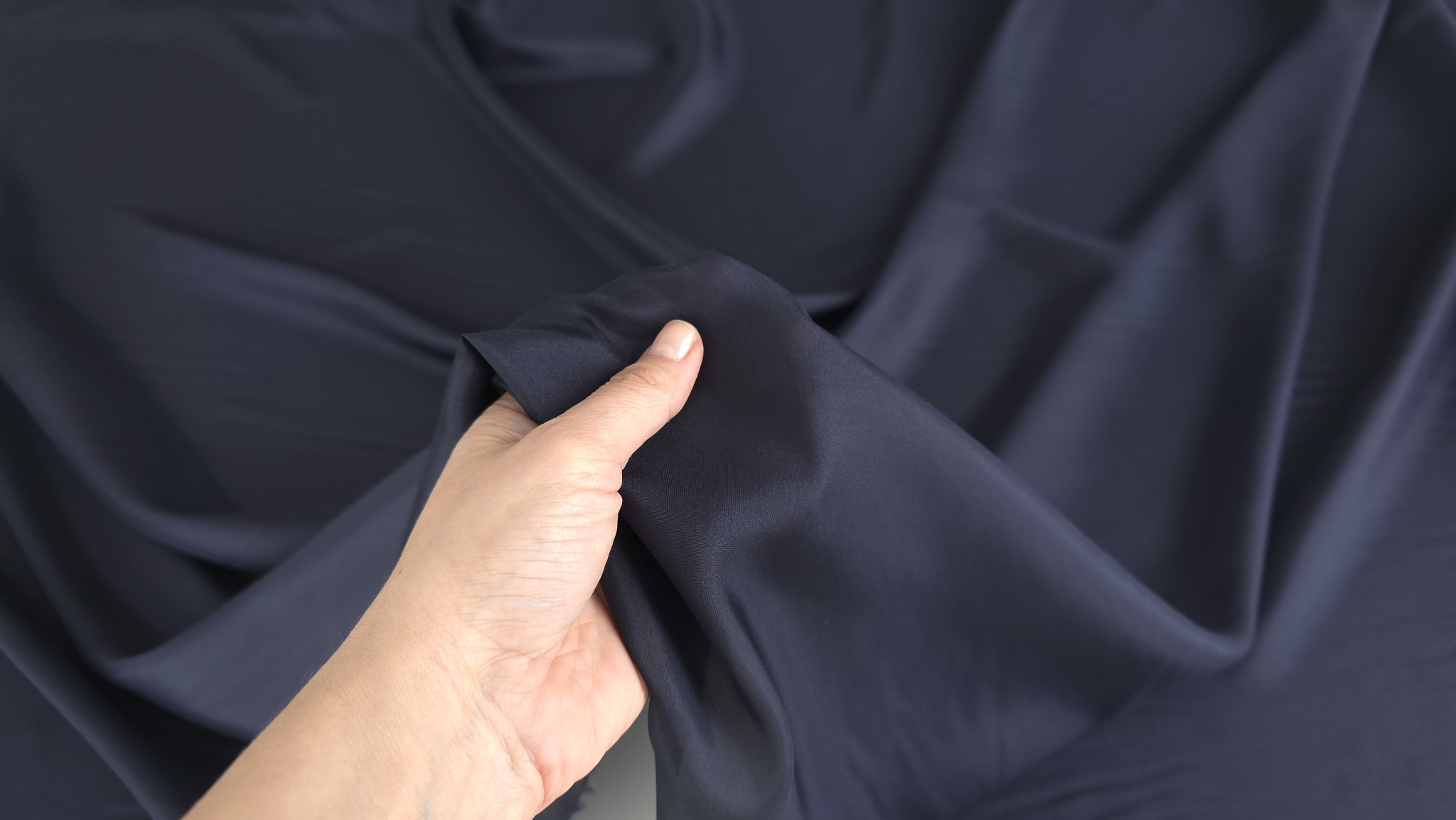 Această țesătură din mătase naturală bleumarin cu cădere fluidă are o structură dublu strat ce oferă densitate vizibil mai mare și rezistență superioară. Materialul păstrează totuși o ușoară transparență, suficientă pentru a crea efecte de profunzime atunci când este suprapus.