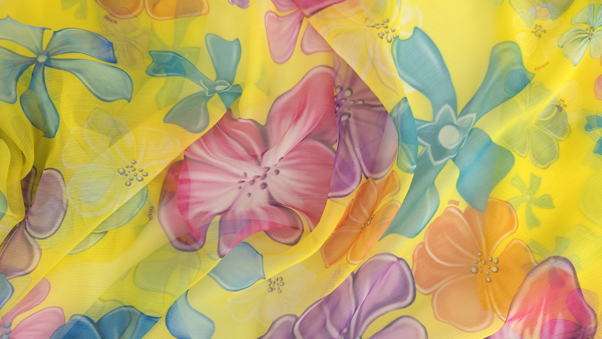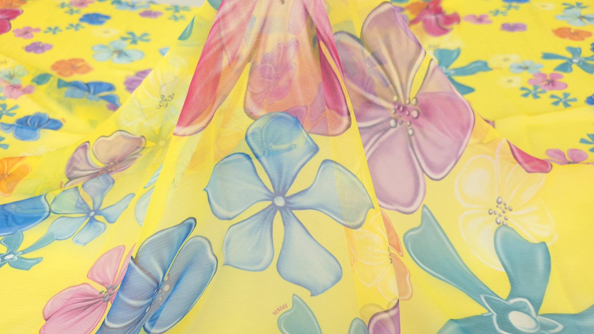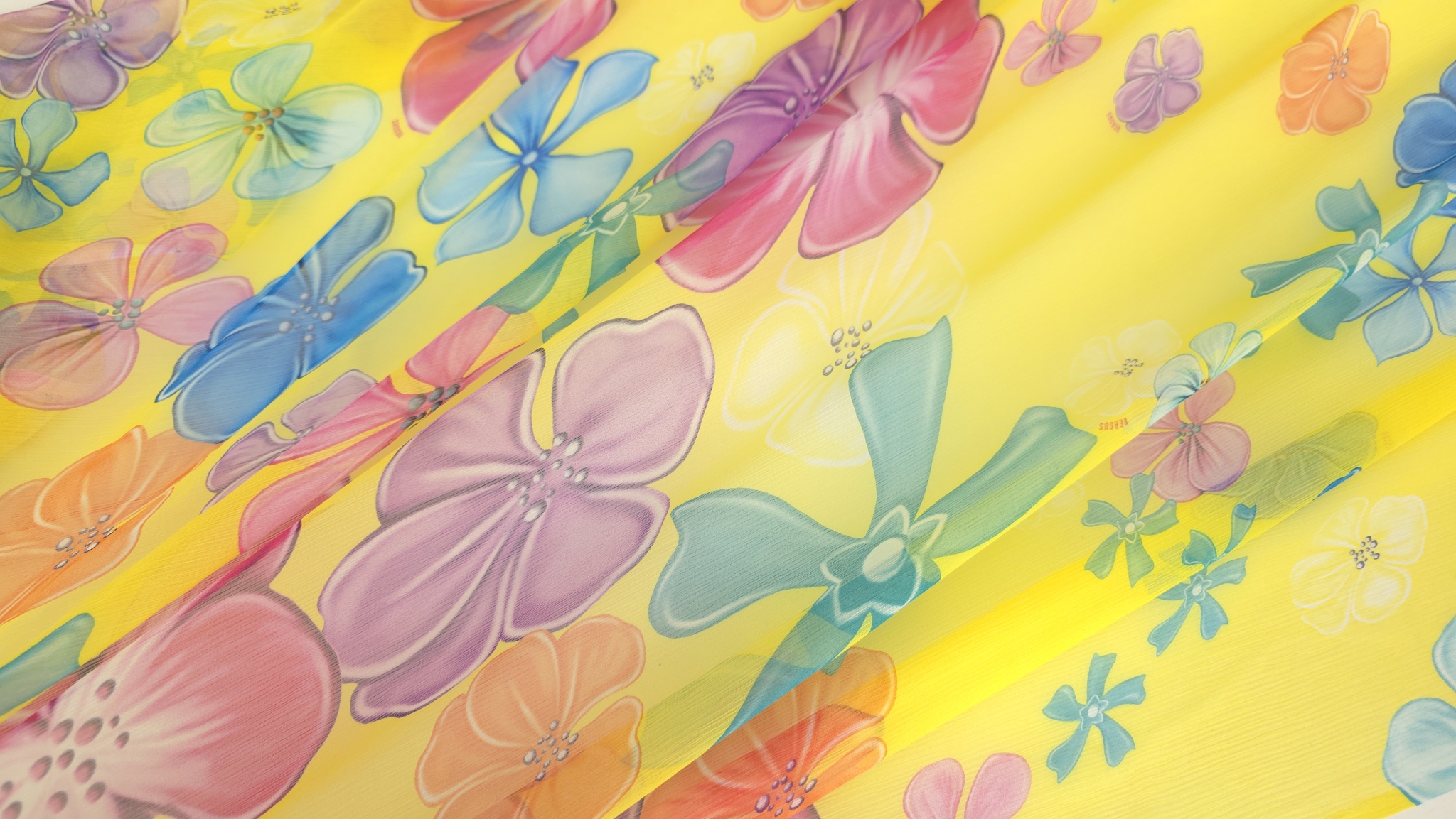 Voal creponat din mătase naturală floral multicolor este un material de designer V.J.C, cu flori mari stilizate în roz, mov, bleu, turcoaz, portocaliu, verde și alb. Aceste flori sunt dispuse pe un fond galben intens.