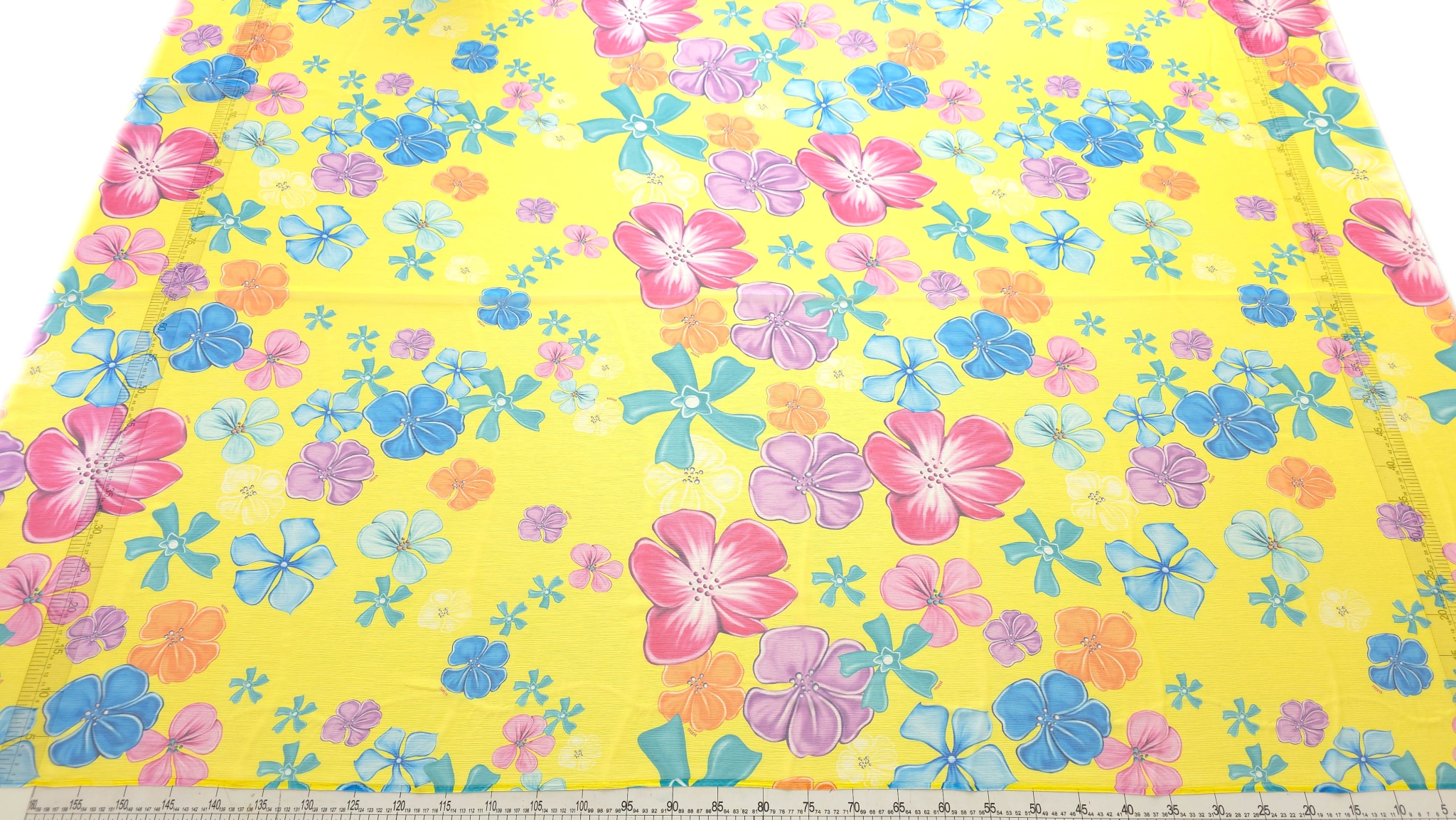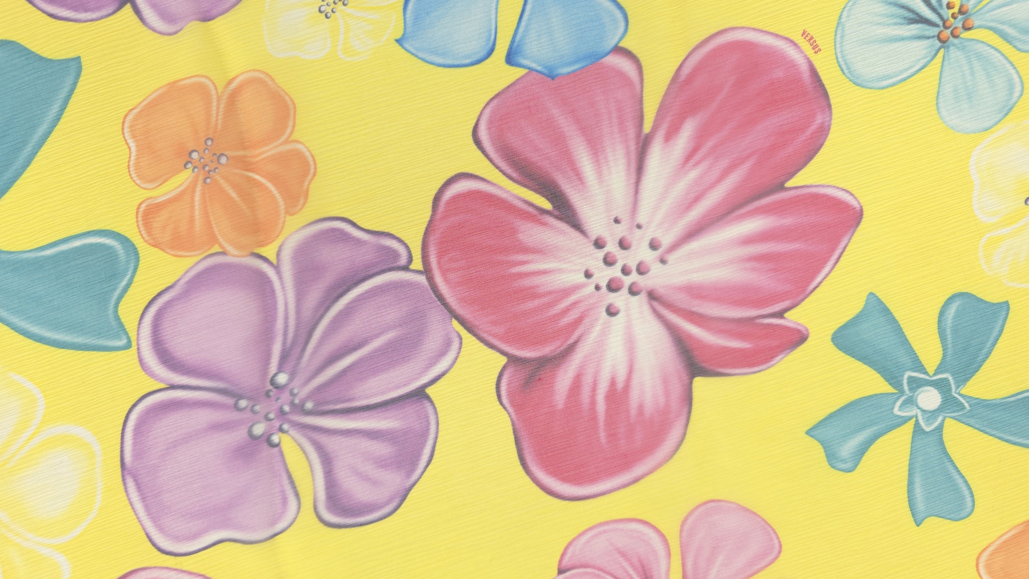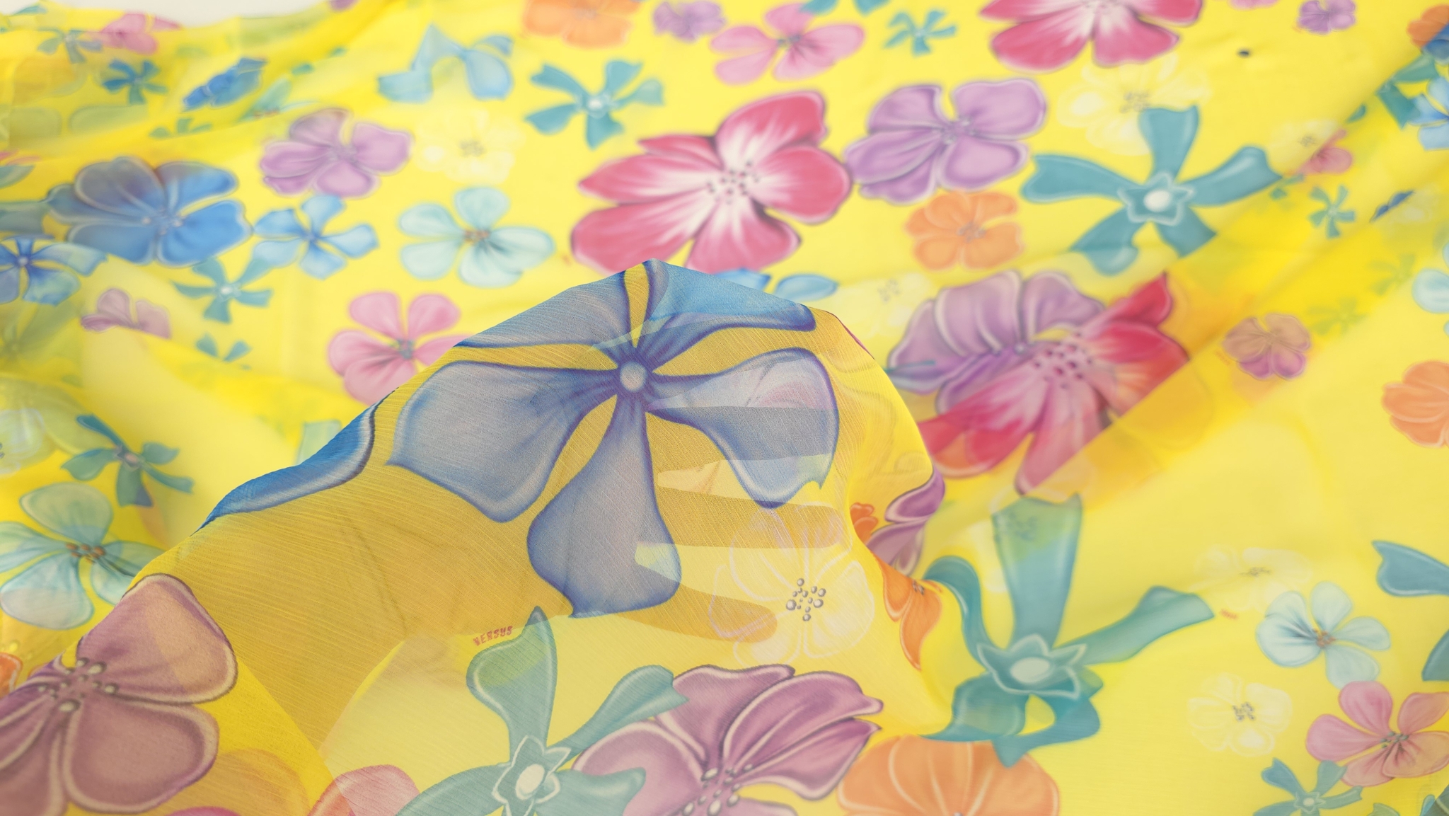 Voal creponat din mătase naturală floral multicolor este un material de designer V.J.C, cu flori mari stilizate în roz, mov, bleu, turcoaz, portocaliu, verde și alb. Aceste flori sunt dispuse pe un fond galben intens.