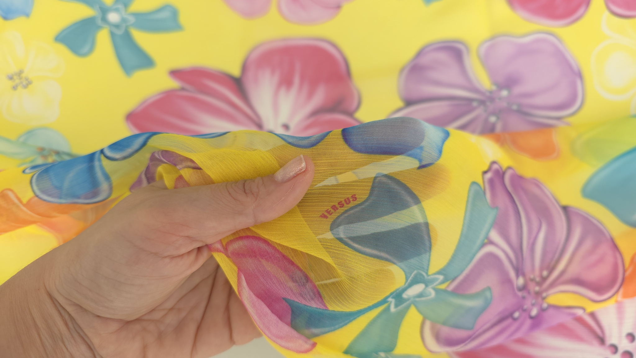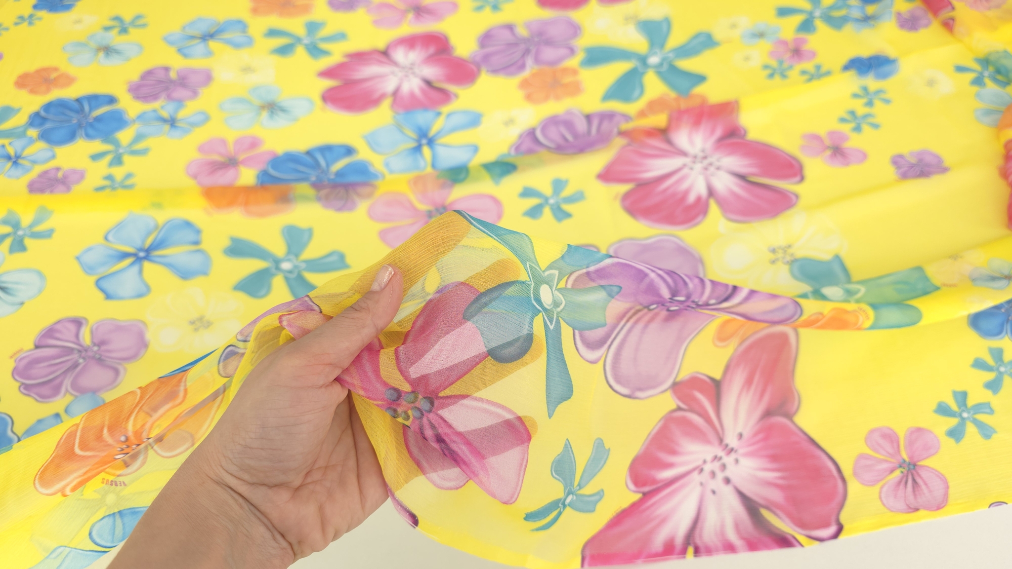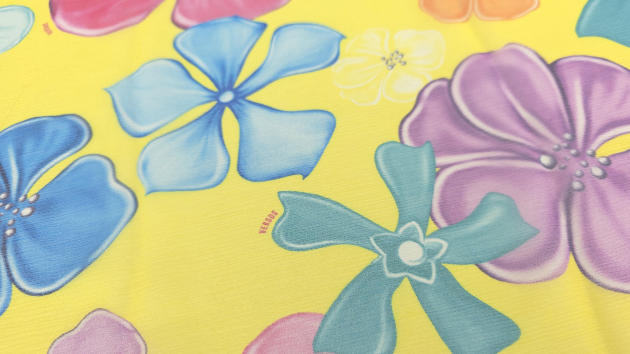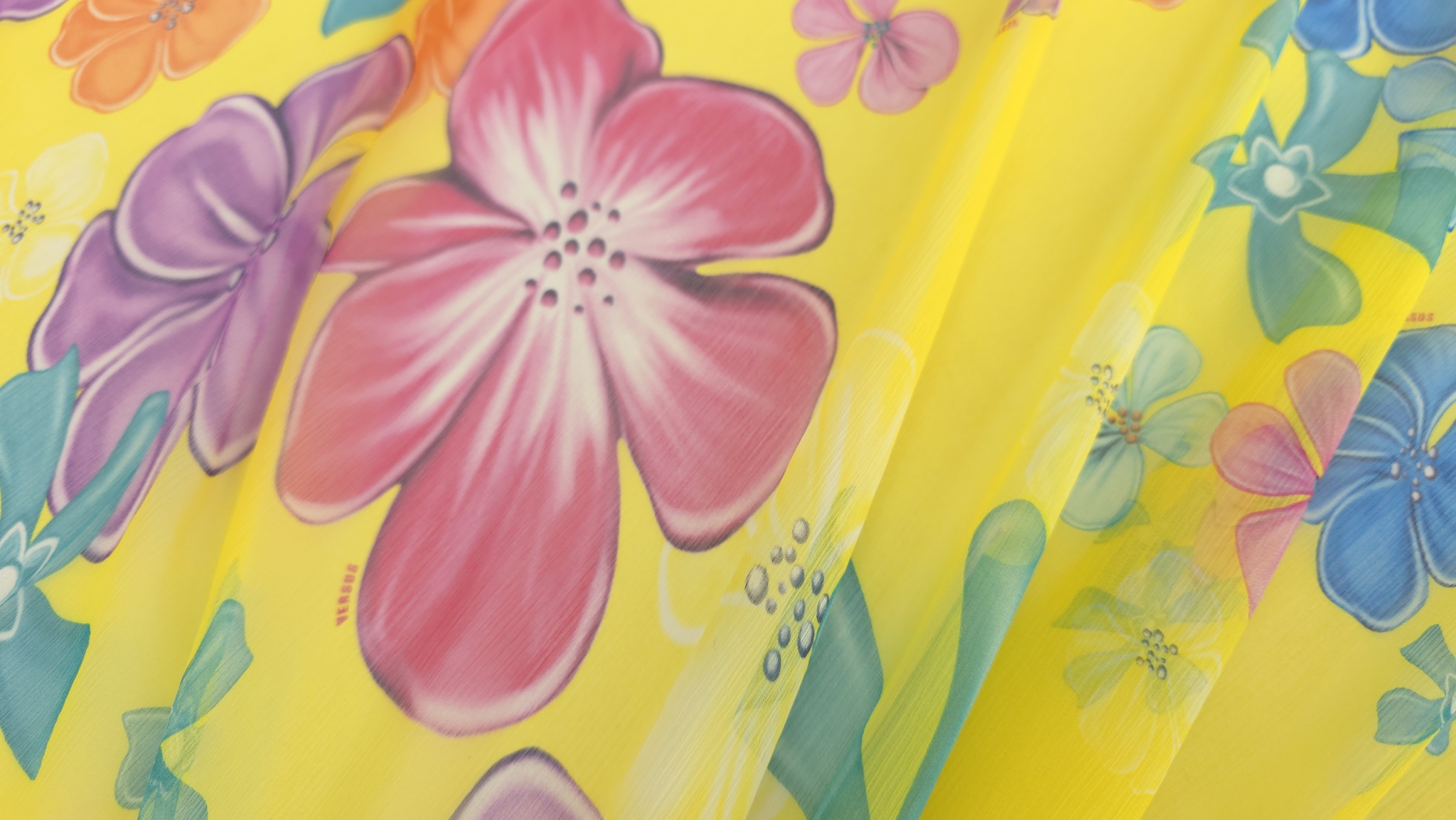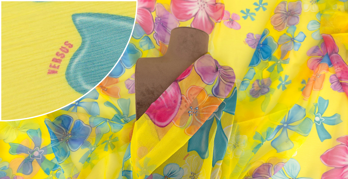 Florile mari, stilizate în tonuri de roz și turcoaz, creează un contrast electric pe fundalul galben saturat al acestui voal din mătase naturală cu flori pe galben. Distribuția echilibrată a motivelor sub semnătura V.J.C elimină riscul unui aspect aglomerat, oferind în schimb o suprafață vibrantă ce poate susține atât croieli minimaliste, cât și piese vestimentare de tip statement.