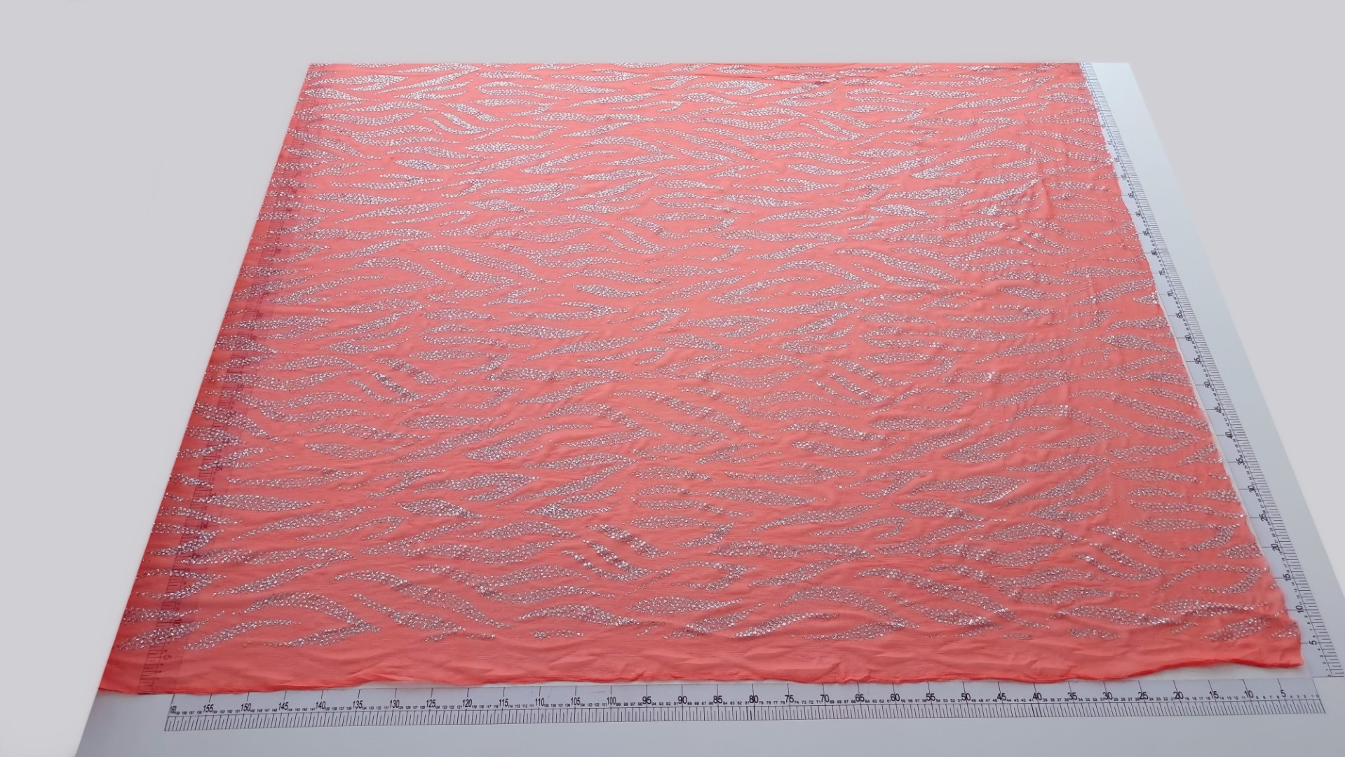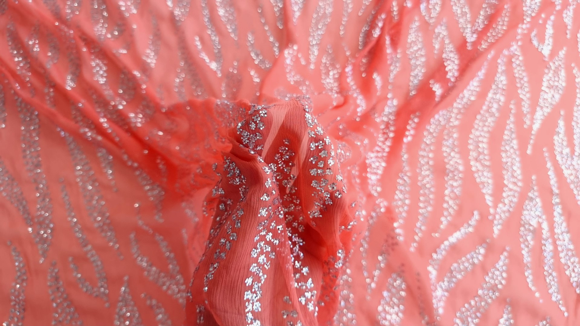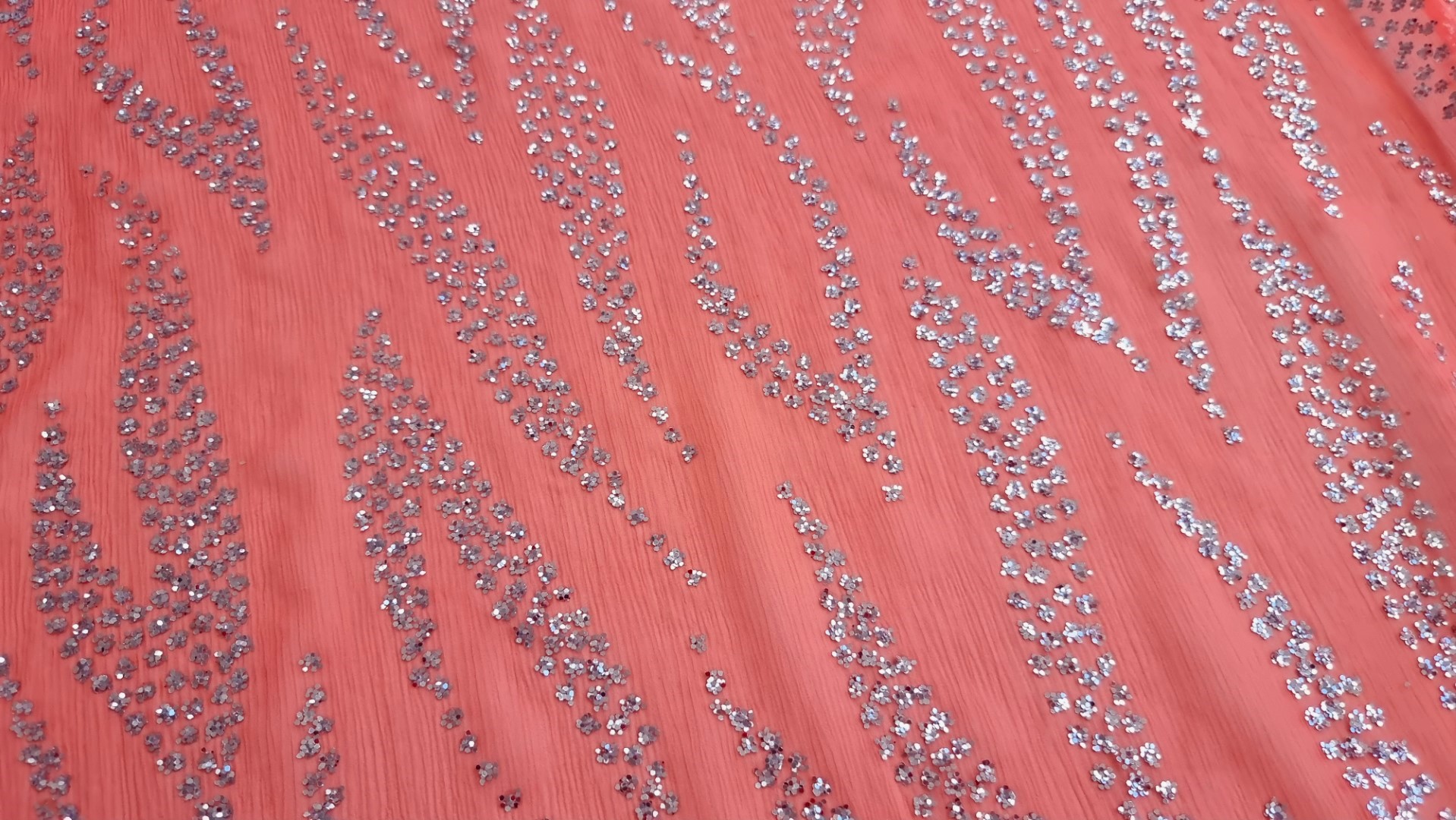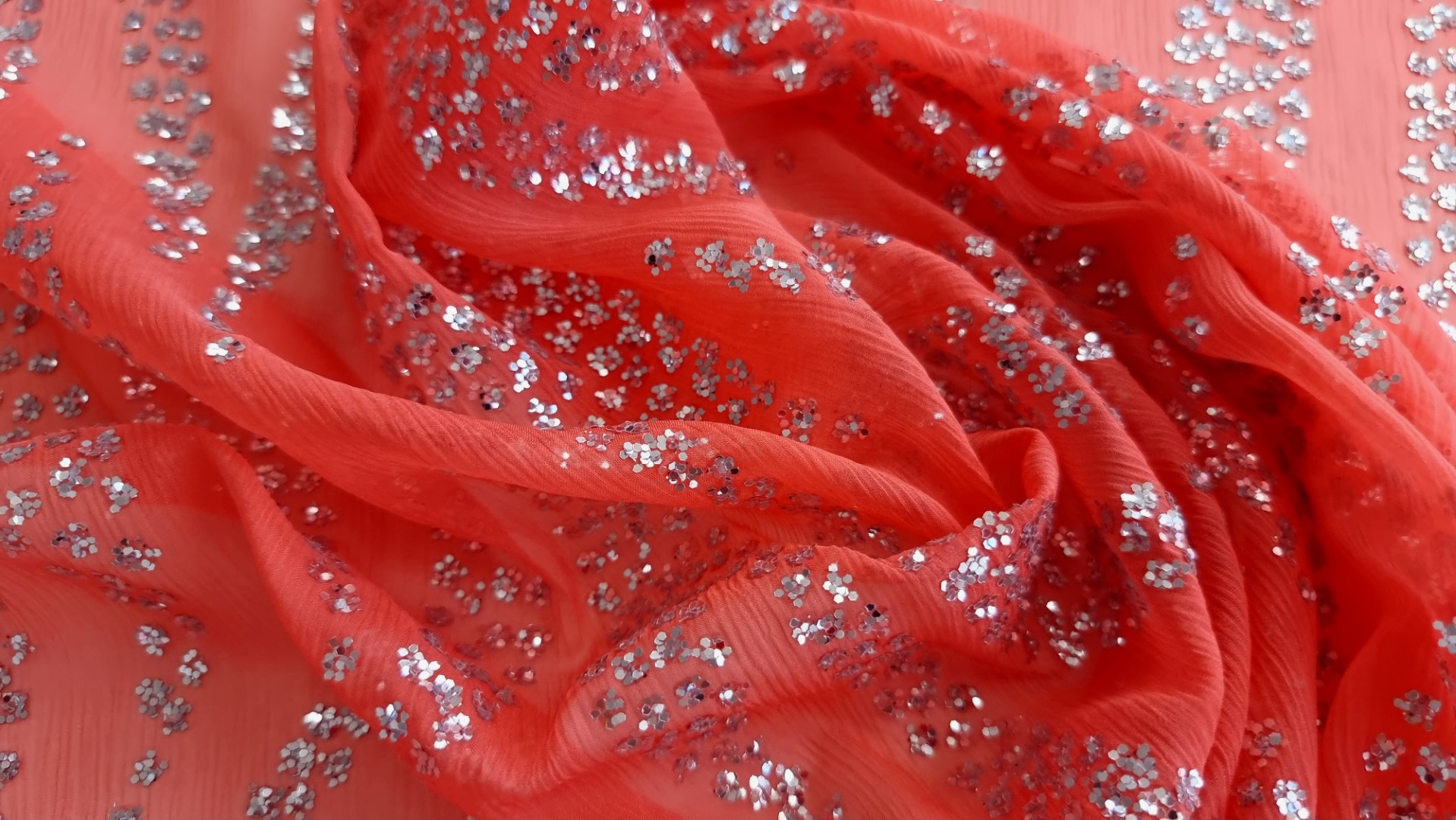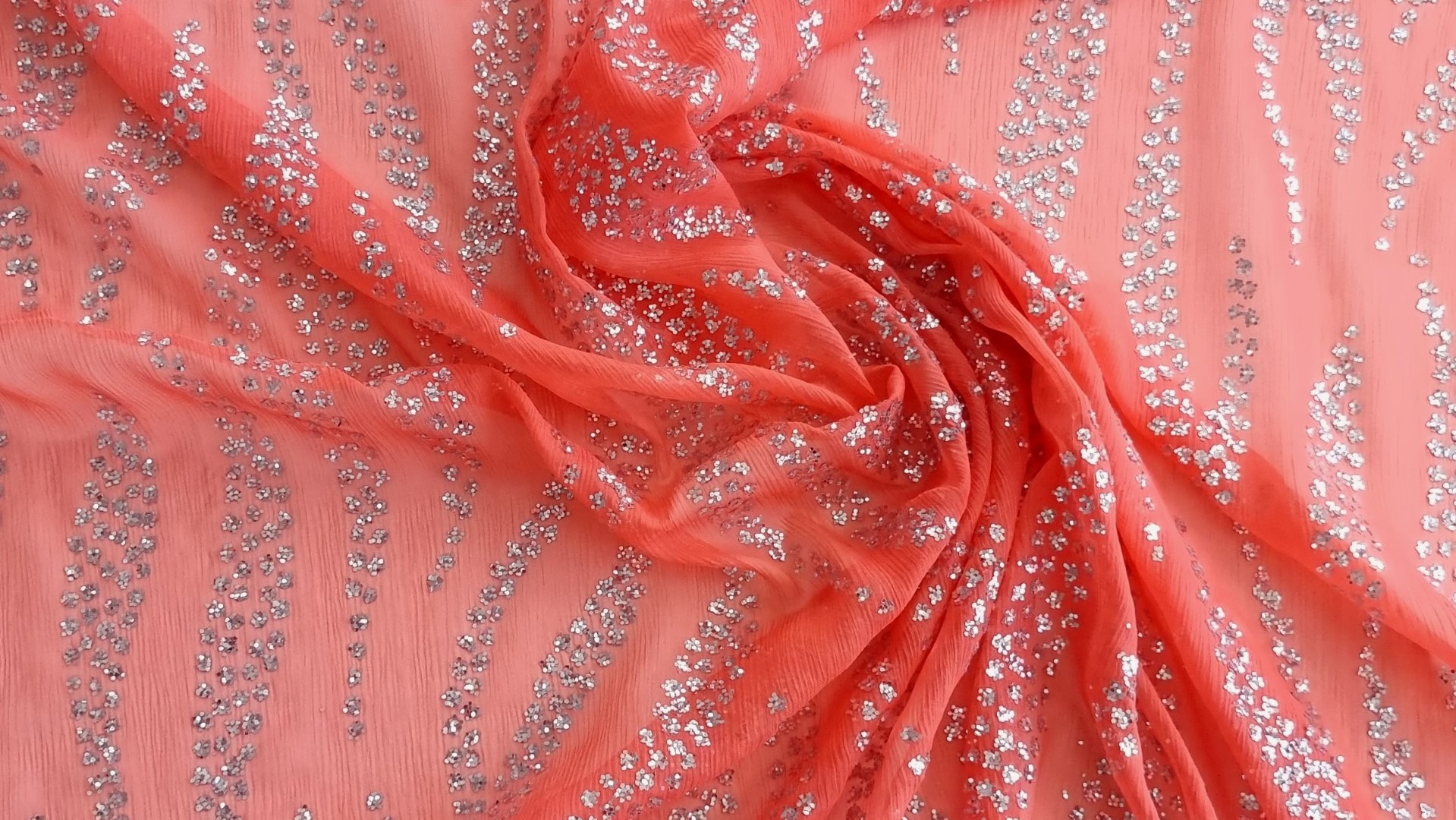 Voal creponat din matase naturala Silver Glitter, fara elastan, fin si delicat, cu o textura vaporoasa, cu aplicatii argintii stralucitoare, pentru un plus de efect, distribuite pe intreaga suprafata.