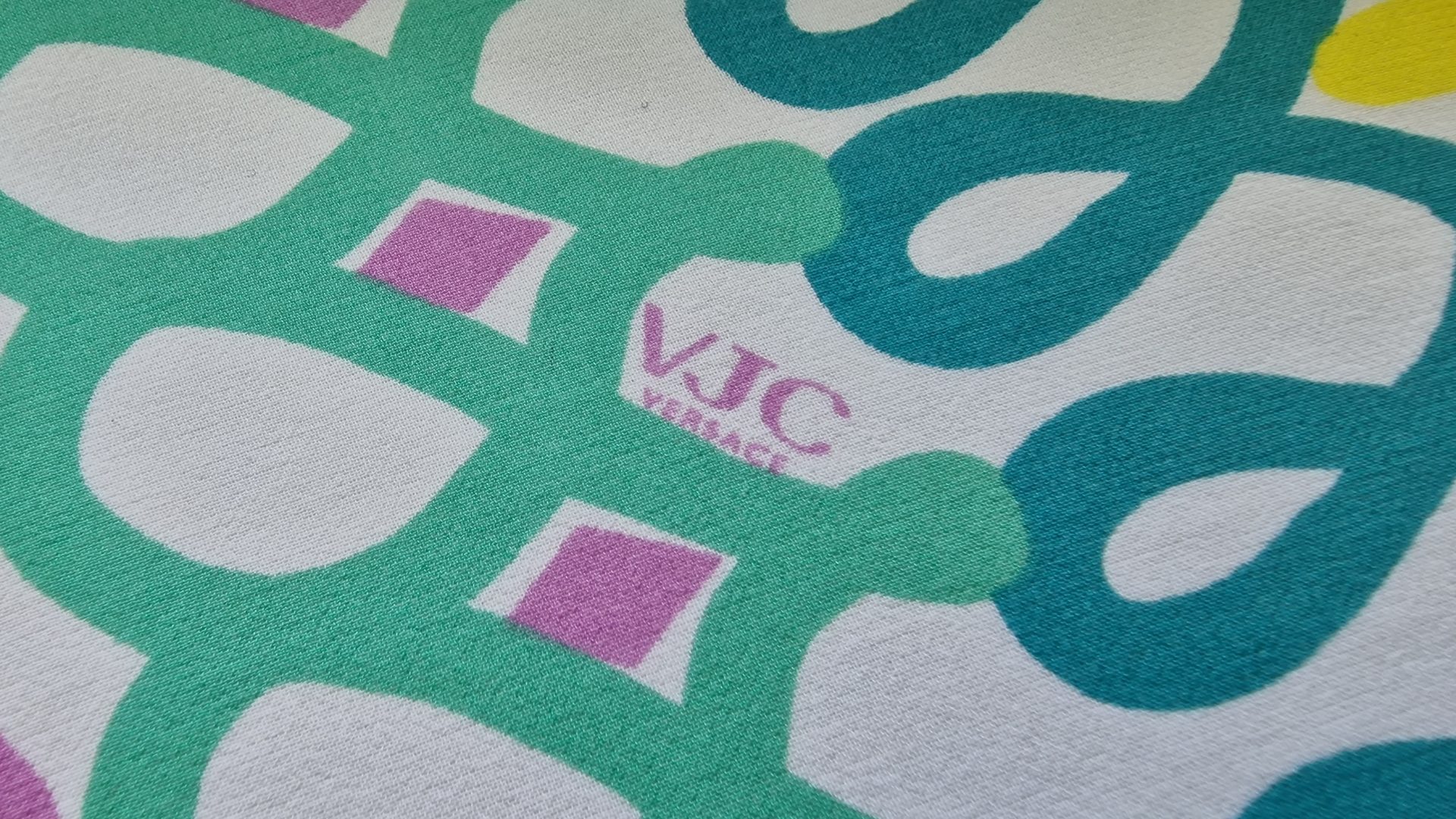 Voal Georgette din matase naturala Multicolor Chains VER1289, subtire si usor, vaporos, cu o cadere usoara, cu model multicolor distribuit pe intreaga suprafata, de inspiratie Versace.