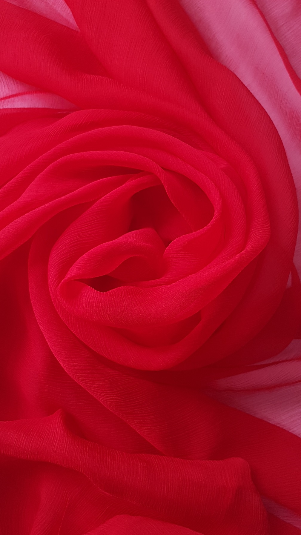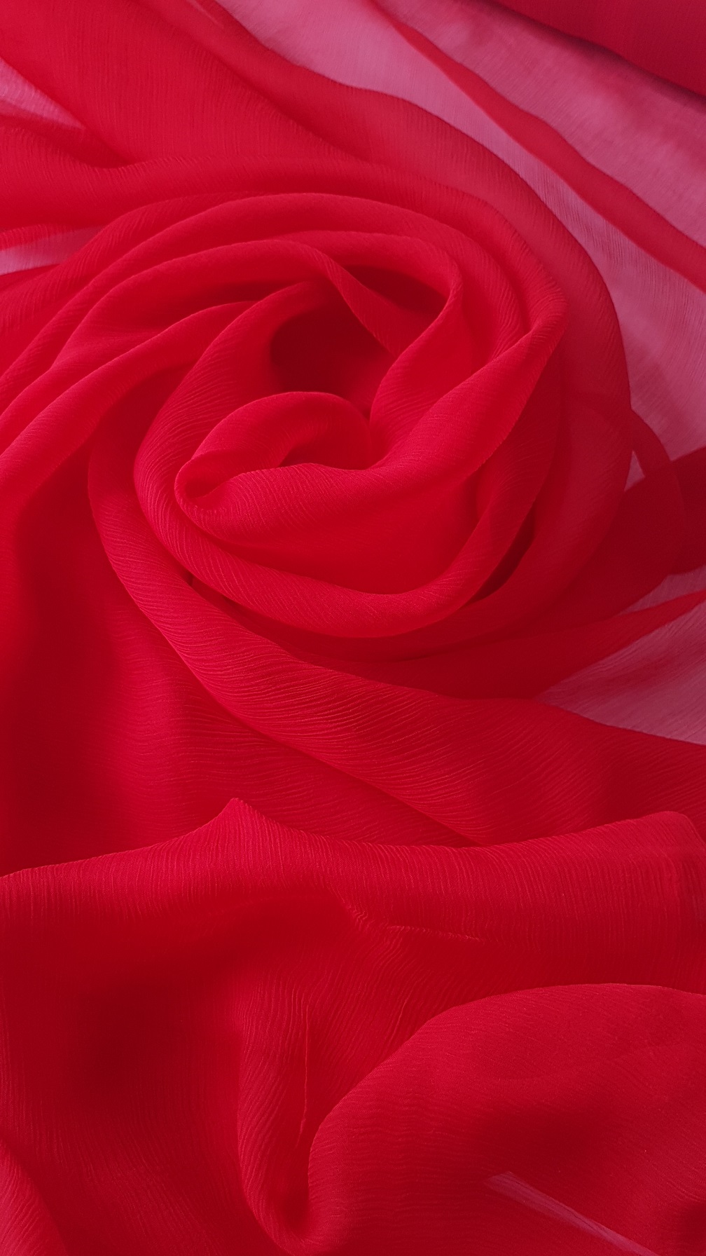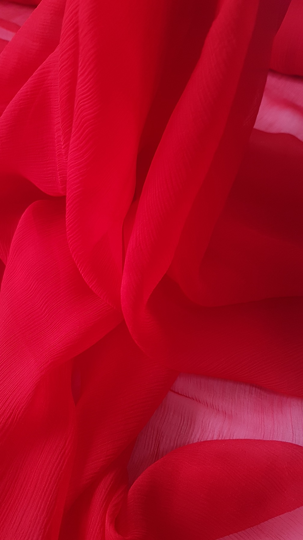 Voal creponat rosu intens Muselina din matase naturala, fin, subtire, foarte placut la atingere, pretabil pentru tinute lejere de vara, dar si pentru tinute de seara: rochii, fuste, bluze vaporoase si elegante.